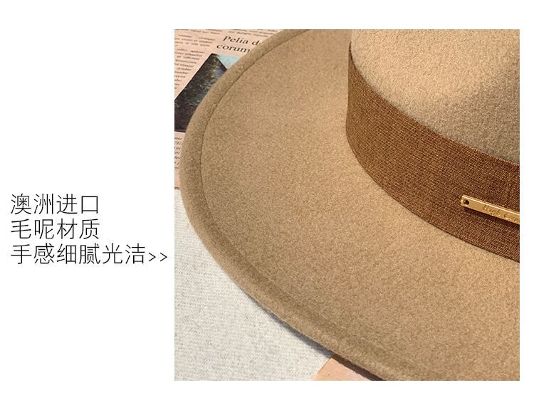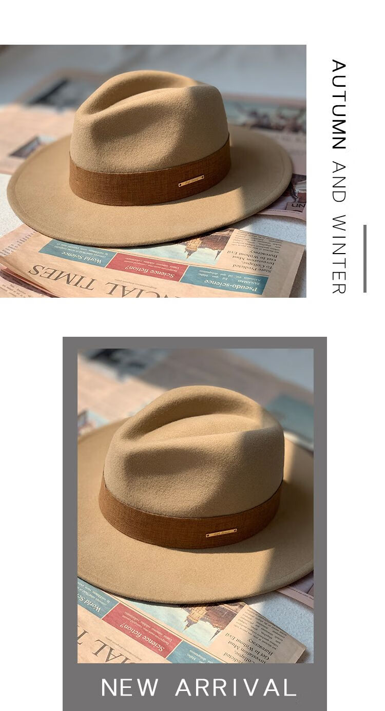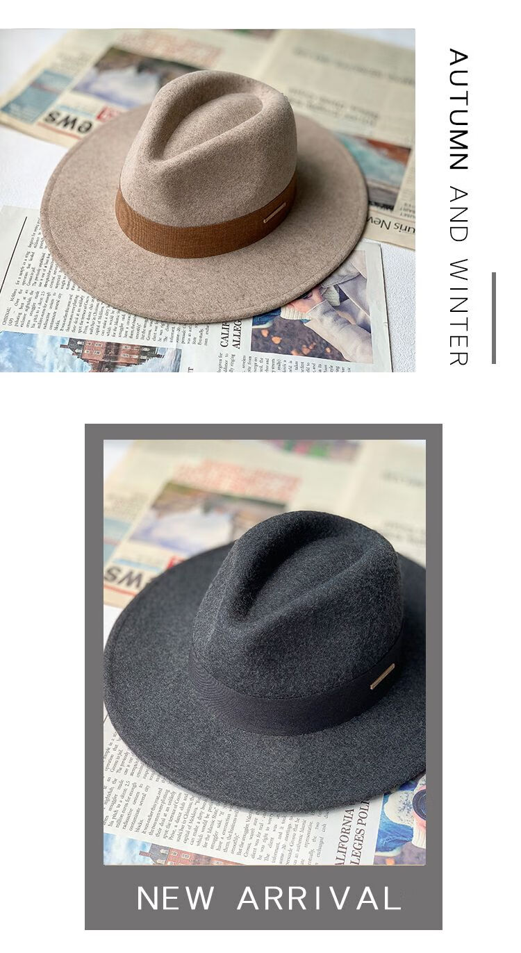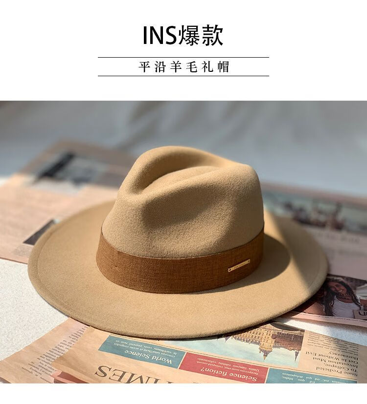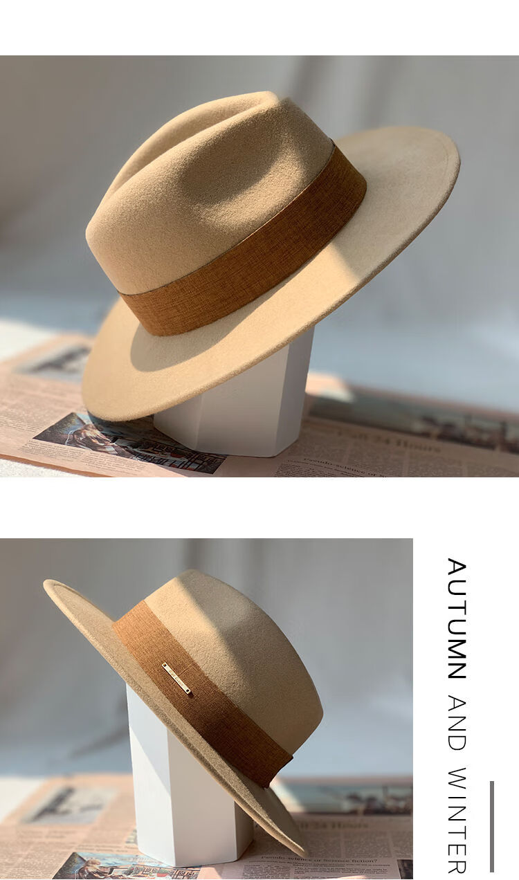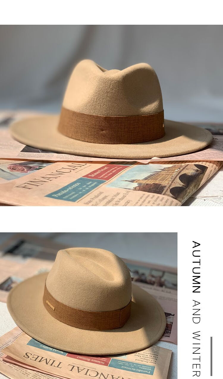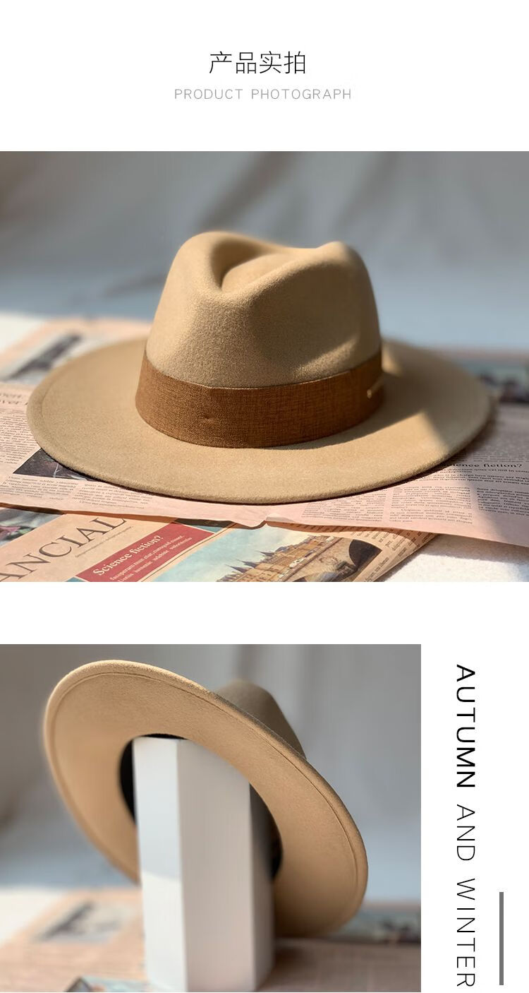 ALBINELE French new autumn and winter flat-brimmed woolen hat for men and women, fashionable wide brim black versatile European and American large head circumference camel camel (classic hot sale) M size 54-57cm head circumference (regular) adjustable