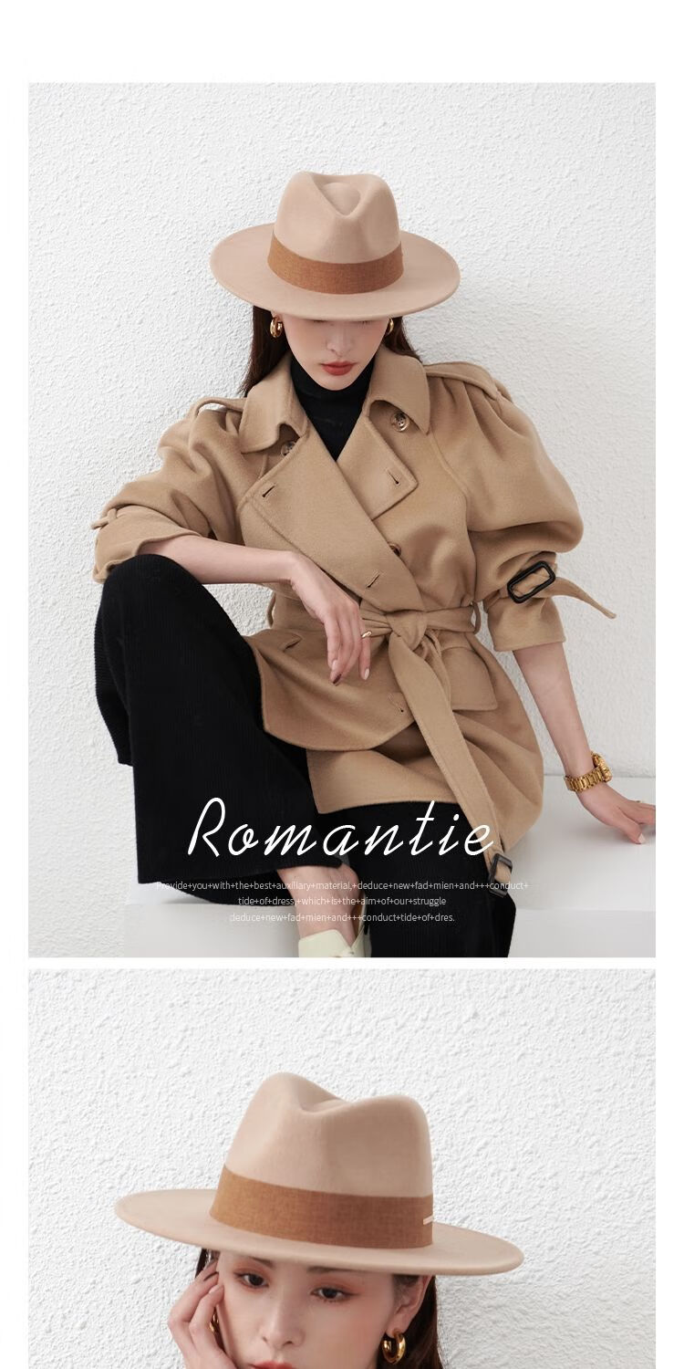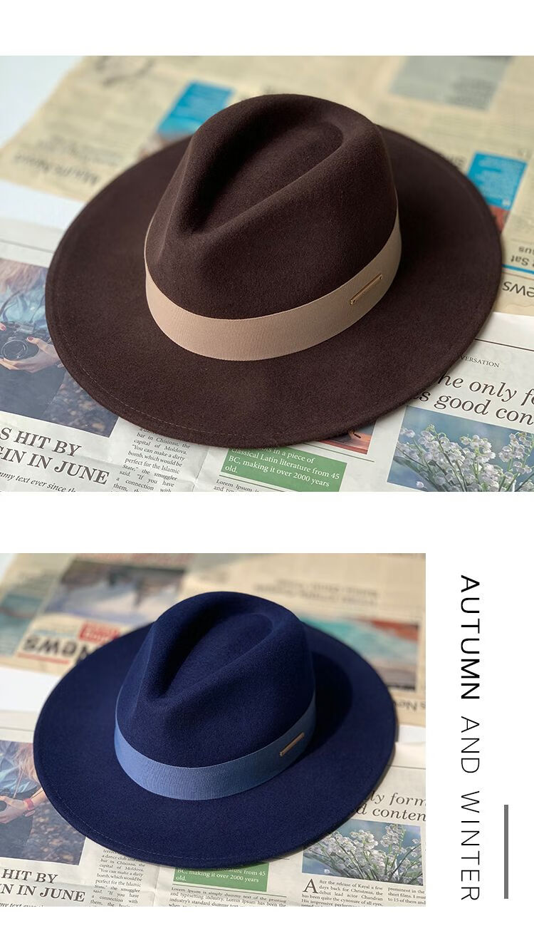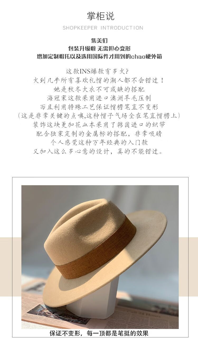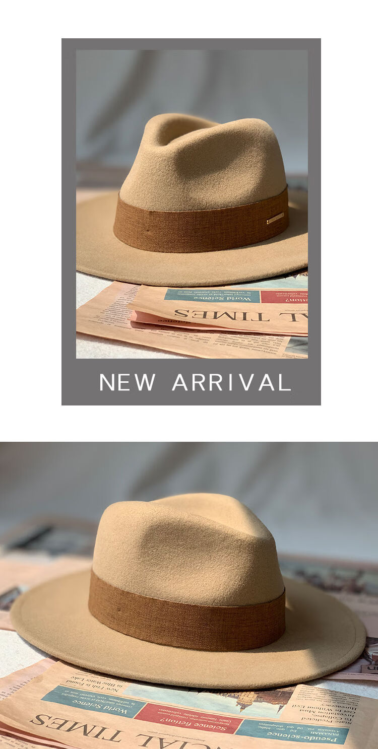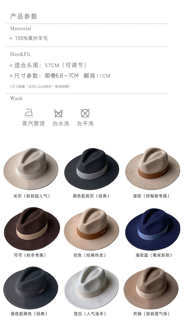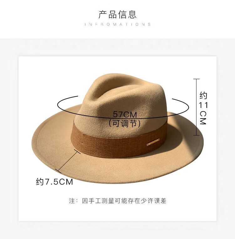 ALBINELE French new autumn and winter flat-brimmed woolen hat for men and women, fashionable wide brim black versatile European and American large head circumference camel camel (classic hot sale) M size 54-57cm head circumference (regular) adjustable