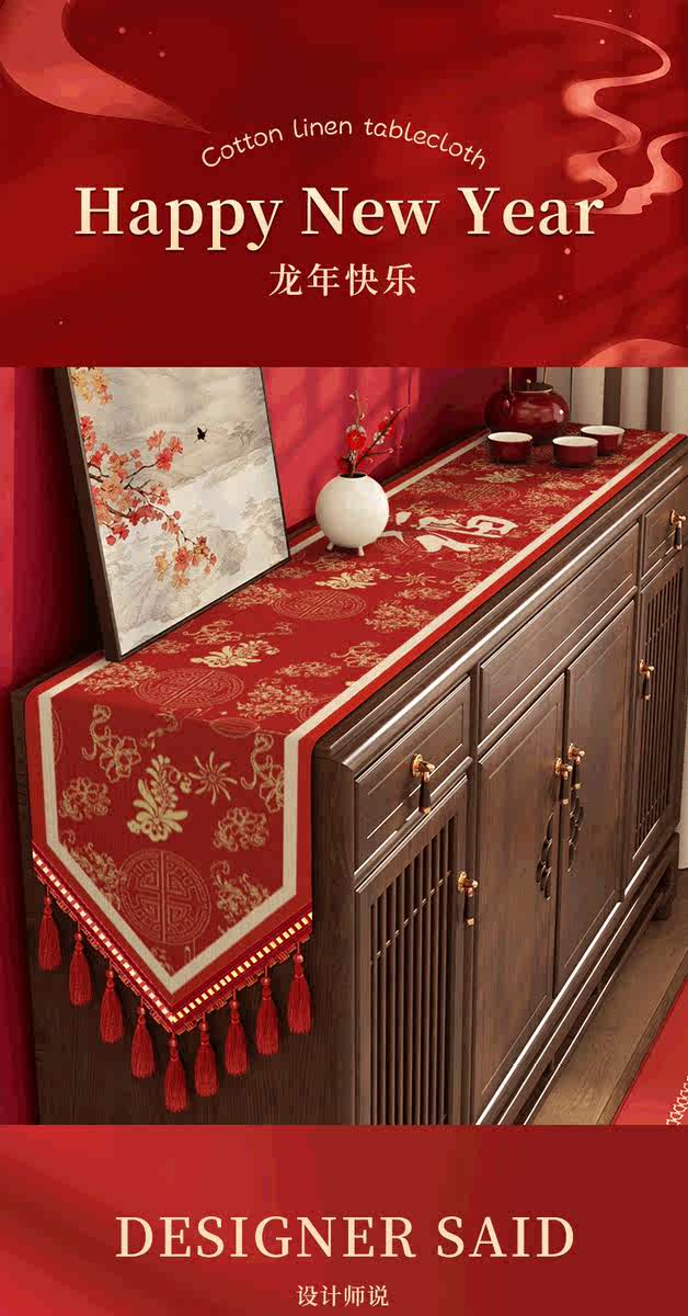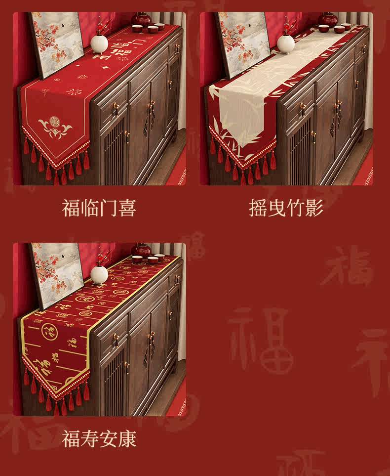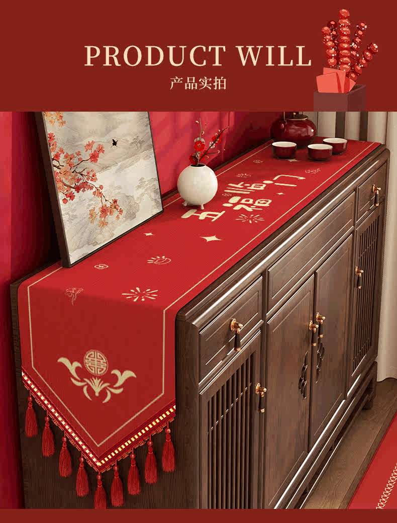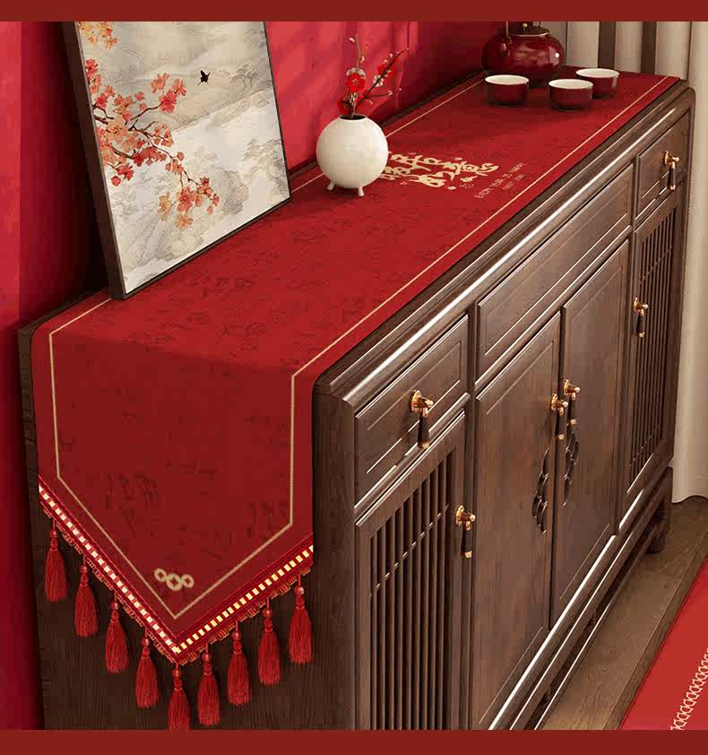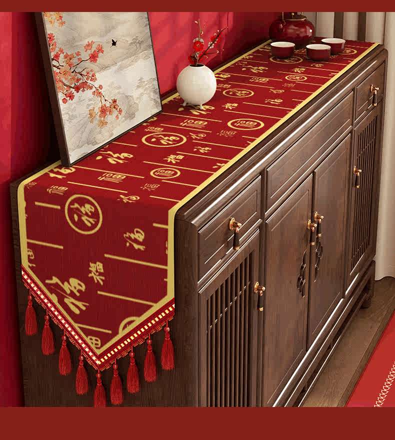 Yusenyi 2026 TV cabinet tablecloth with blessing character festive sideboard cover coffee table dining table wedding red strip Anleruyi triangle bilateral tassel red chenille 35x210cm