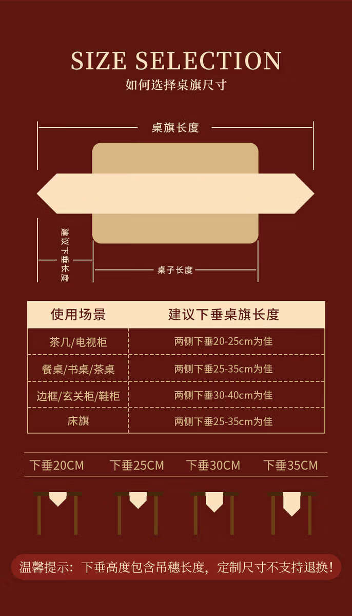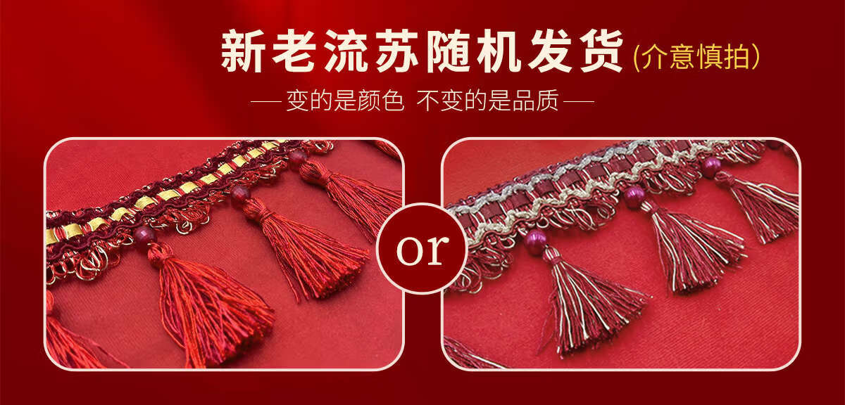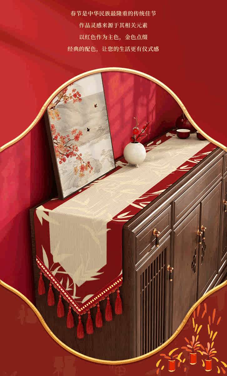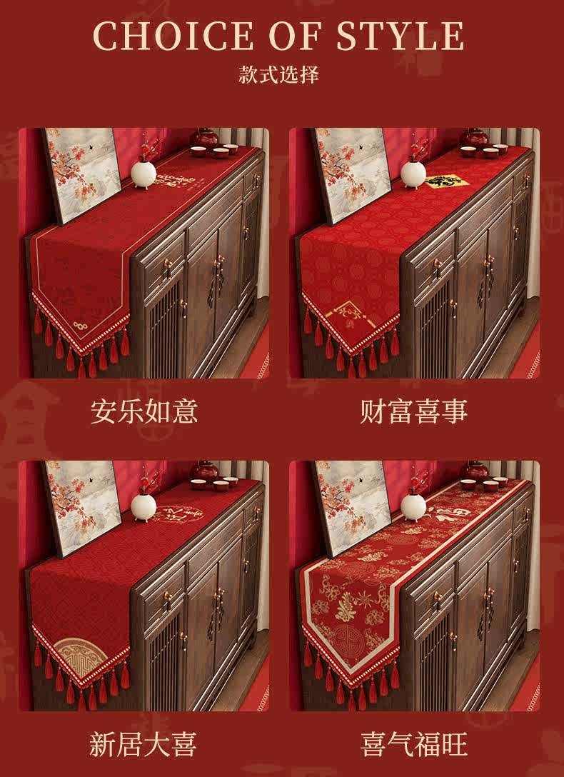 Yusenyi 2026 TV cabinet tablecloth with blessing character festive sideboard cover coffee table dining table wedding red strip Anleruyi triangle bilateral tassel red chenille 35x210cm