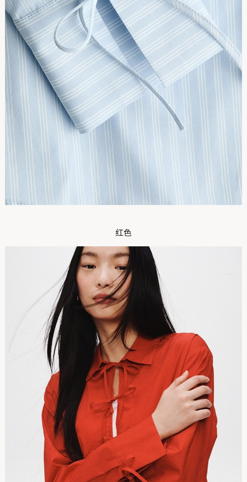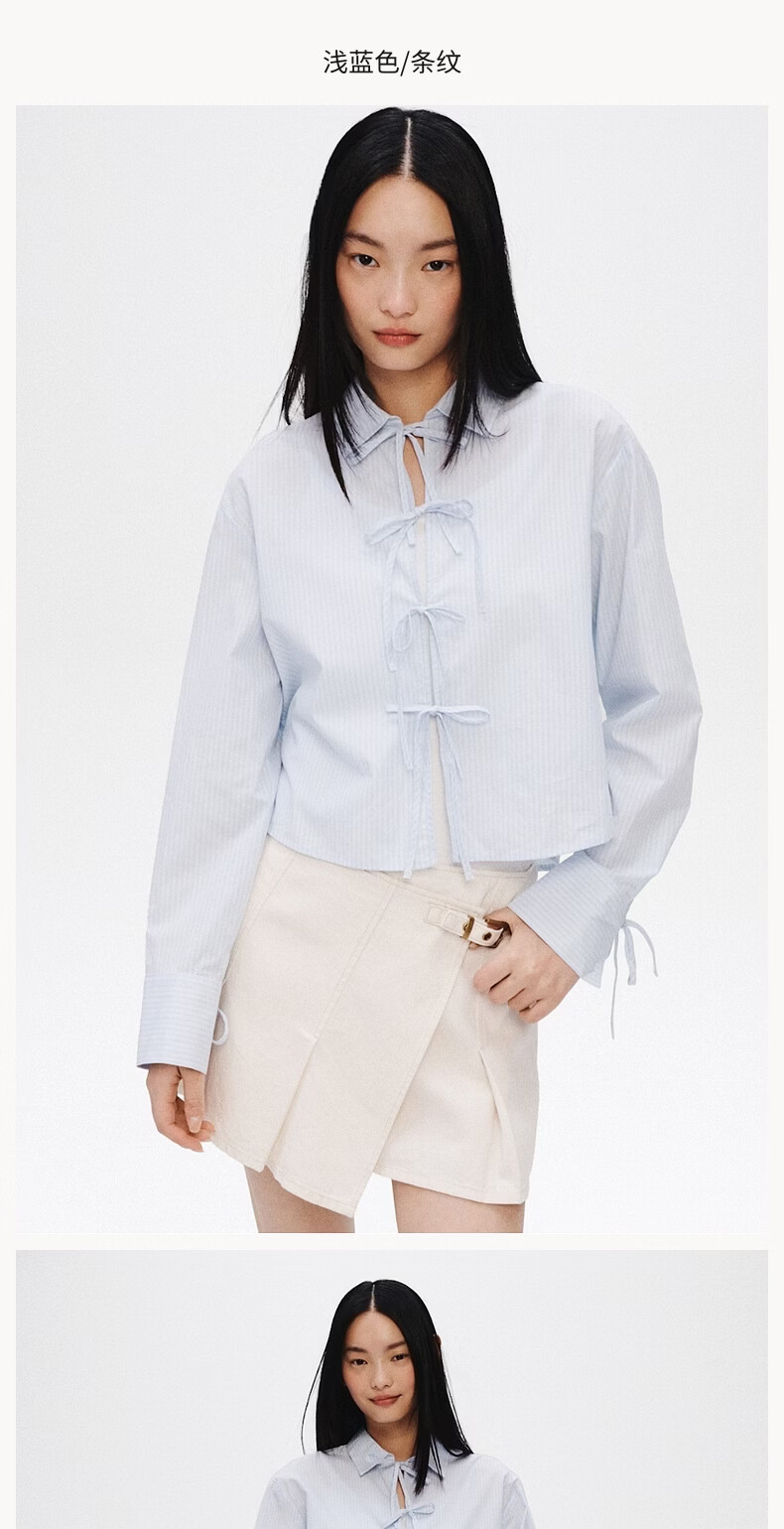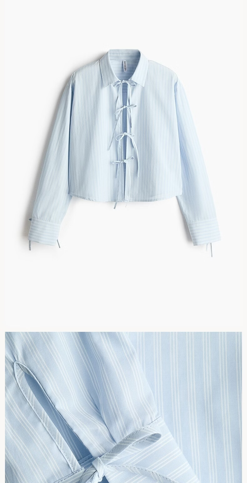 H&M 2026 Spring New Women's Front Tie-Up Poplin Shirt 1327619 Light Blue/Stripes XS 155/80