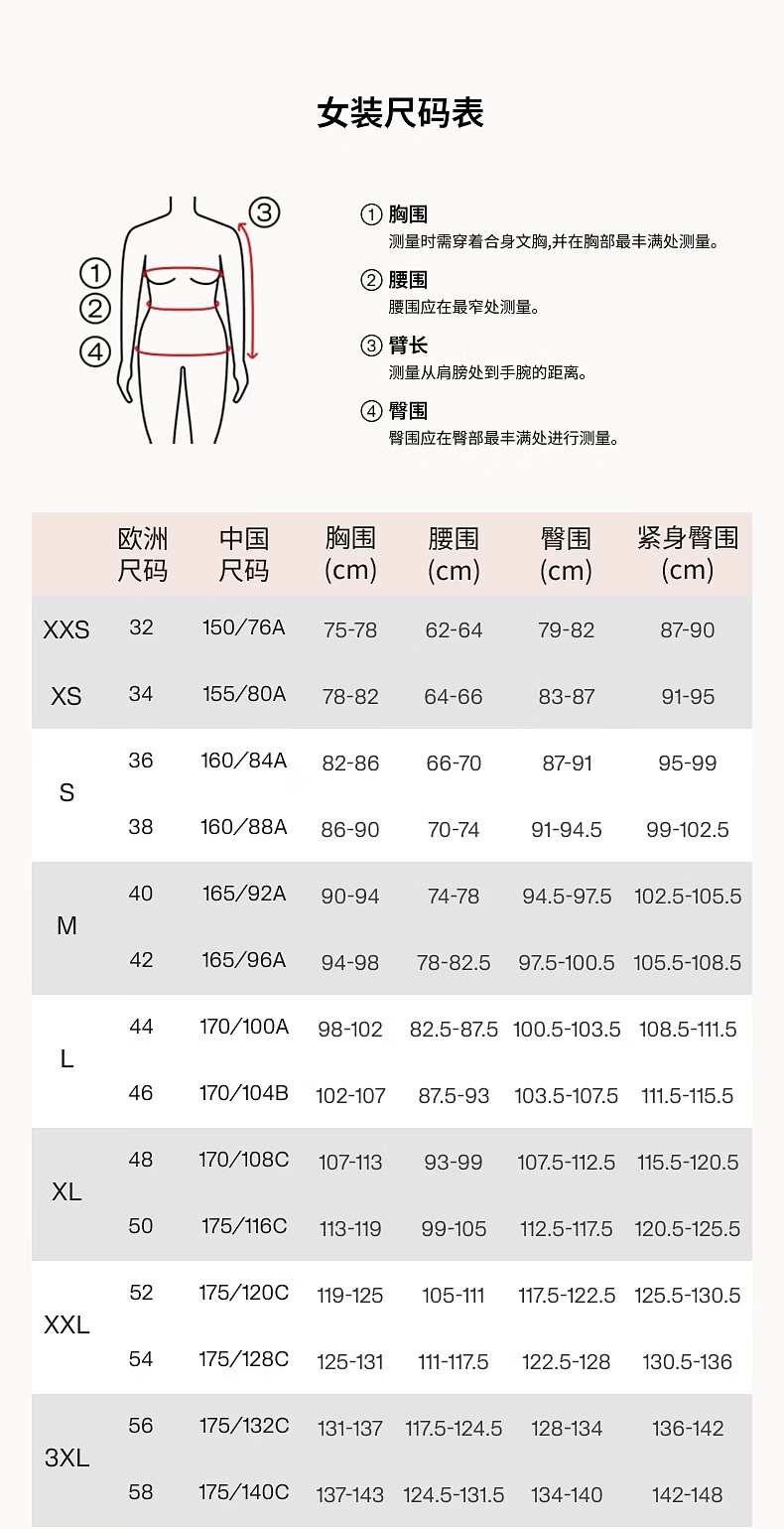 China (cm) 160-165/84-86 165-170 / 88-90 167-172 / 92-96 168-173 / 98-102 170-176 / 106-110