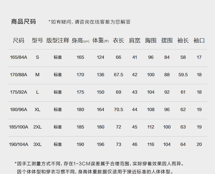 China (cm) 165 / 88-90 170 / 96-98 175 / 108-110 180 / 118-122 185 / 126-130