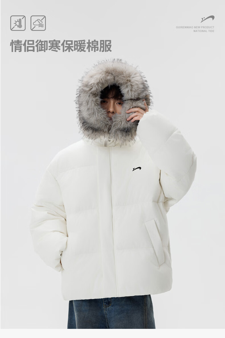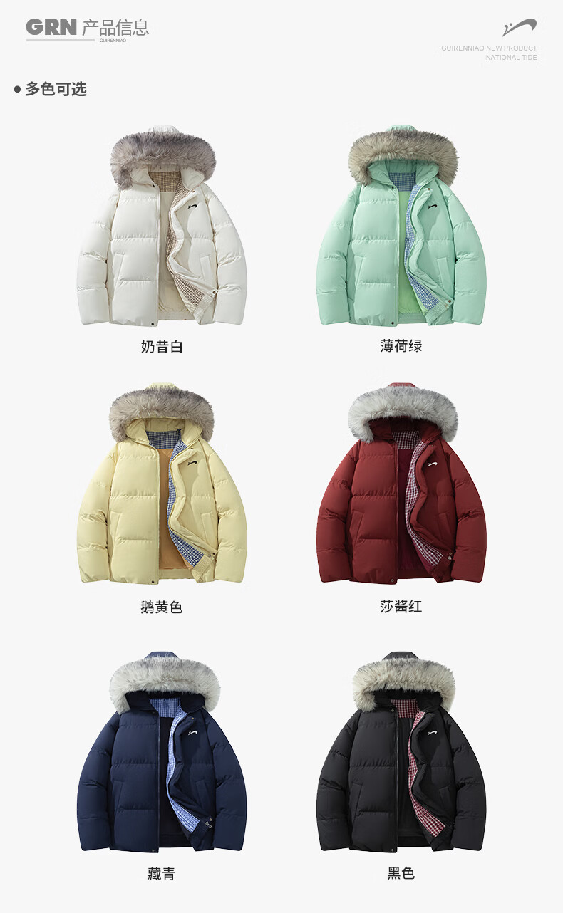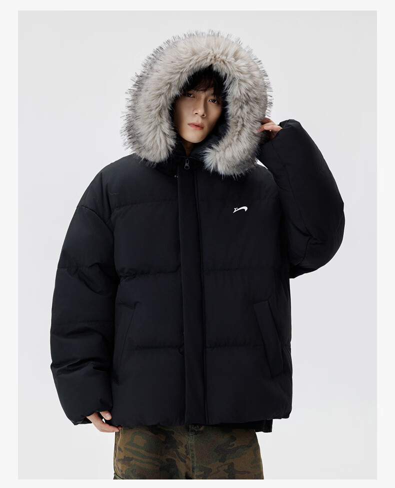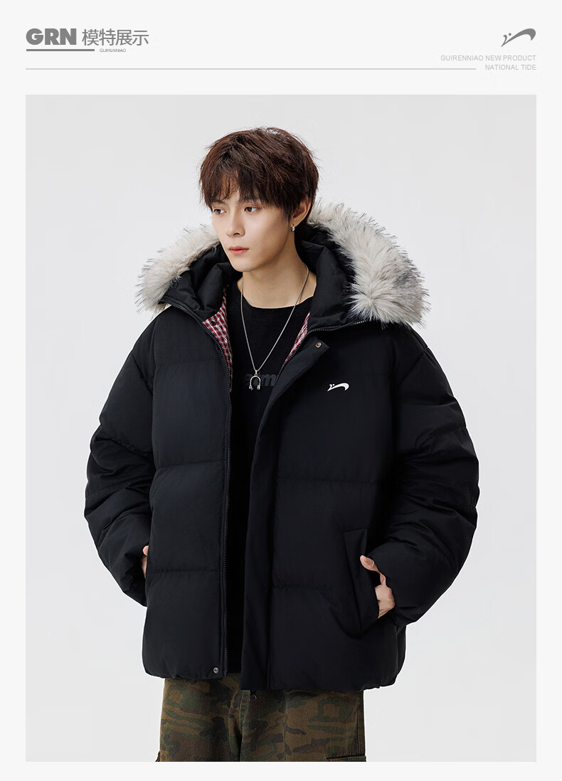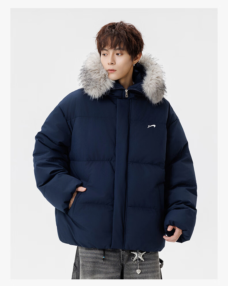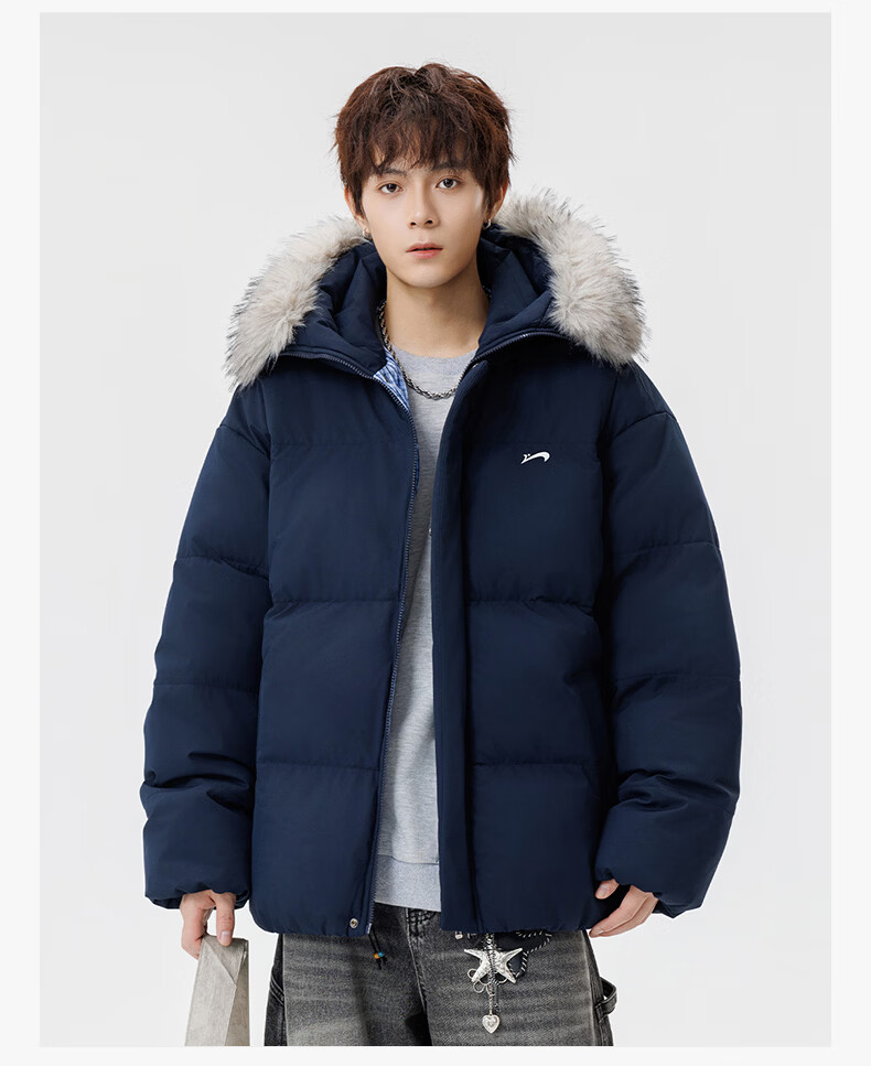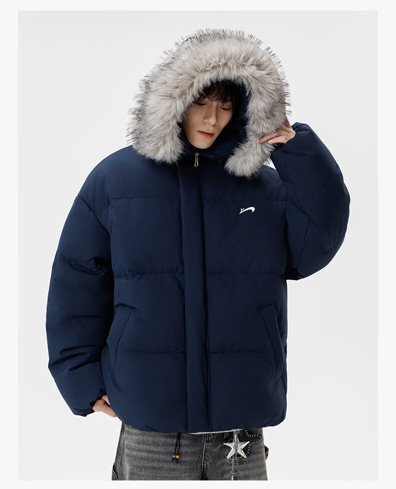 Guirenniao hooded down jacket for men in winter, thickened and warm fur collar parka coat, couple windproof cotton-padded jacket, navy M