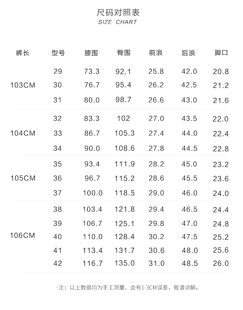 Outseam (cm) 99 cm 101.5 cm 104 cm 106.5 cm 109 cm