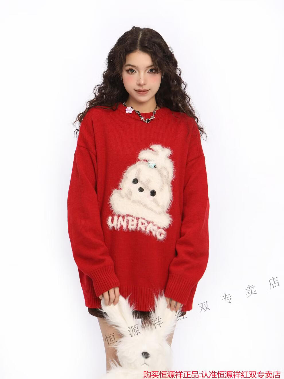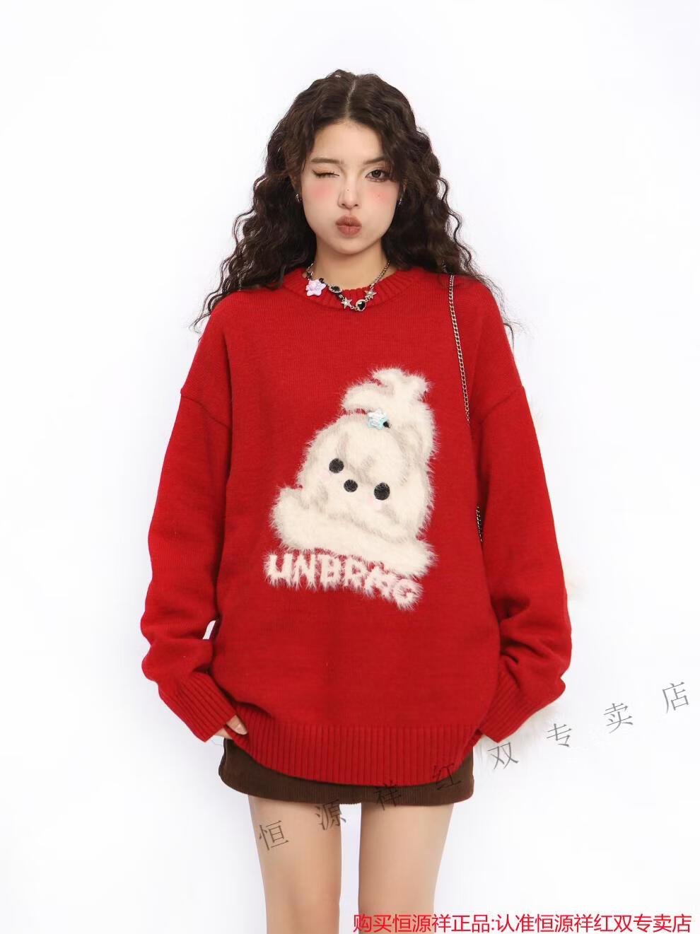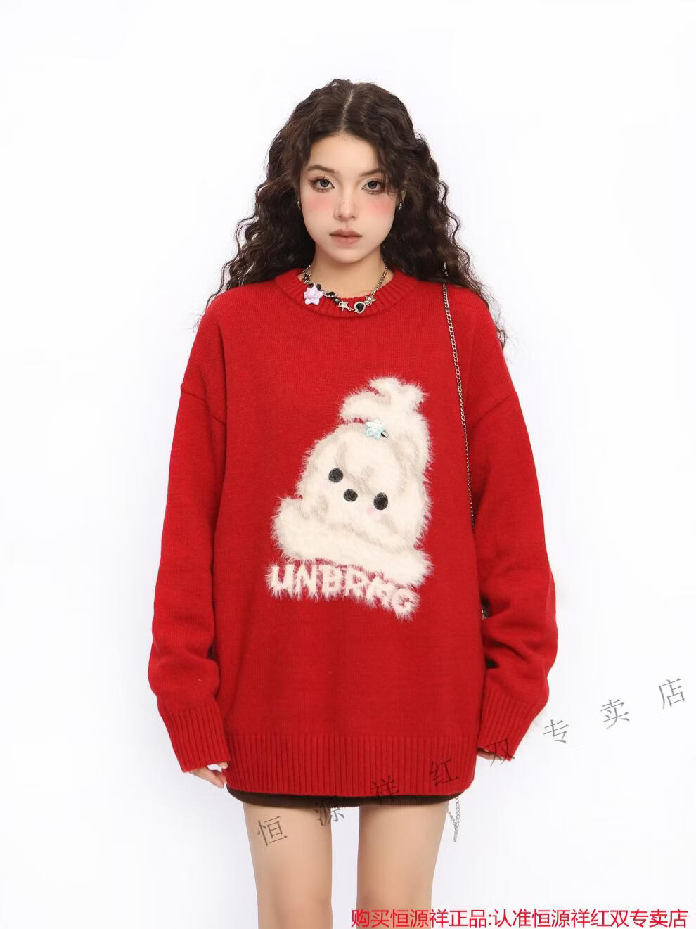 Hengyuanxiang American New Year flocking cute dog red sweater for women spring and autumn couple round neck sweater top Qiji Hongshu red S
