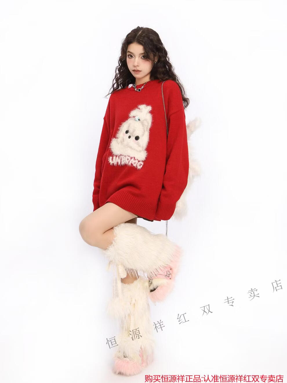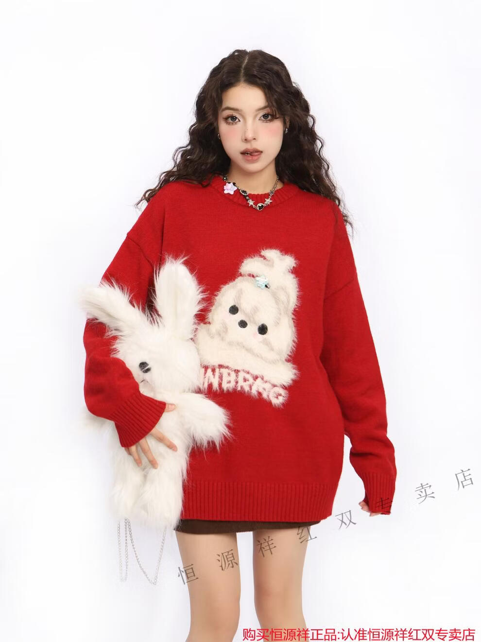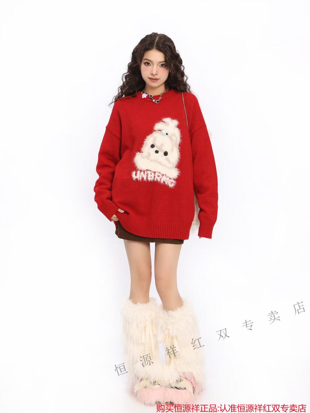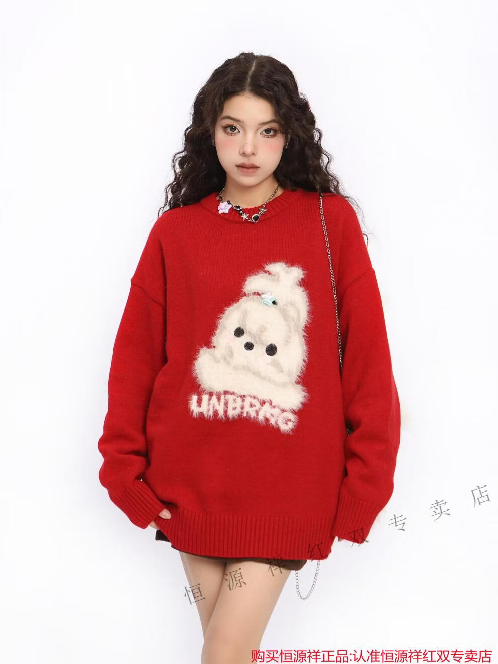 Hengyuanxiang American New Year flocking cute dog red sweater for women spring and autumn couple round neck sweater top Qiji Hongshu red S
