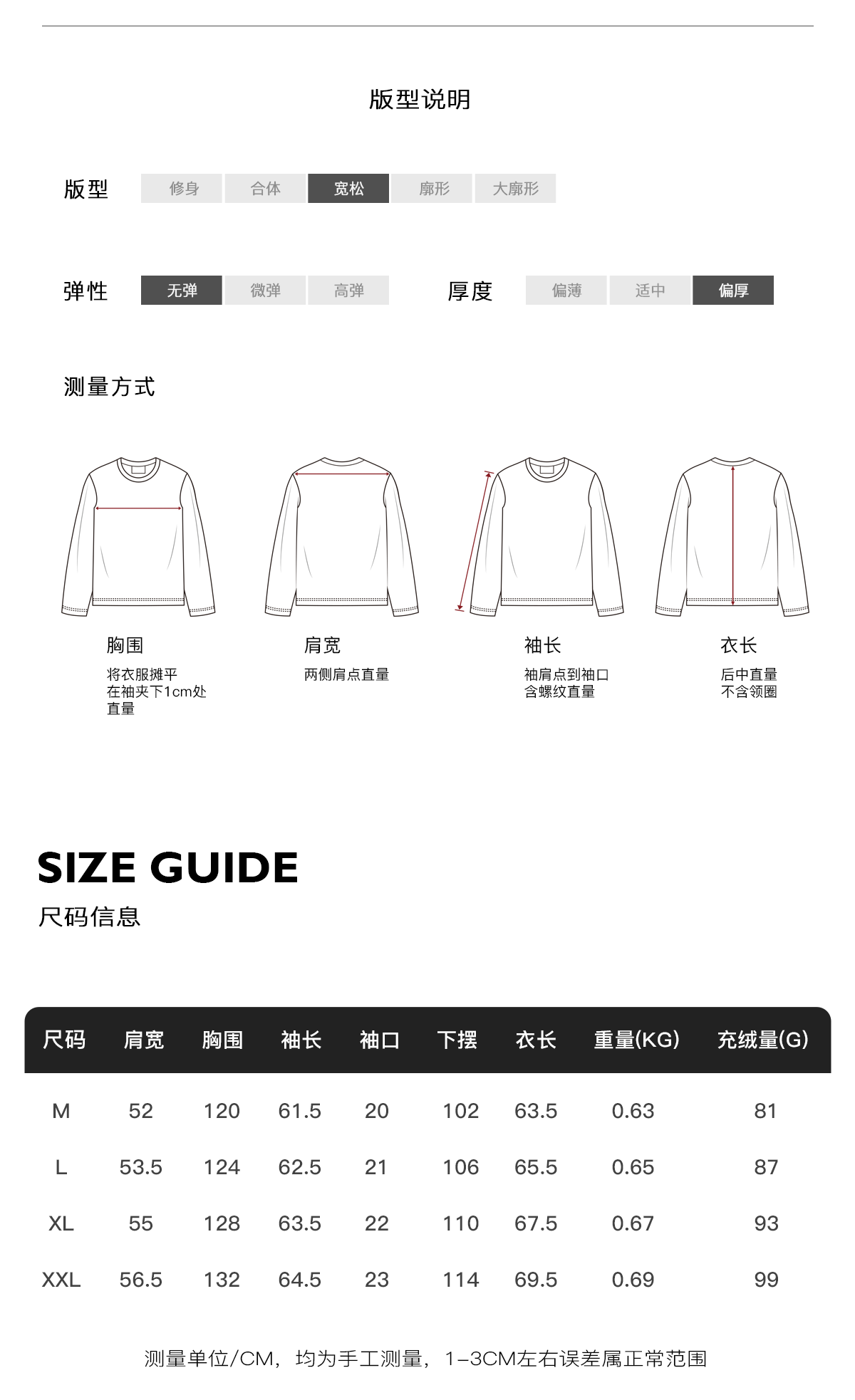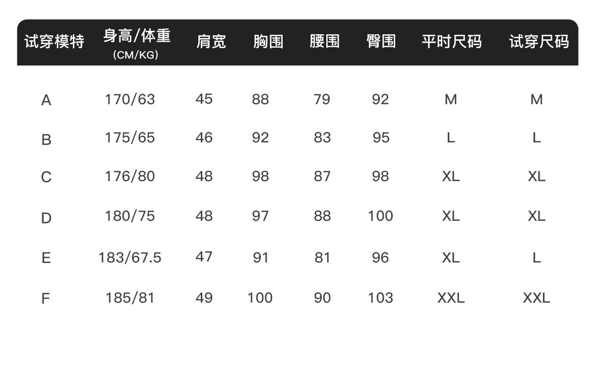 China (cm) 165 / 88-90 170 / 96-98 175 / 108-110 180 / 118-122 185 / 126-130