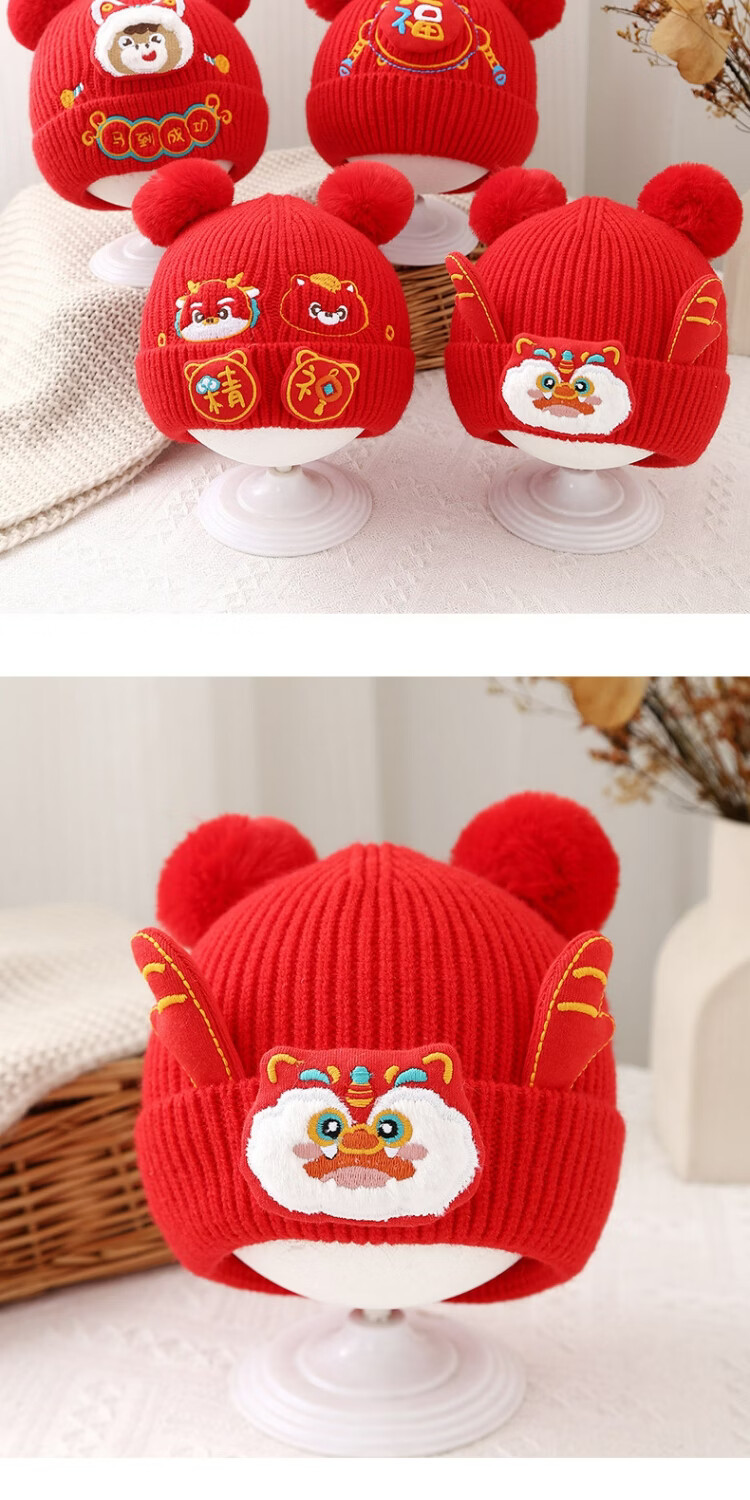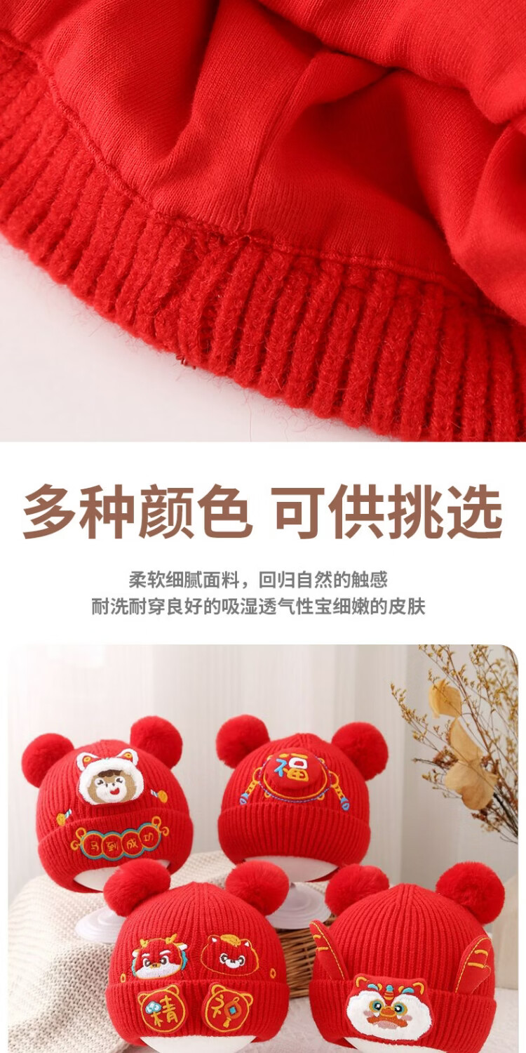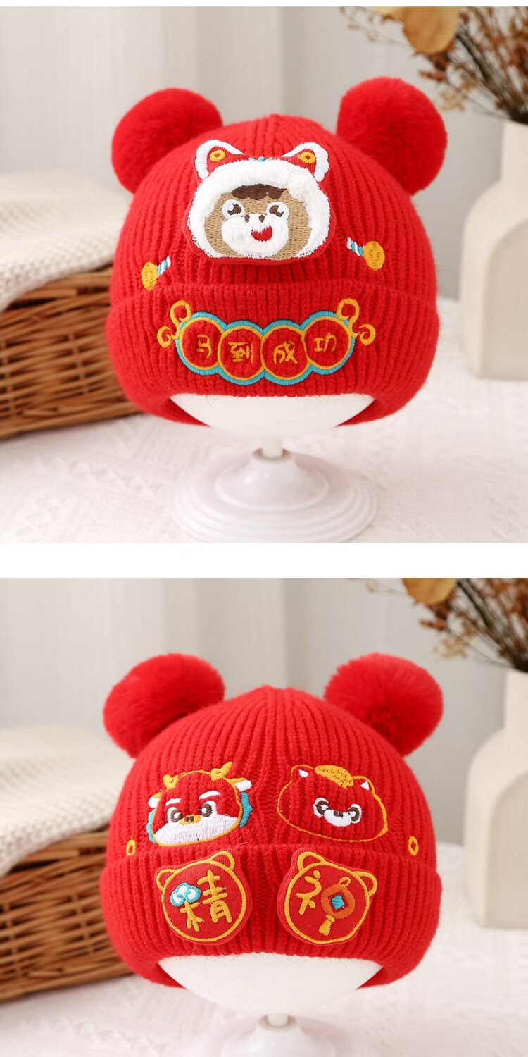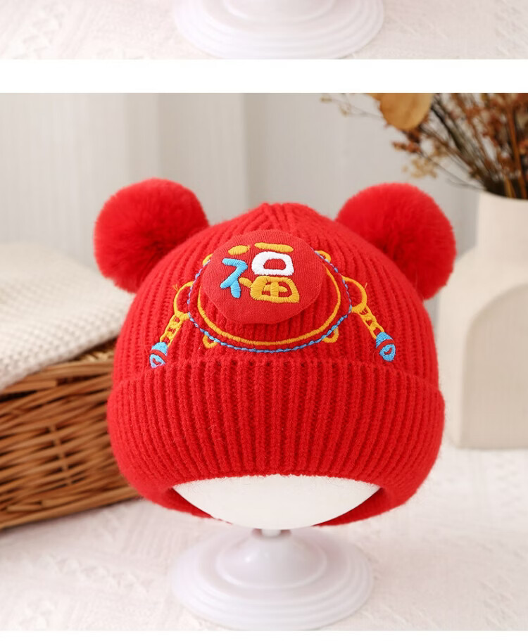 Jingqi Baby New Year's Hat Autumn and Winter Festive Red Embroidered Wool Hat Men and Women Baby Warm Pullover Hat Winter Year-End Safe 43-46cm