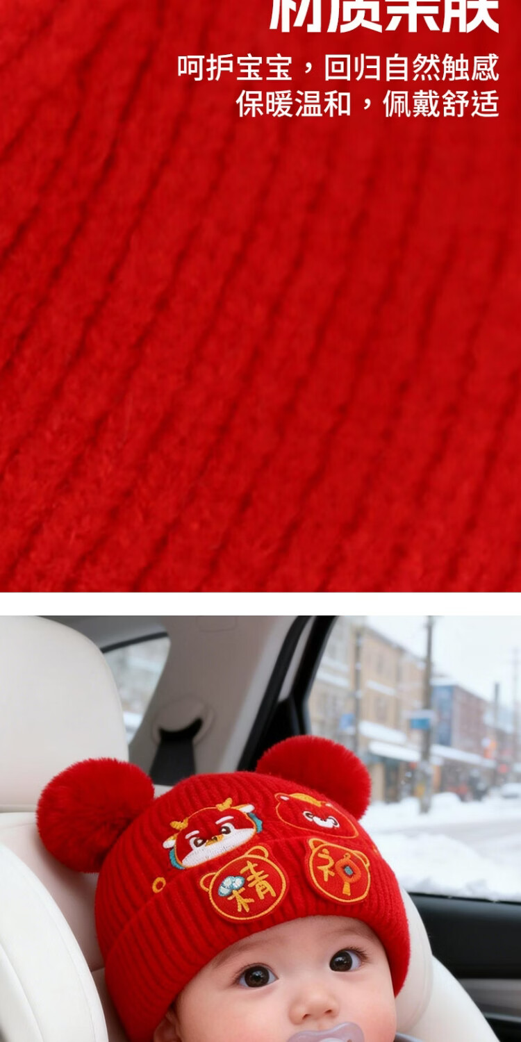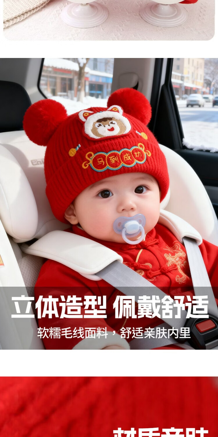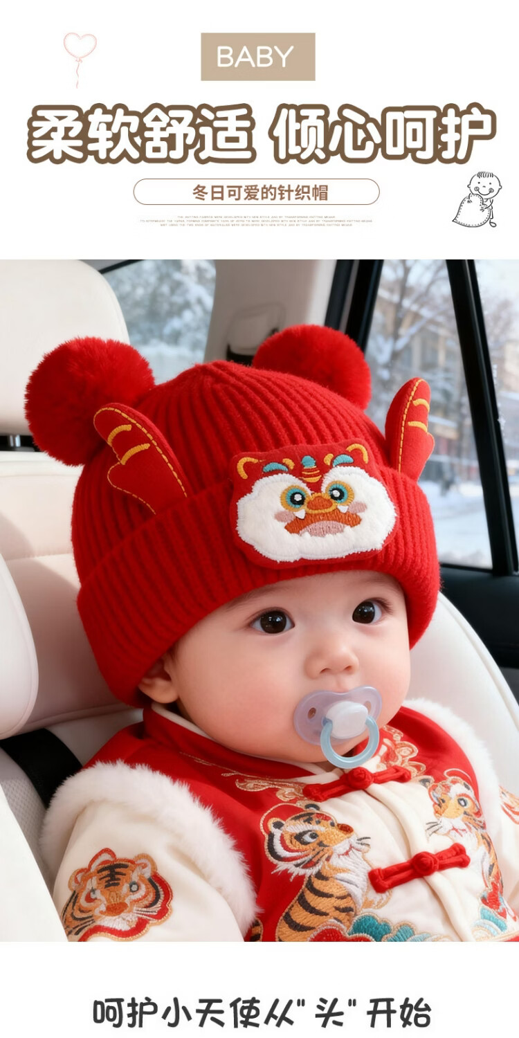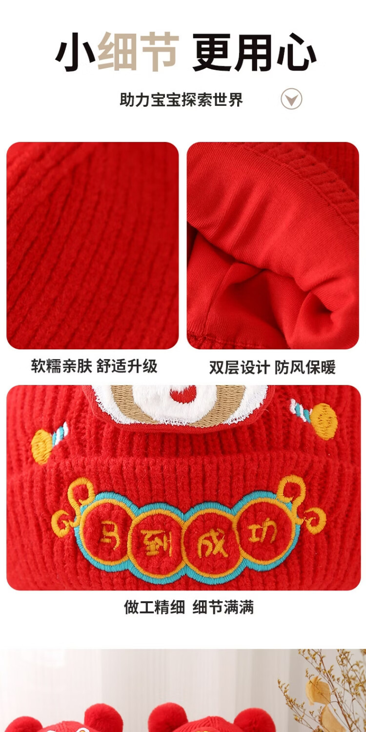 Jingqi Baby New Year's Hat Autumn and Winter Festive Red Embroidered Wool Hat Men and Women Baby Warm Pullover Hat Winter Year-End Safe 43-46cm