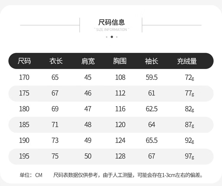 China (cm) 165 / 88-90 170 / 96-98 175 / 108-110 180 / 118-122 185 / 126-130