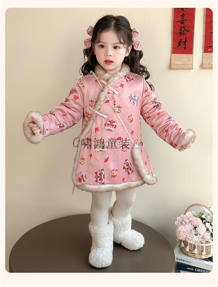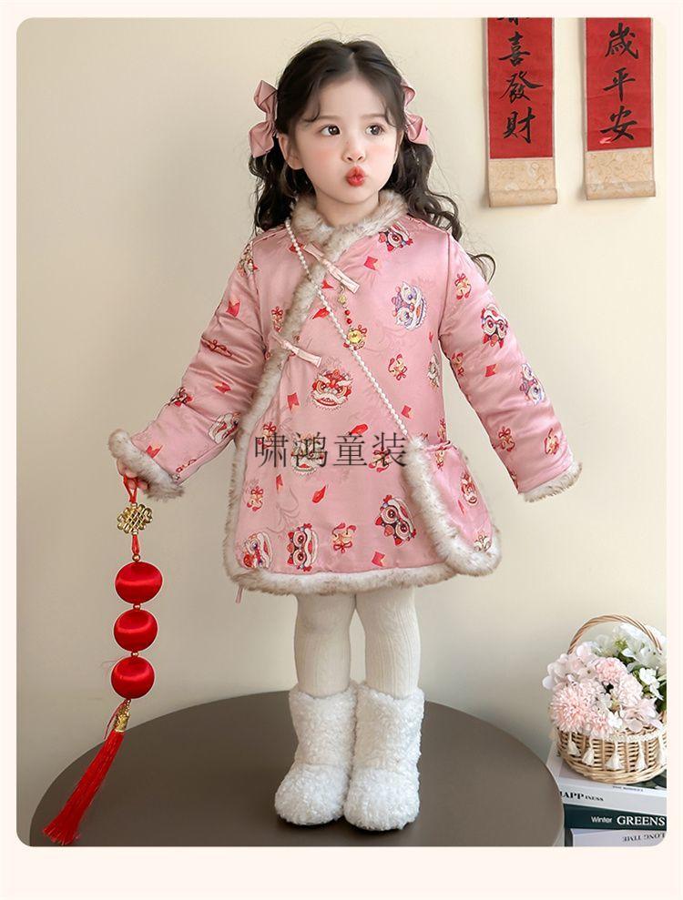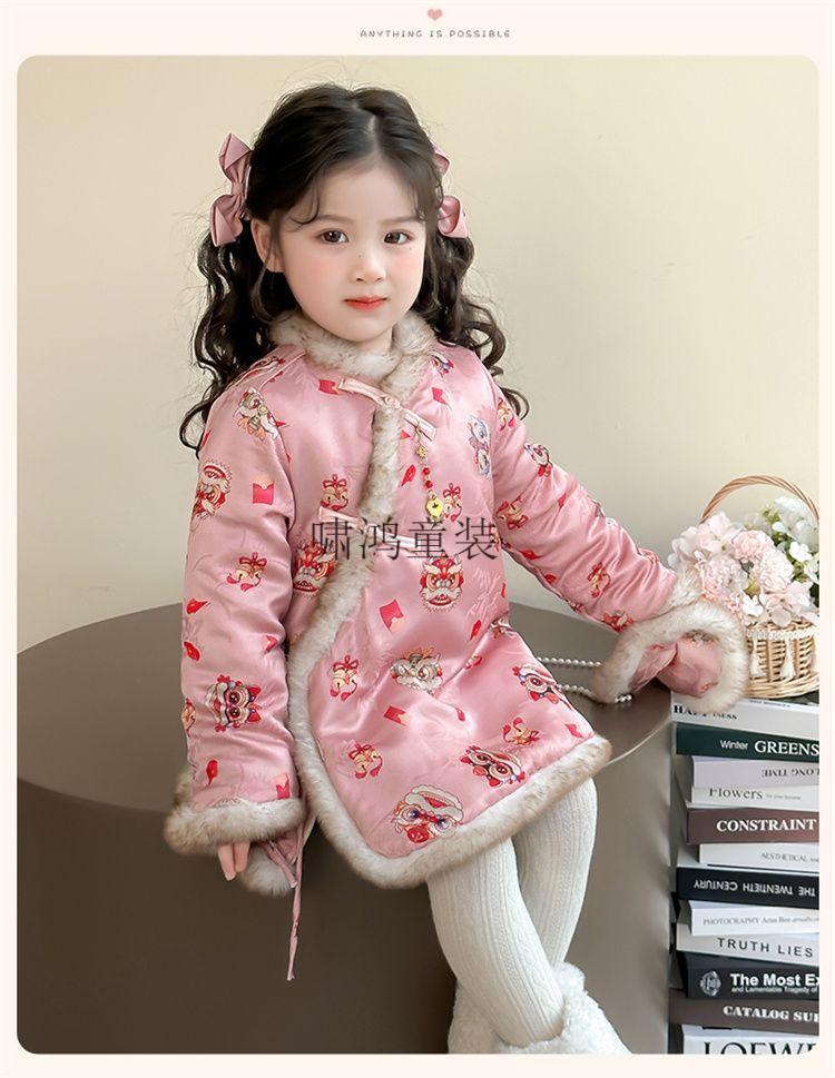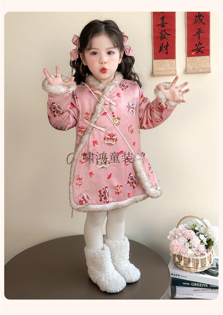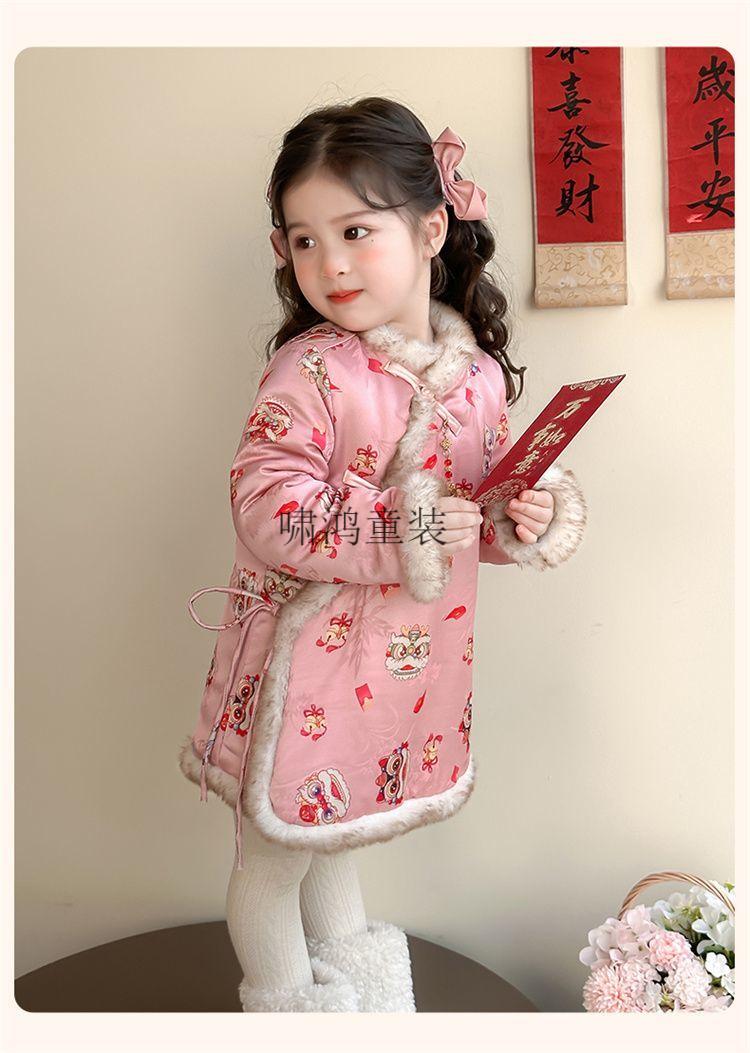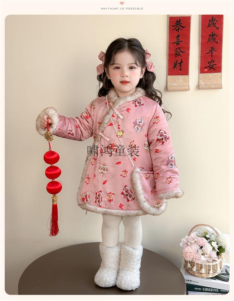 Wooden wooden house winter girls' new Chinese style velvet cotton-padded jacket New Year's greetings clothes 2026 new girls' national style lion awakening children's winter clothing cheongsam pink lion awakening New Year's clothing 100