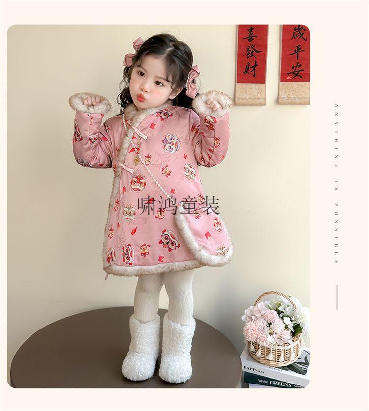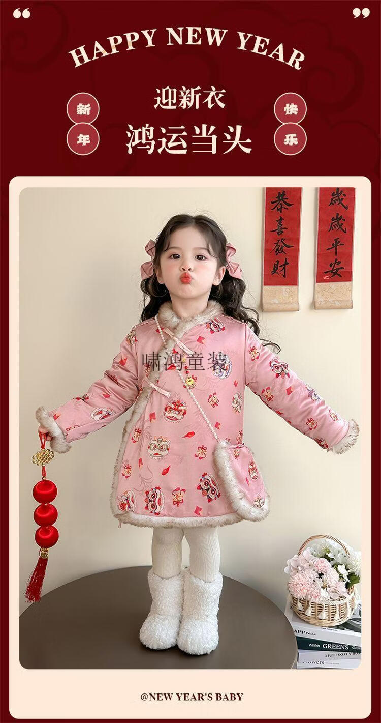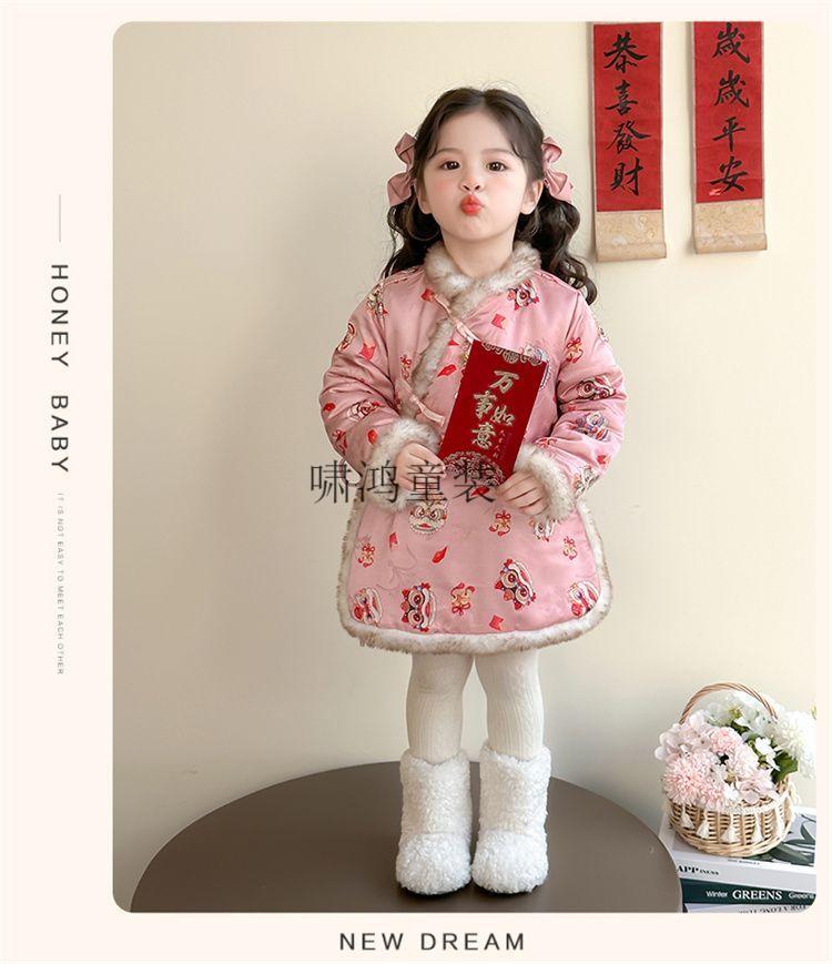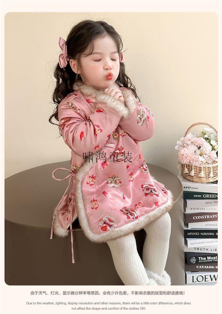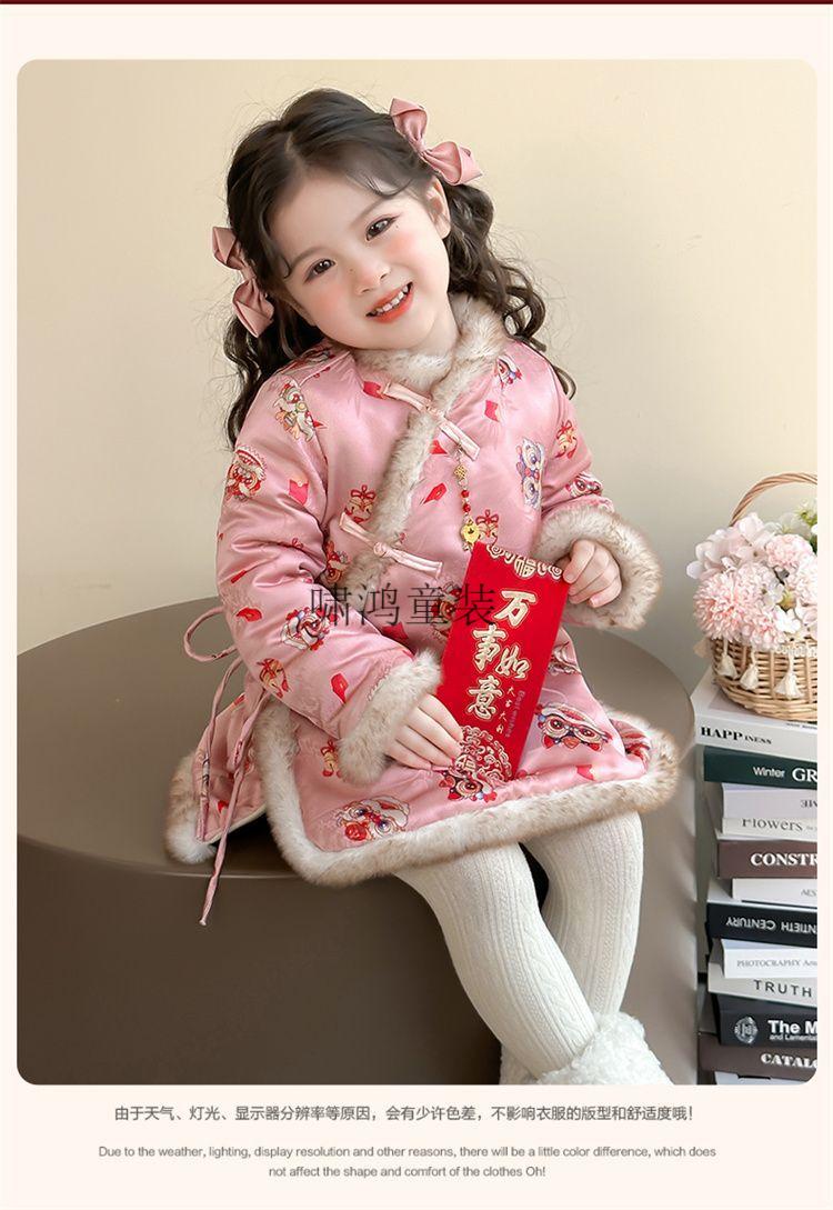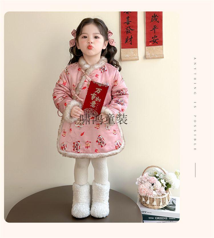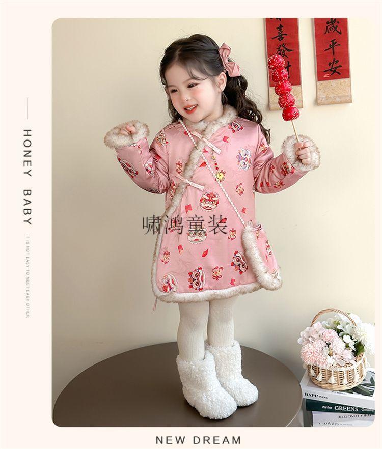Wooden wooden house winter girls' new Chinese style velvet cotton-padded jacket New Year's greetings clothes 2026 new girls' national style lion awakening children's winter clothing cheongsam pink lion awakening New Year's clothing 100