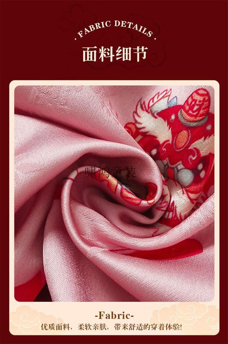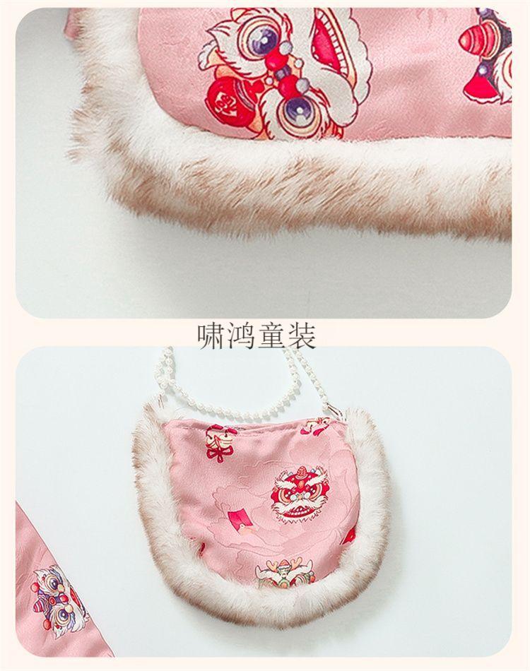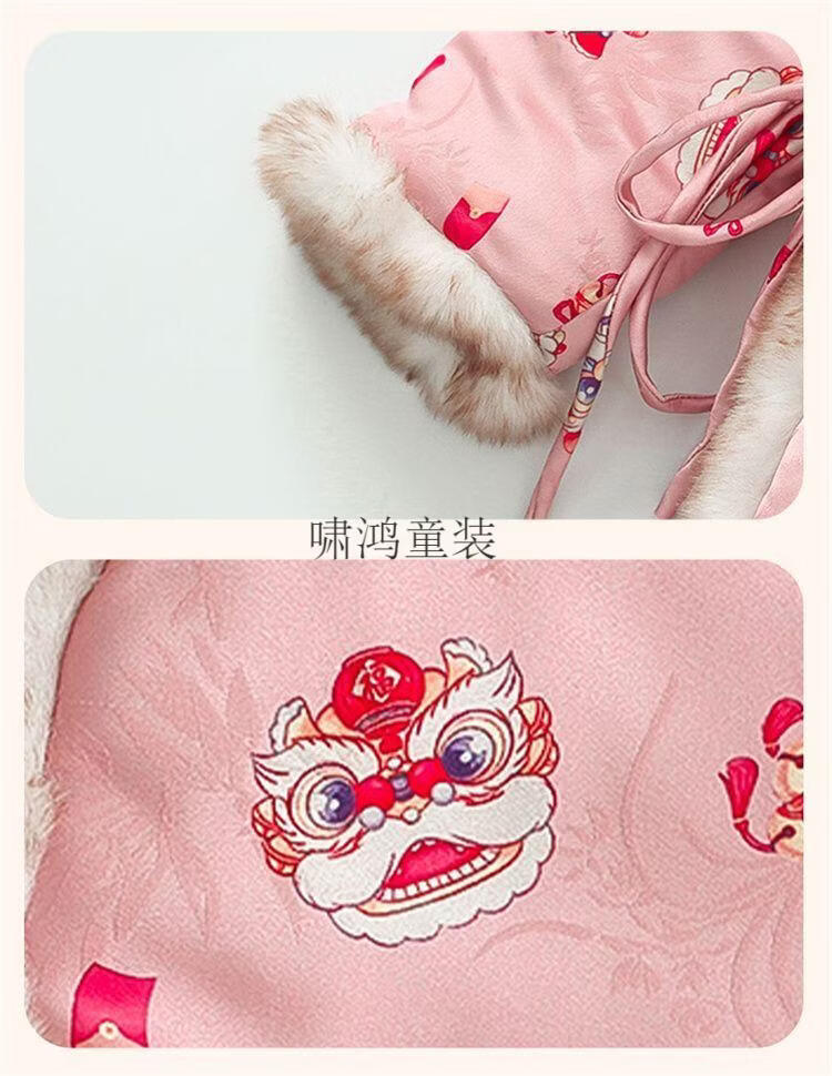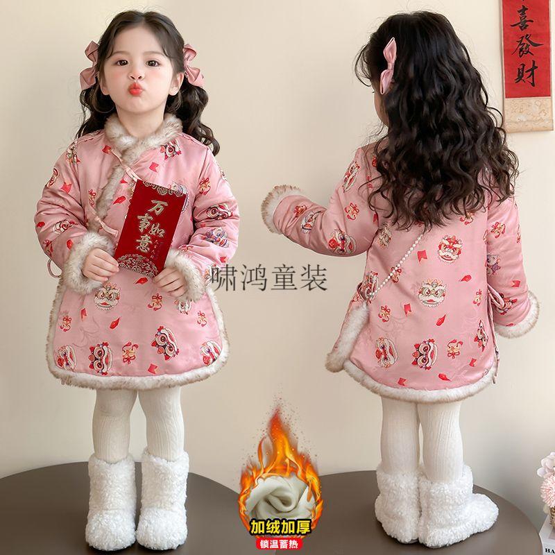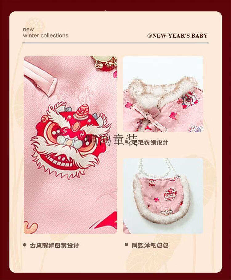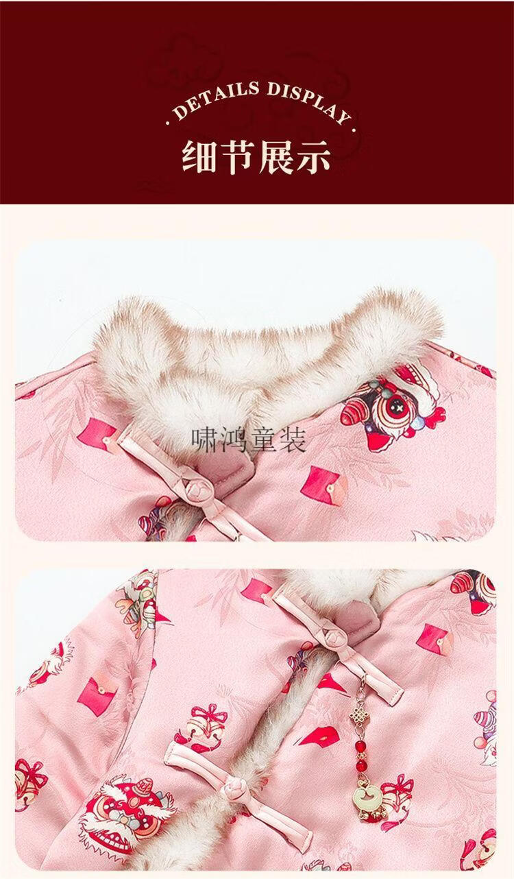 Wooden wooden house winter girls' new Chinese style velvet cotton-padded jacket New Year's greetings clothes 2026 new girls' national style lion awakening children's winter clothing cheongsam pink lion awakening New Year's clothing 100