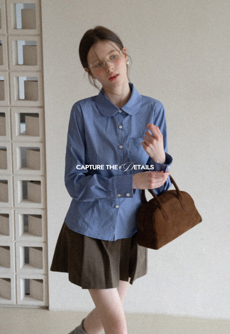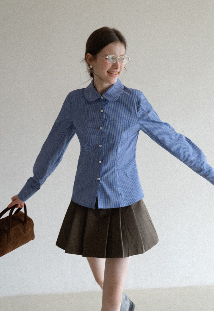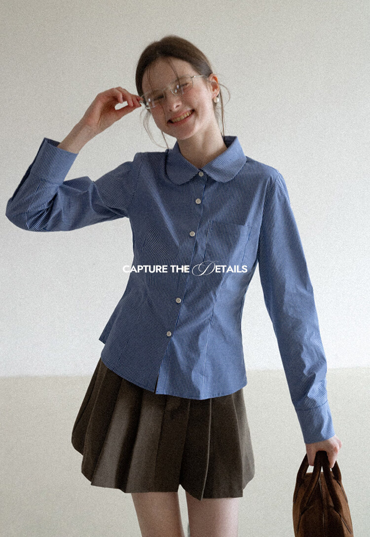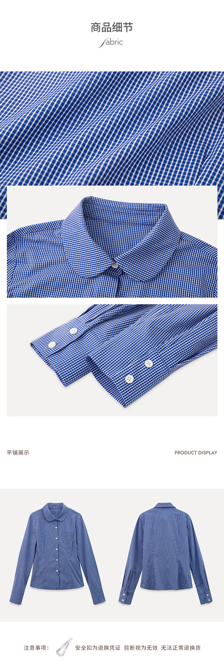 EGGKA temperament lapel waist design slimming simple long-sleeved shirt E26A60116YM Blue Check M