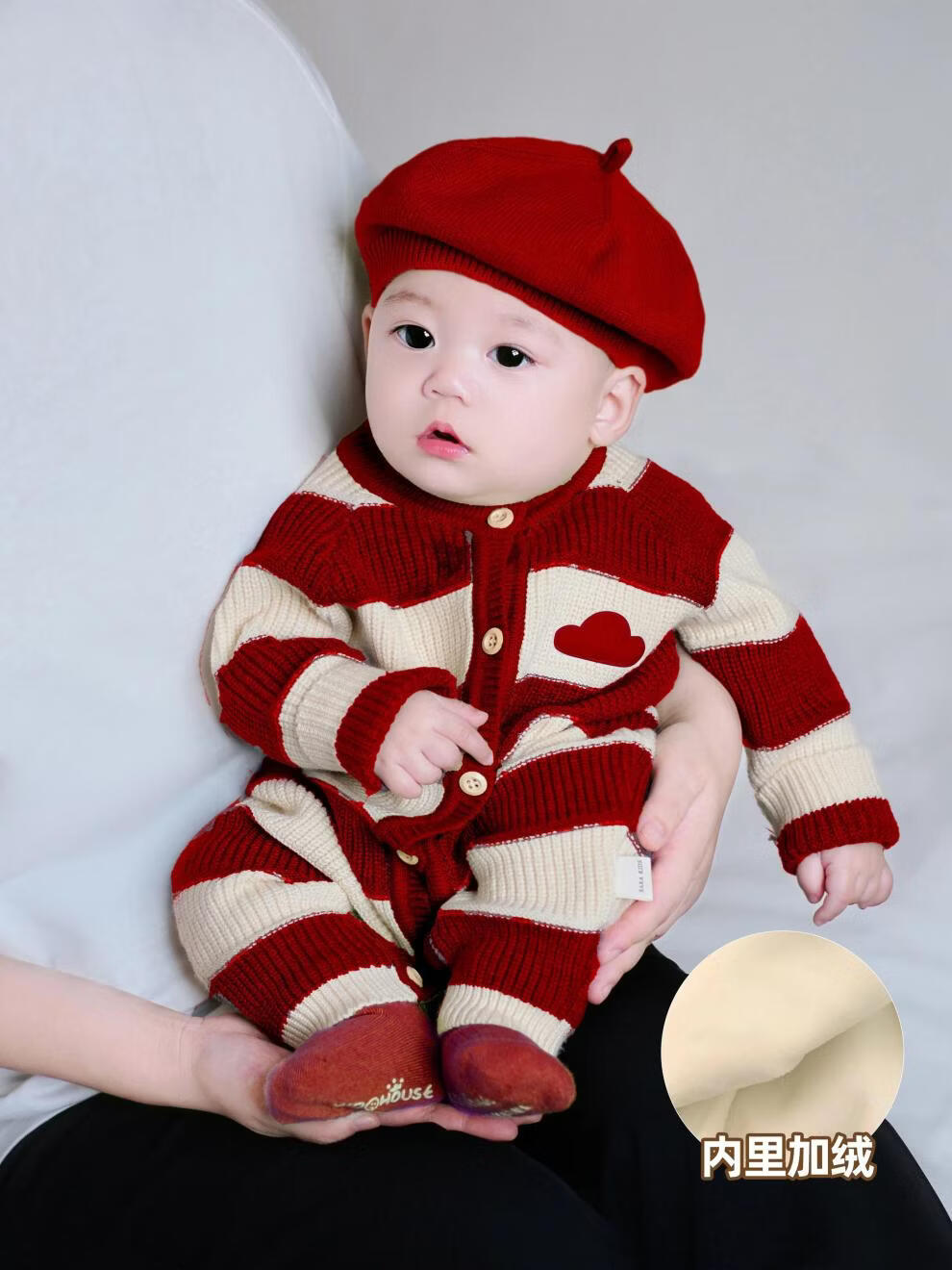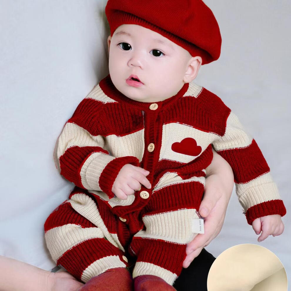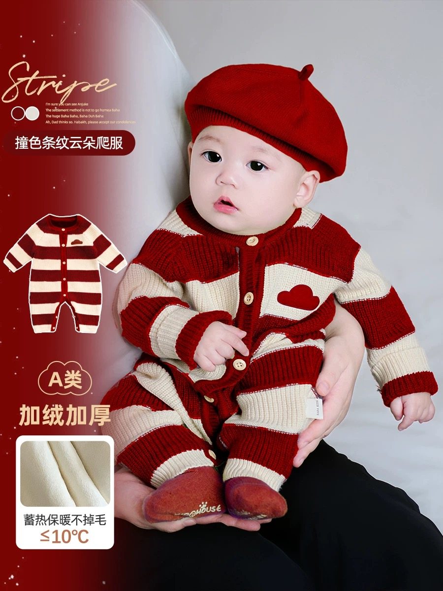 Disney Baby Clothes Autumn and Winter Jumpsuit Baby Knitted Wool Romper Suit Newborn Full Moon 100 Days One Year Old Suit Jumpsuit + Hat + Socks (plus fleece) 36cm 66