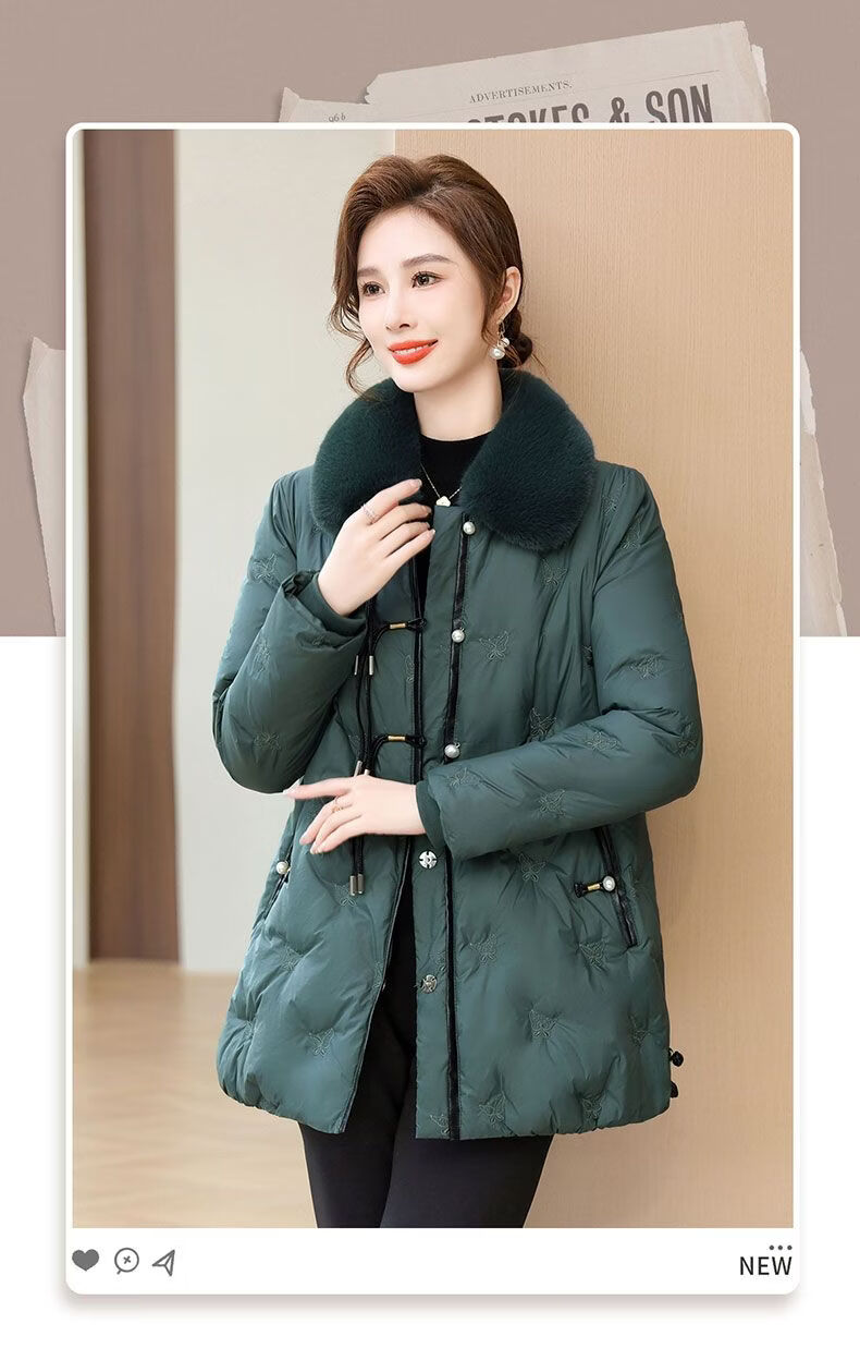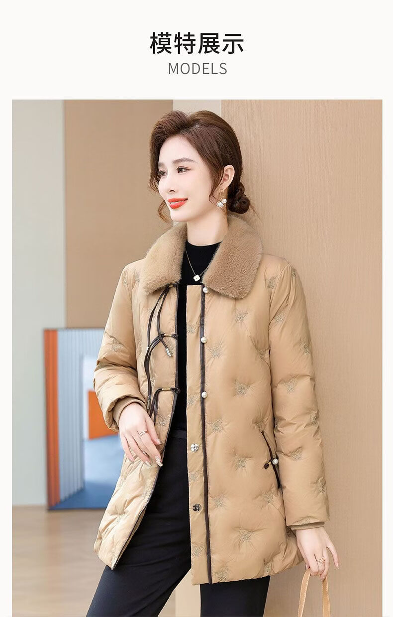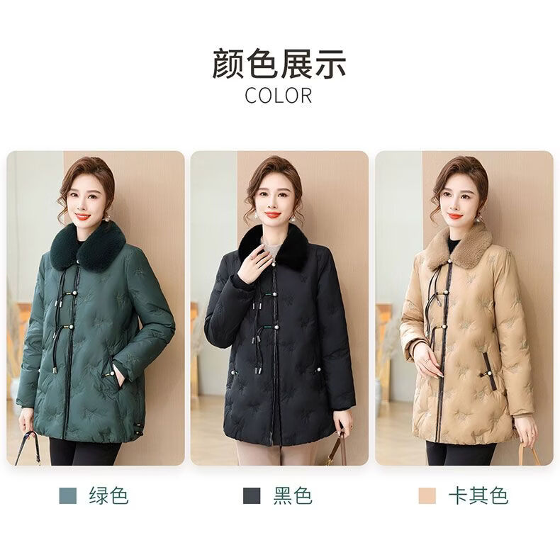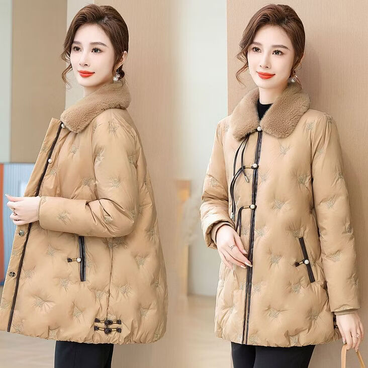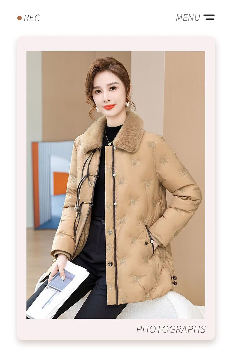 ROMON middle-aged mother's new winter down jacket, middle-aged and elderly women's winter clothing, western style jacket, thickened big fur collar, fashionable khaki XL recommended 85-110Jin Jin equals about 0.5 kg