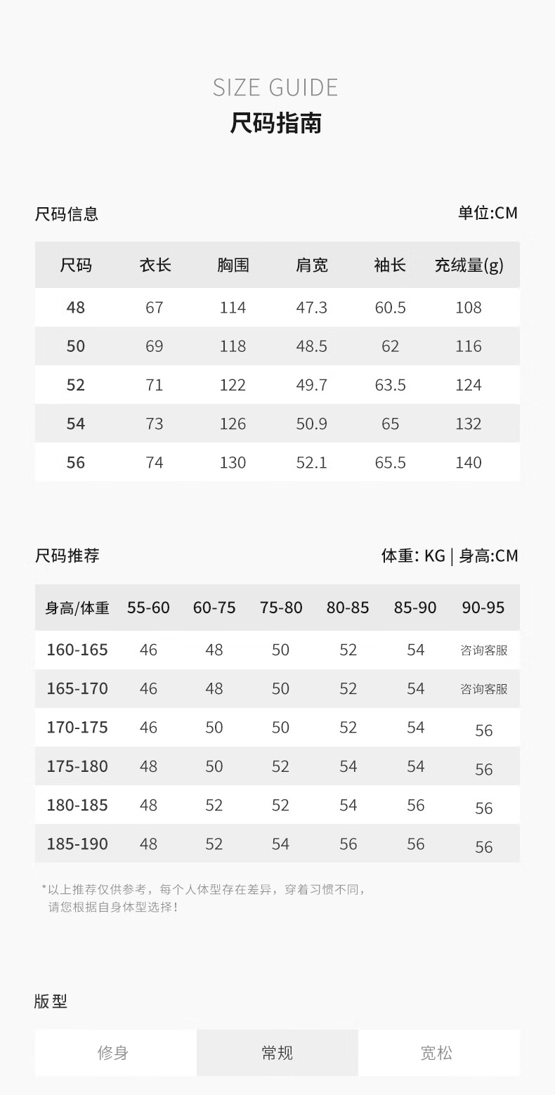 China (cm) 165 / 88-90 170 / 96-98 175 / 108-110 180 / 118-122 185 / 126-130