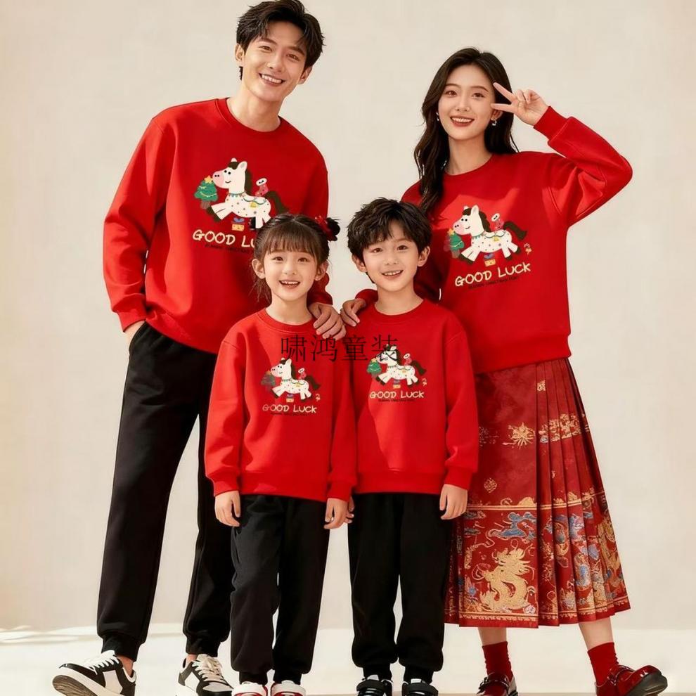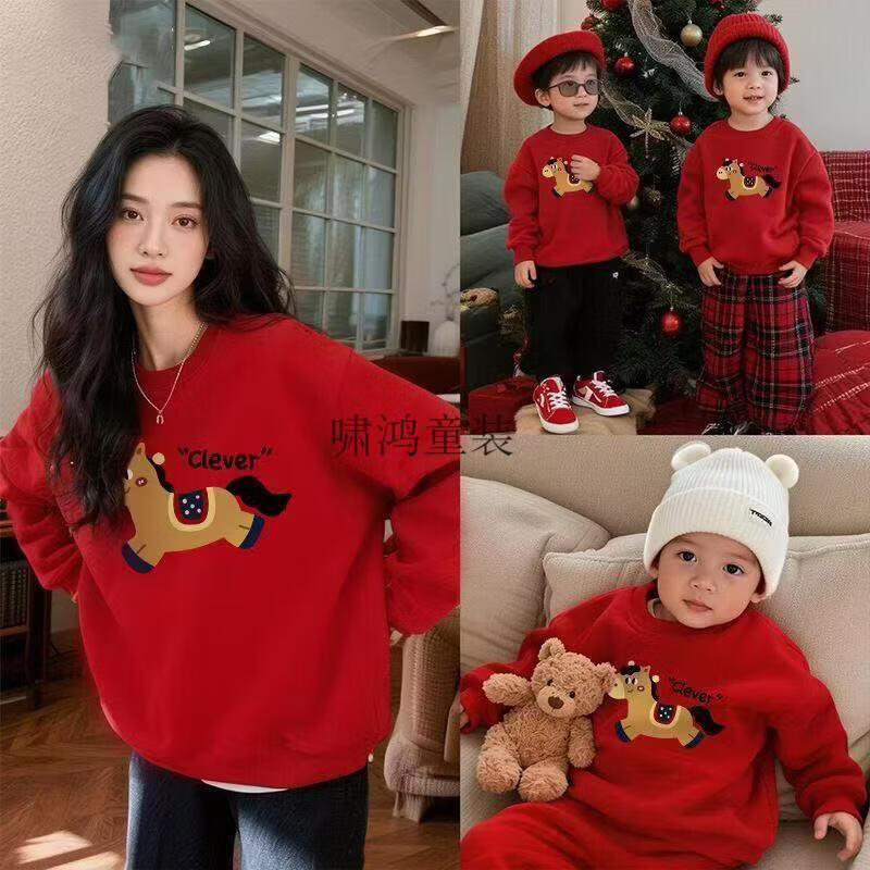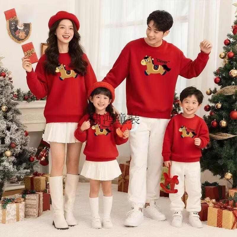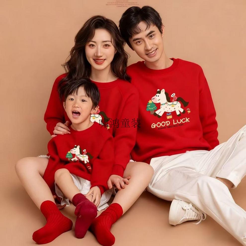 Wooden house parent-child wear 400g plus velvet thick red sweatshirt Year of the Horse New Year's greetings clothing for a family of four New Year's party uniforms custom embroidery Main picture pony (plus velvet style) 165 S (100 Jin Jin is equal to less than 0.5 kg) card code shot small
