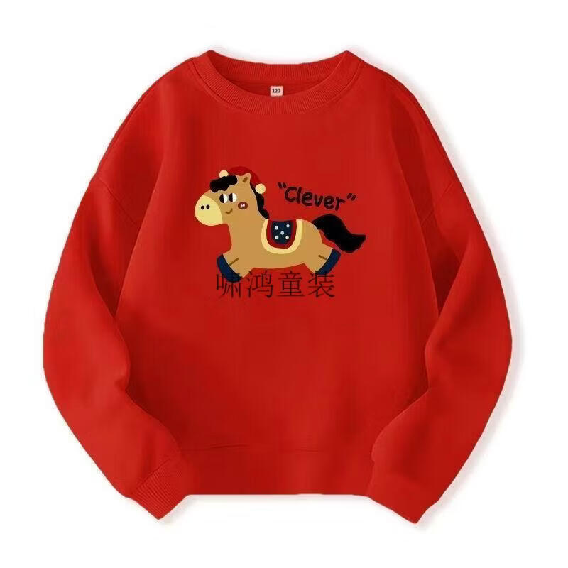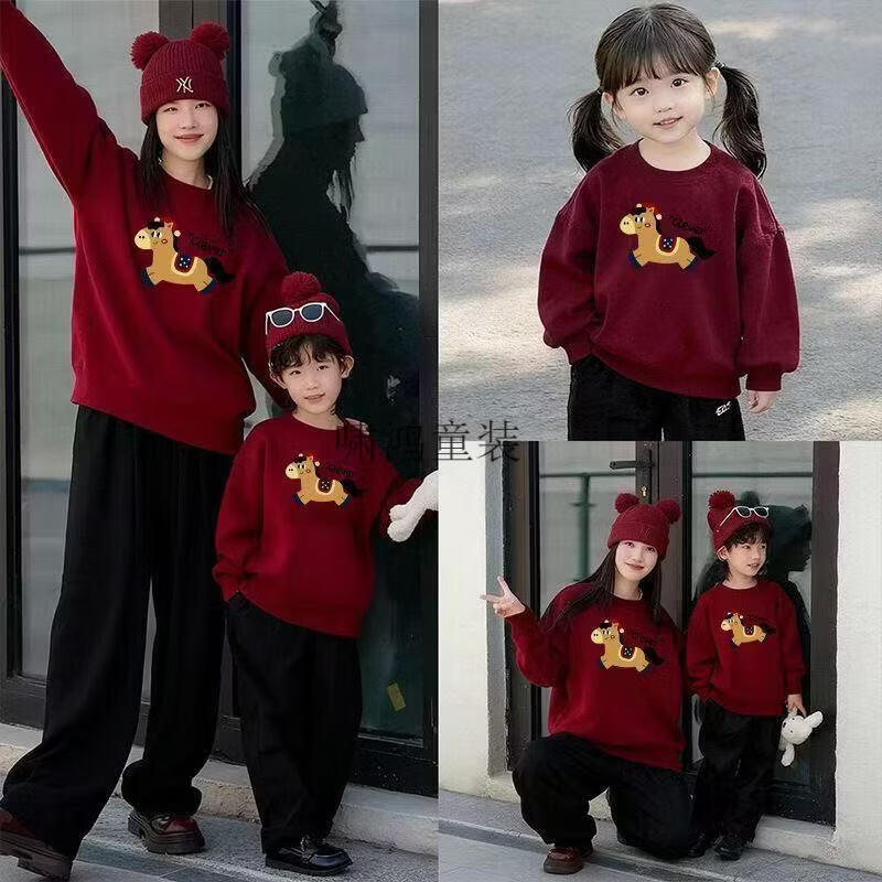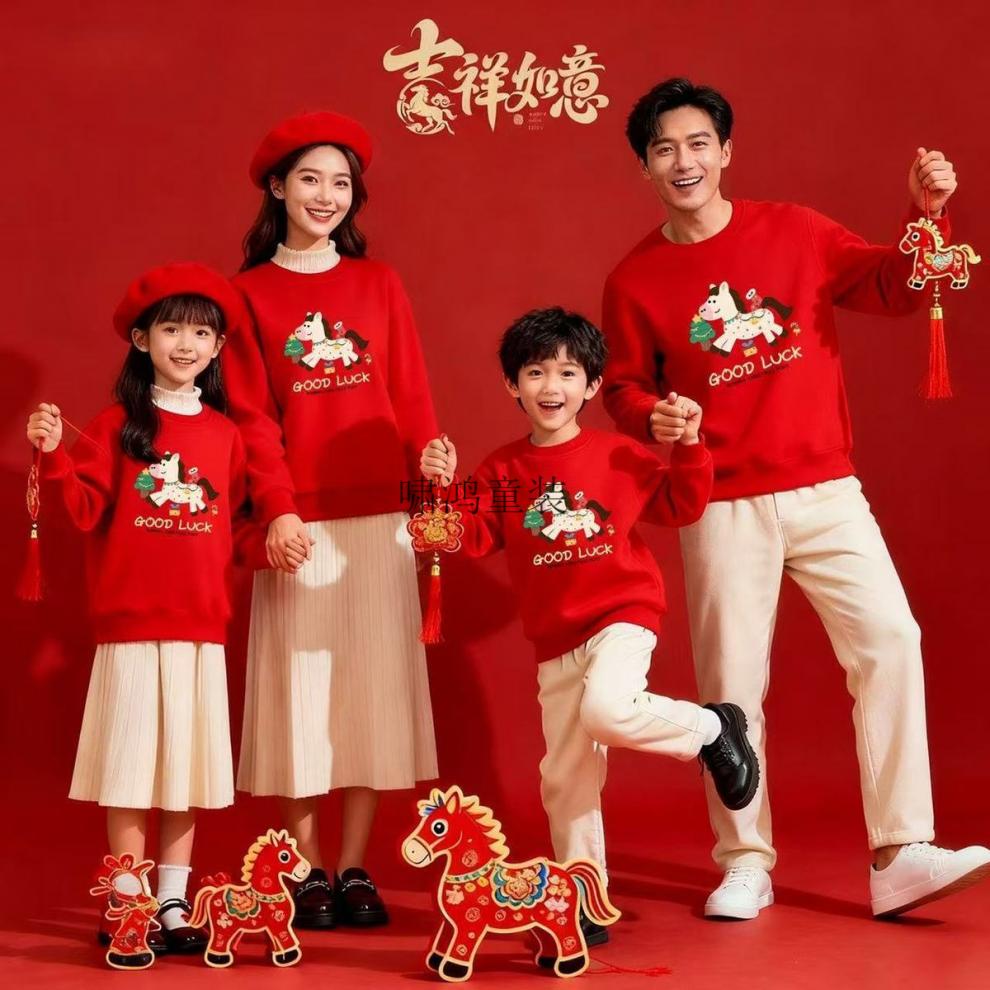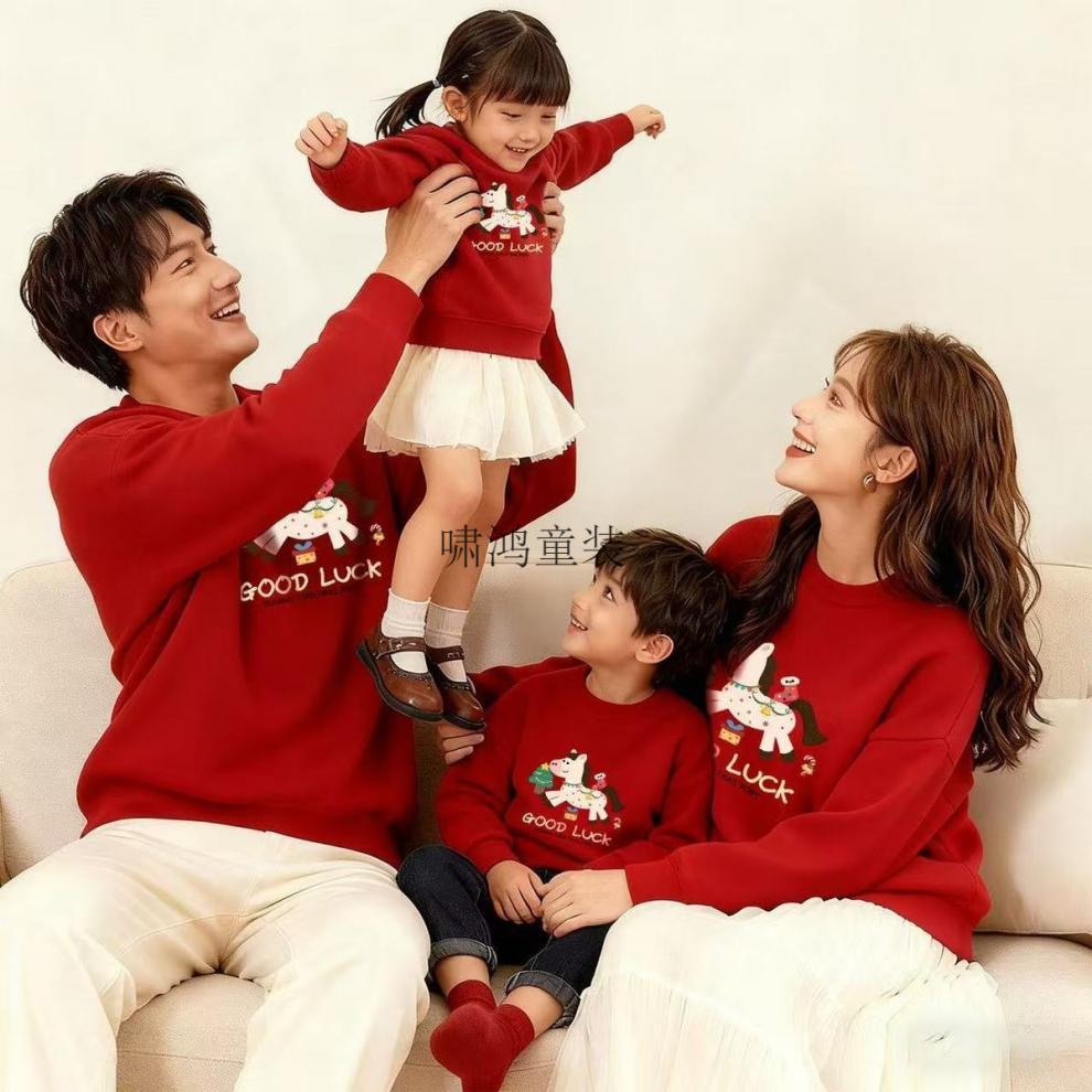 Wooden house parent-child wear 400g plus velvet thick red sweatshirt Year of the Horse New Year's greetings clothing for a family of four New Year's party uniforms custom embroidery Main picture pony (plus velvet style) 165 S (100 Jin Jin is equal to less than 0.5 kg) card code shot small