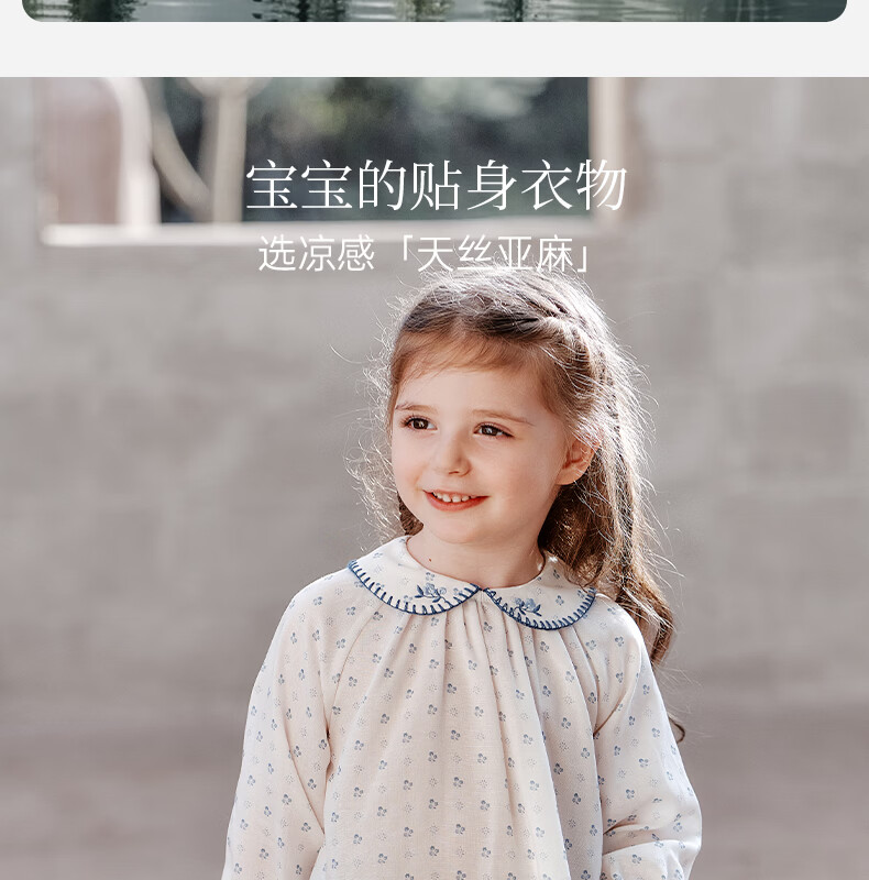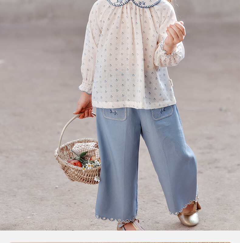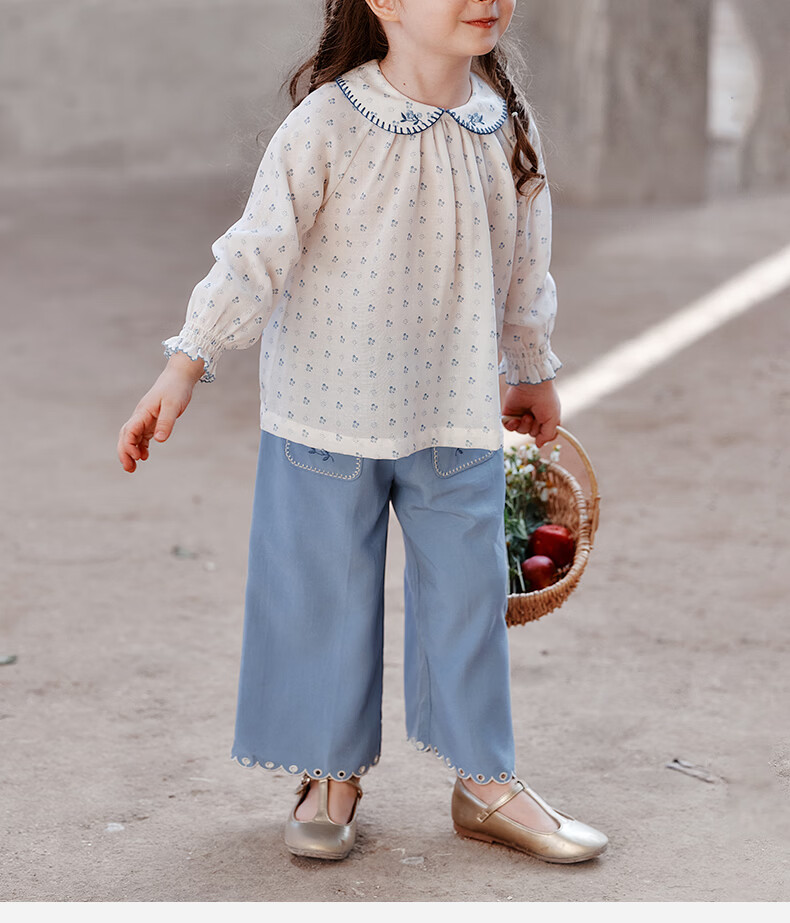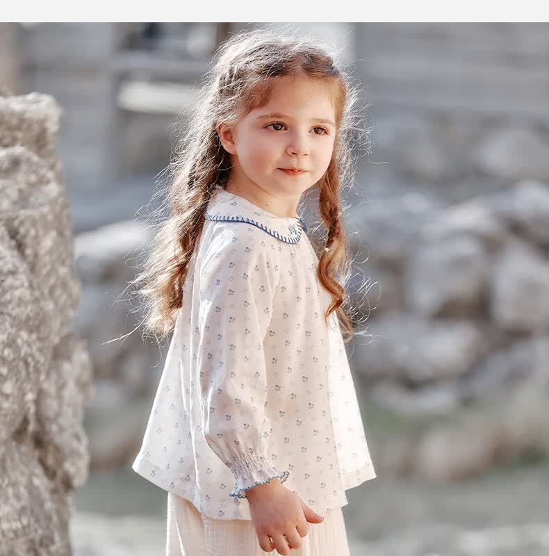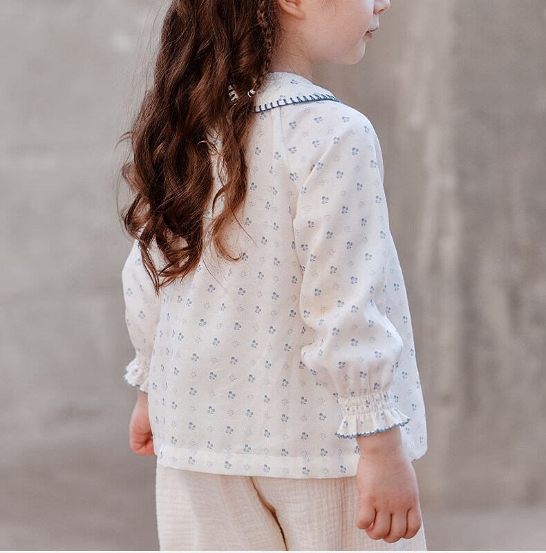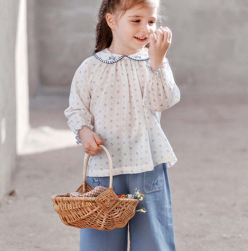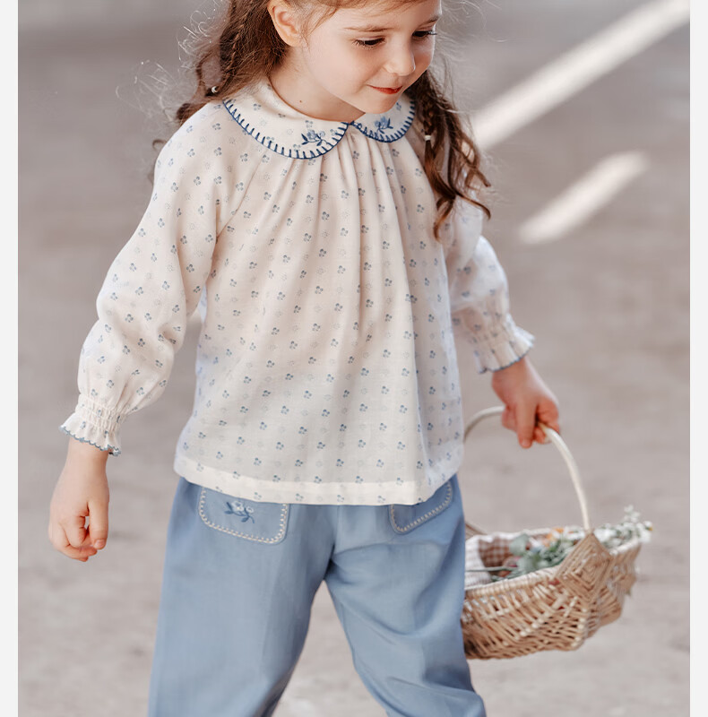 OAK FAMILY2026 spring children's Tencel linen long-sleeved tops girls baby loose T-shirt small blue flower 80