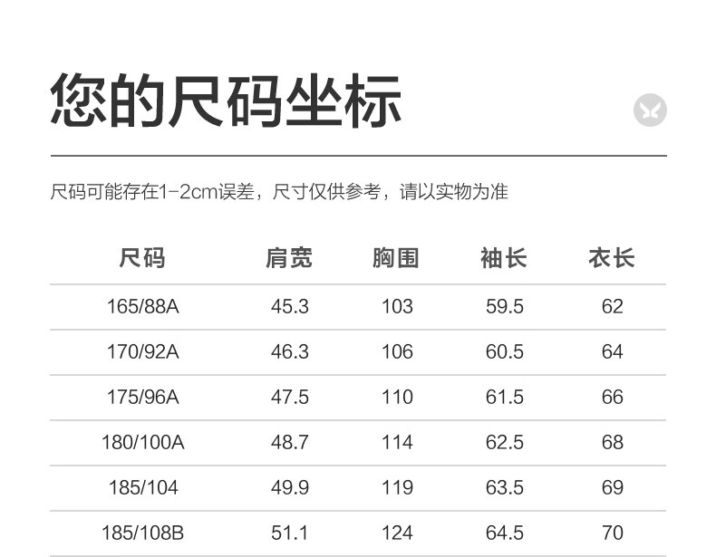 China (cm) 165 / 88-90 170 / 96-98 175 / 108-110 180 / 118-122 185 / 126-130