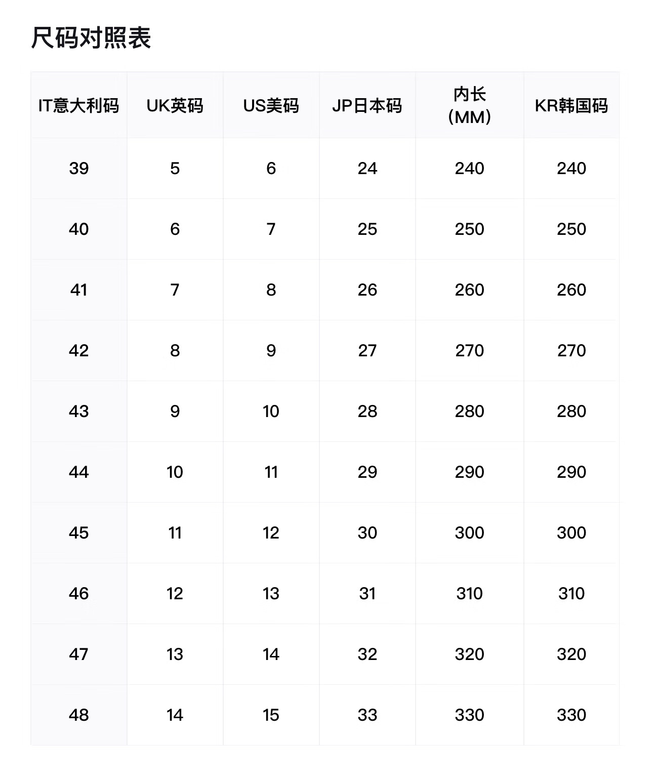 China (cm) 36 - 37 38 - 39 40 - 42 43 - 44 45 - 47