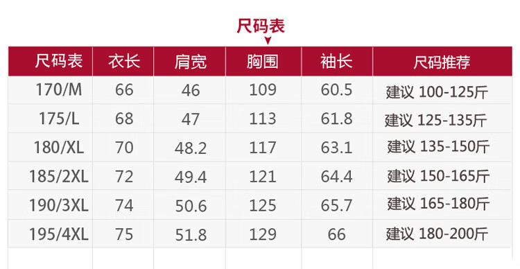 China (cm) 165 / 88-90 170 / 96-98 175 / 108-110 180 / 118-122 185 / 126-130