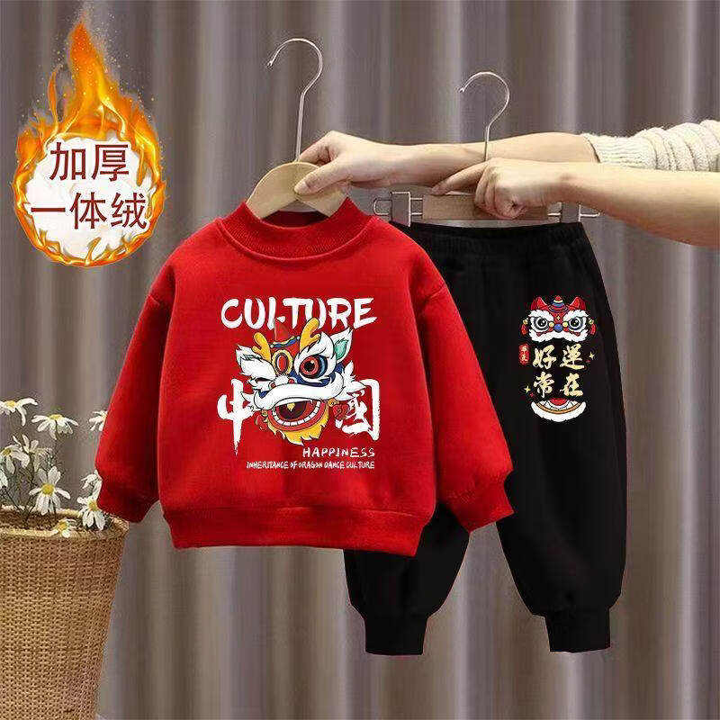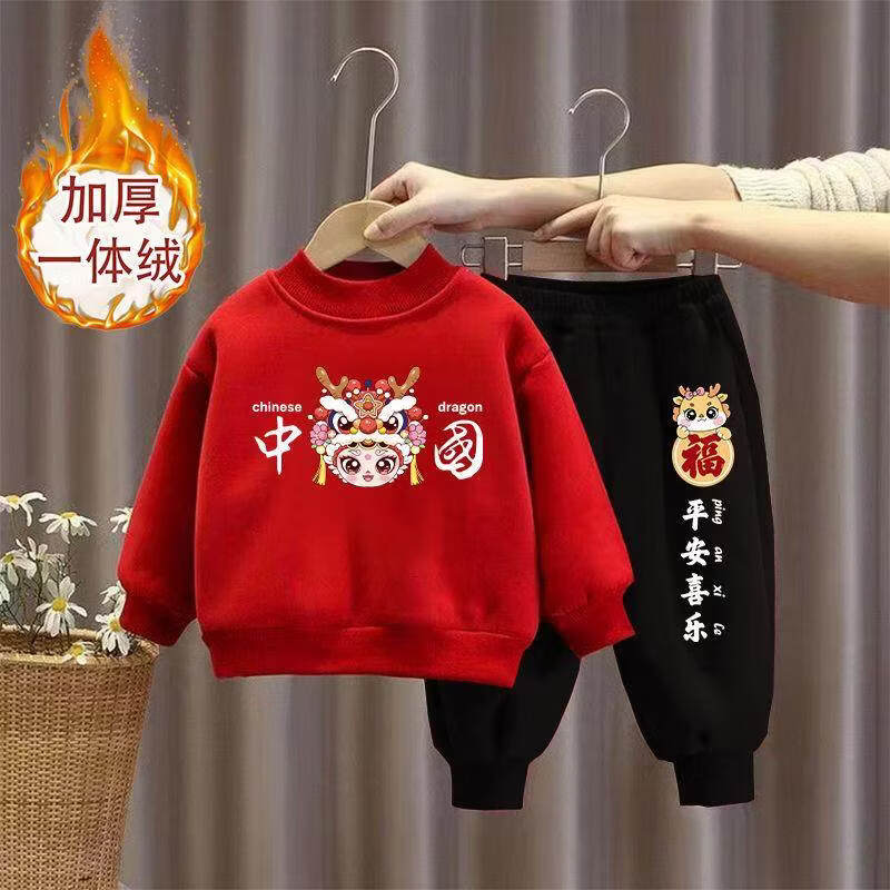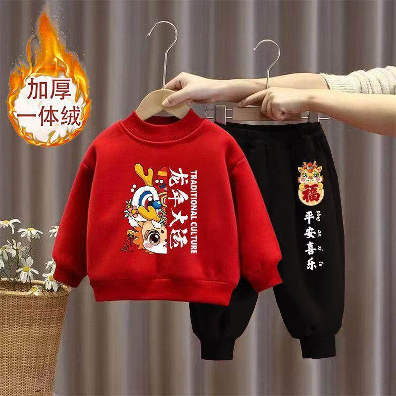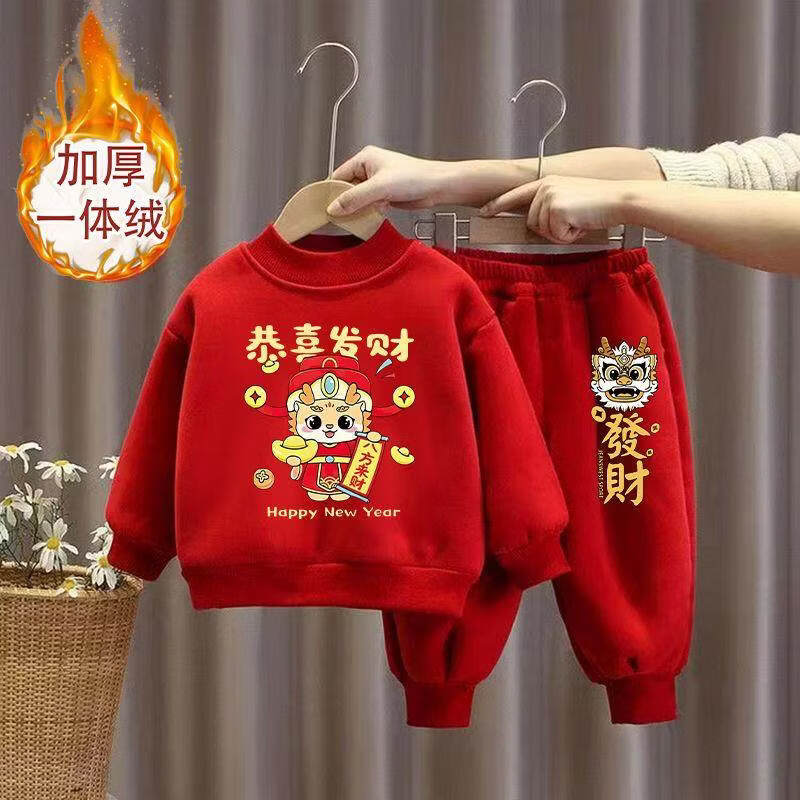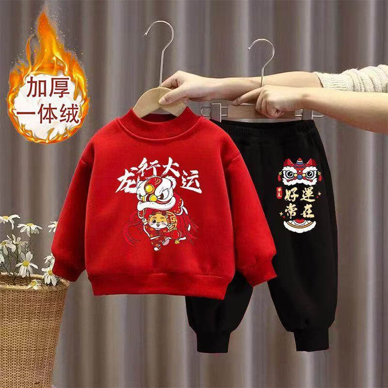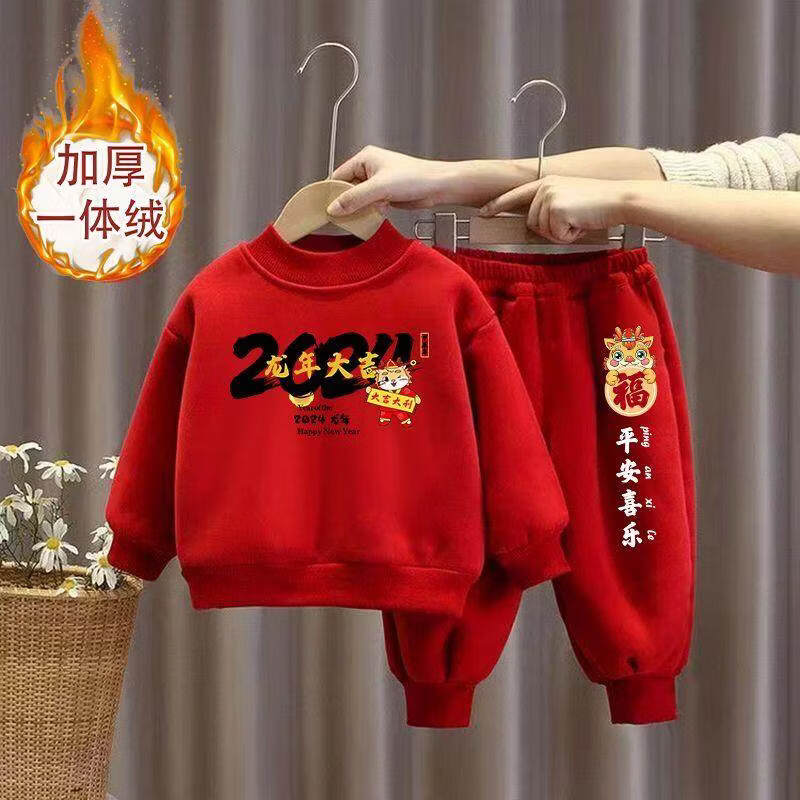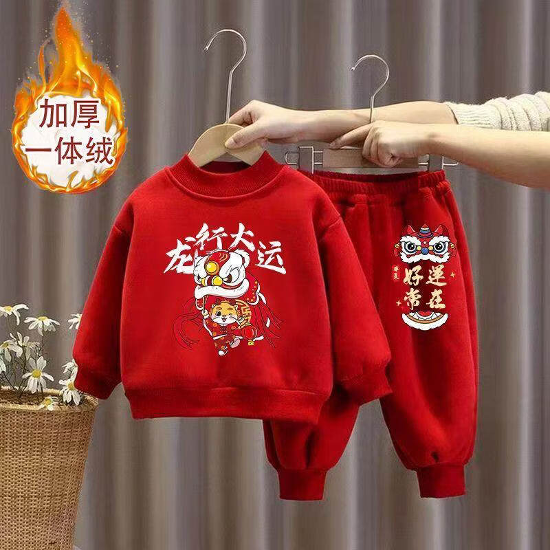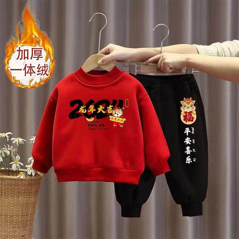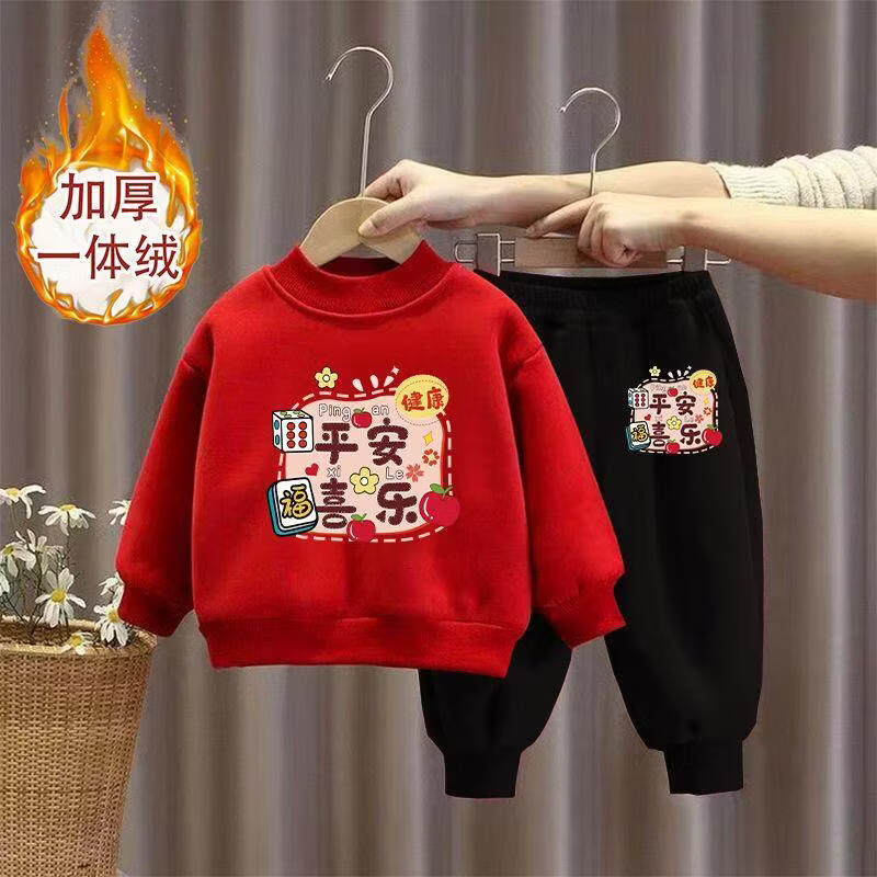 Hanqi boys and girls New Year's greetings suit New Year's suit plus velvet thickened baby sweatshirt children's red festive New Year's clothing autumn and winter style plus velvet round neck #red top + red pants R16 80 (recommended height 65-75CM)