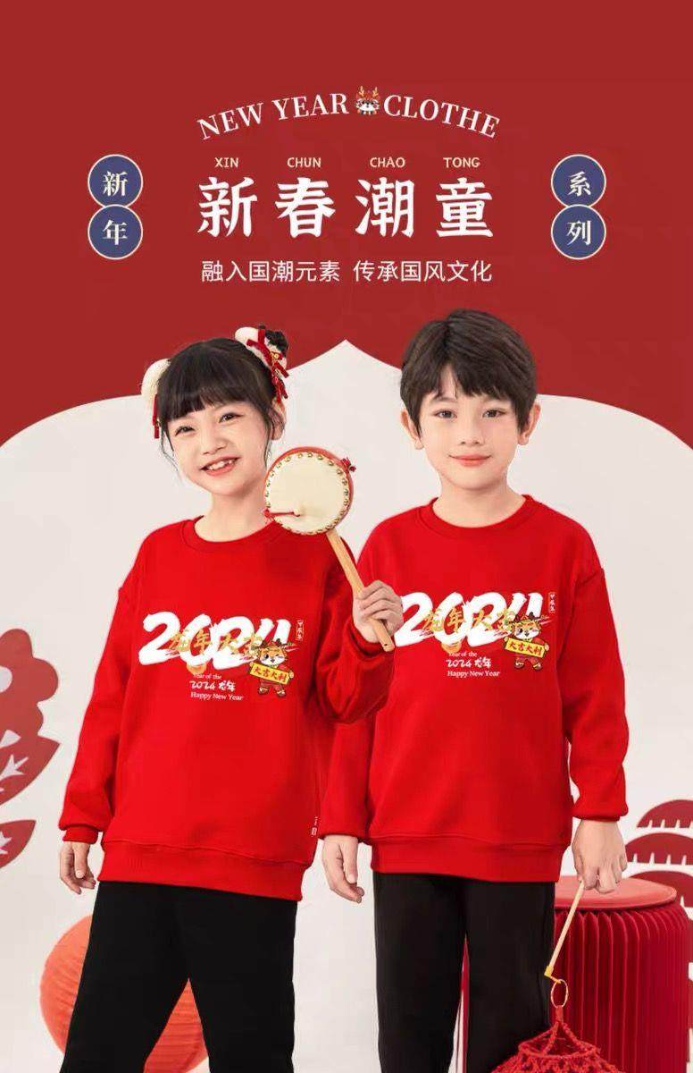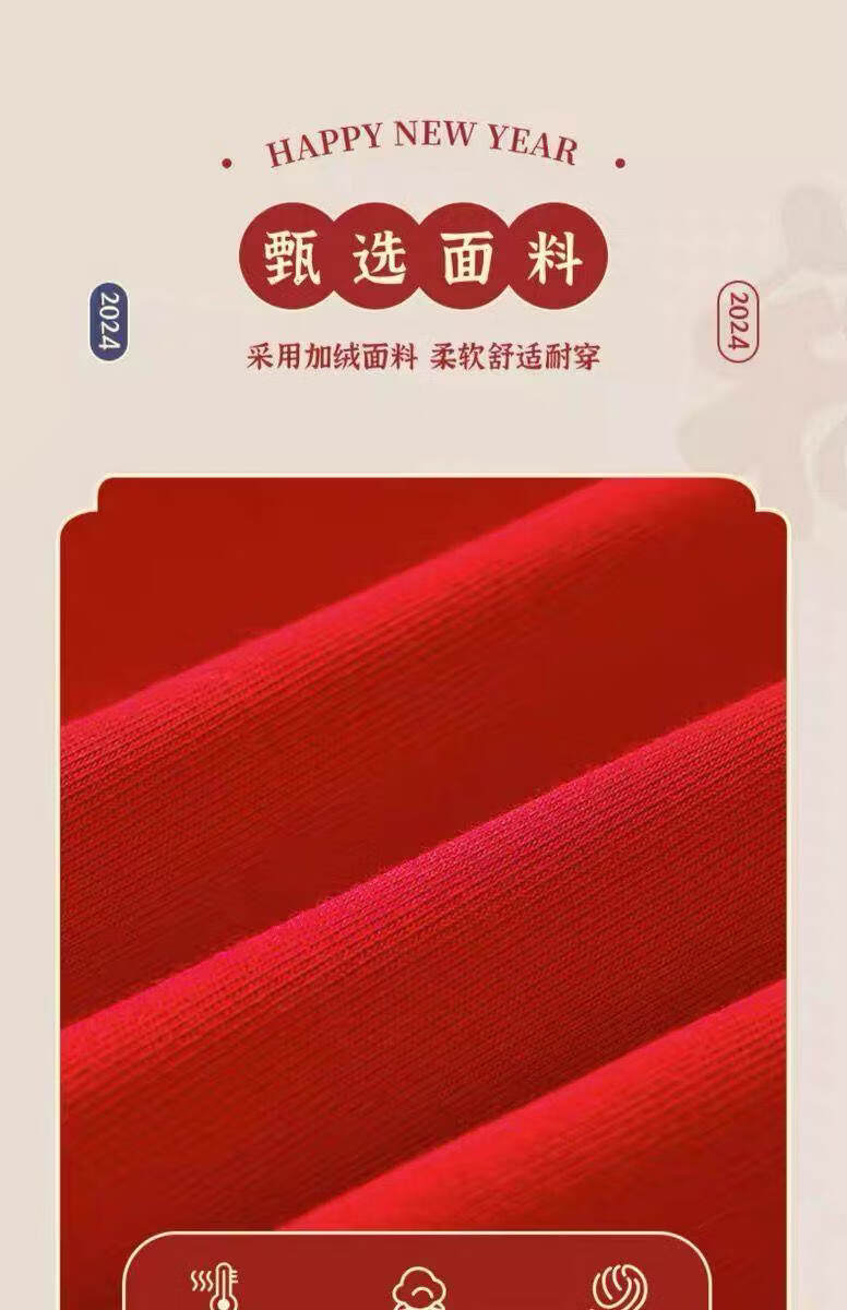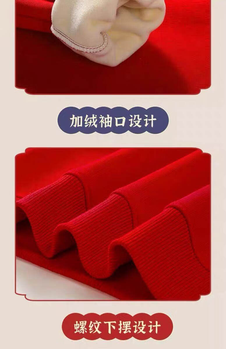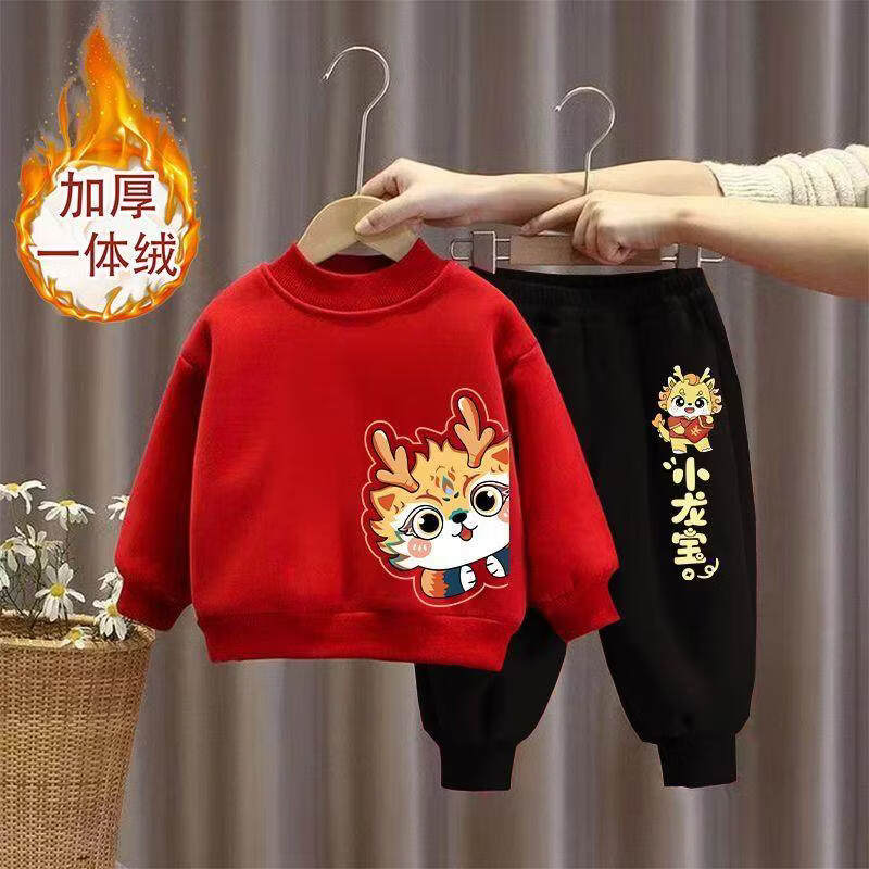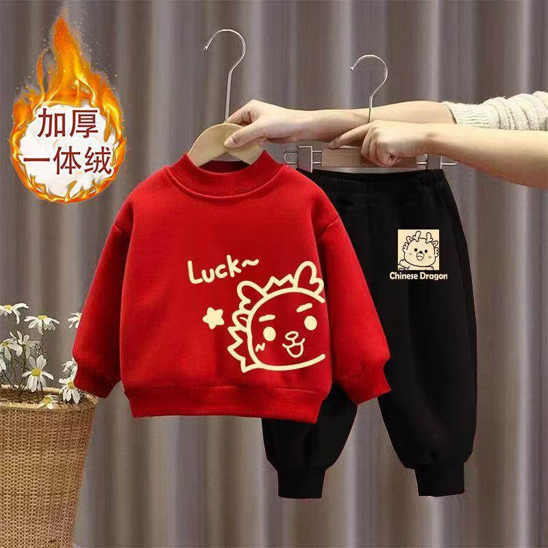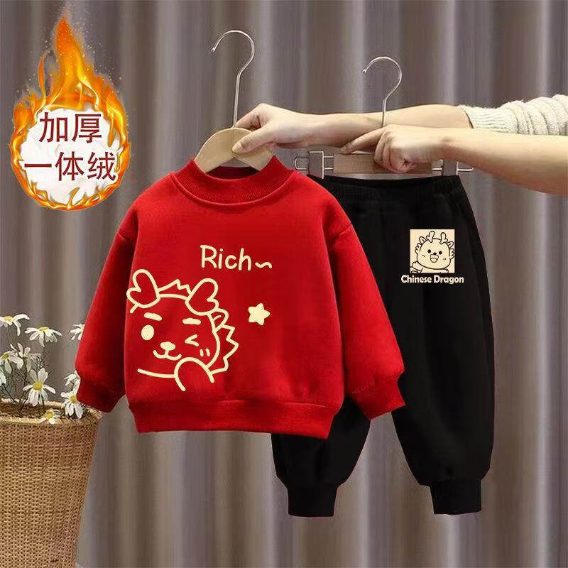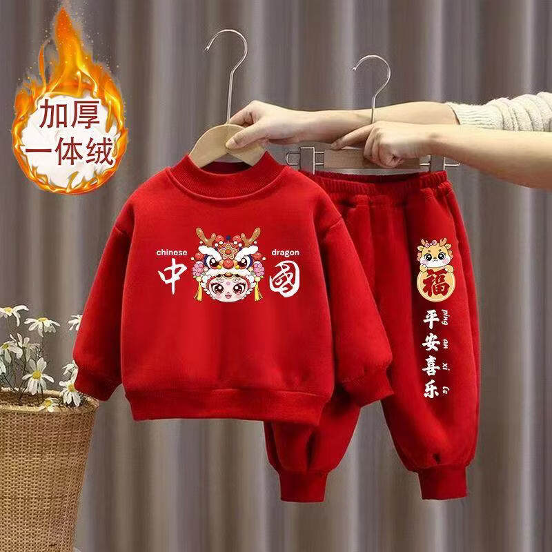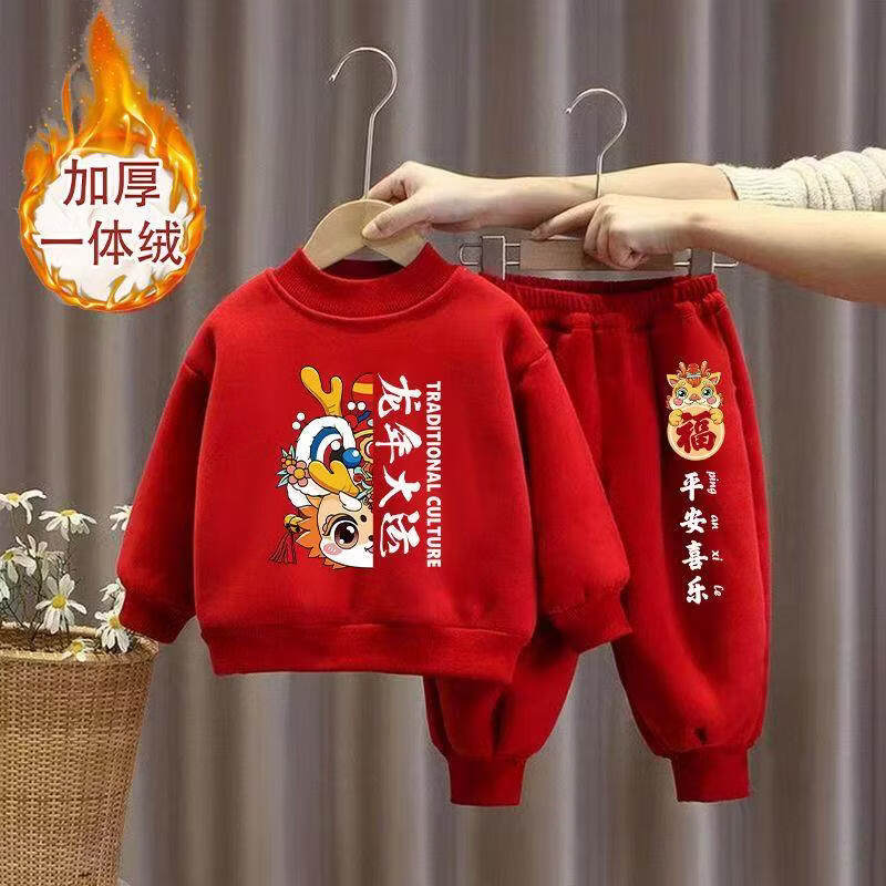 Hanqi boys and girls New Year's greetings suit New Year's suit plus velvet thickened baby sweatshirt children's red festive New Year's clothing autumn and winter style plus velvet round neck #red top + red pants R16 80 (recommended height 65-75CM)