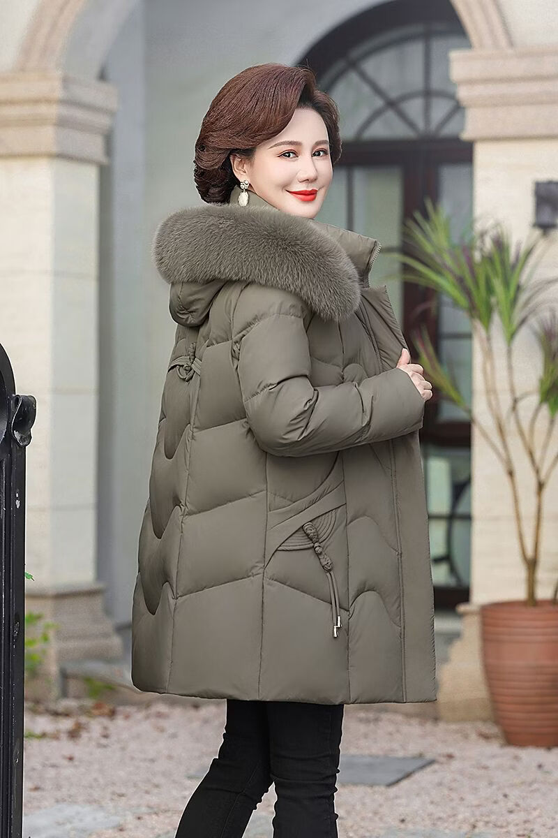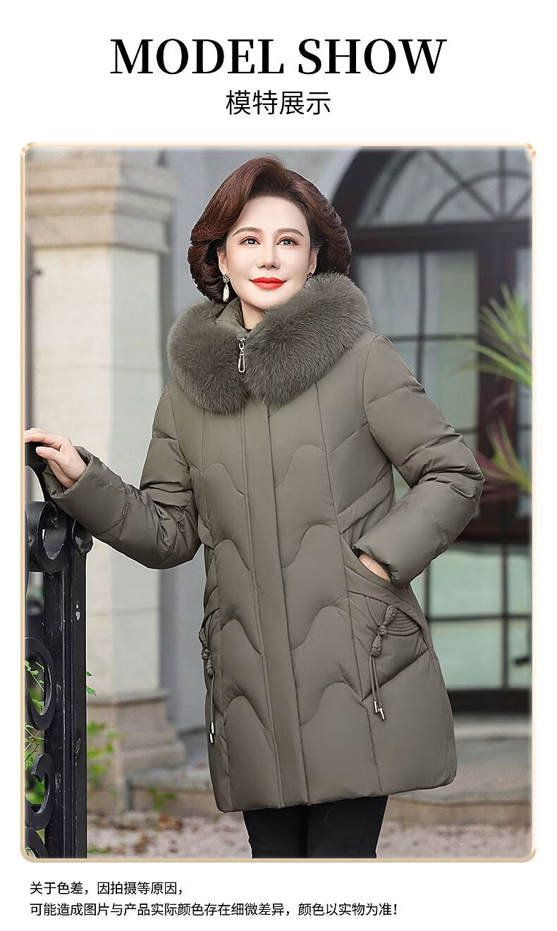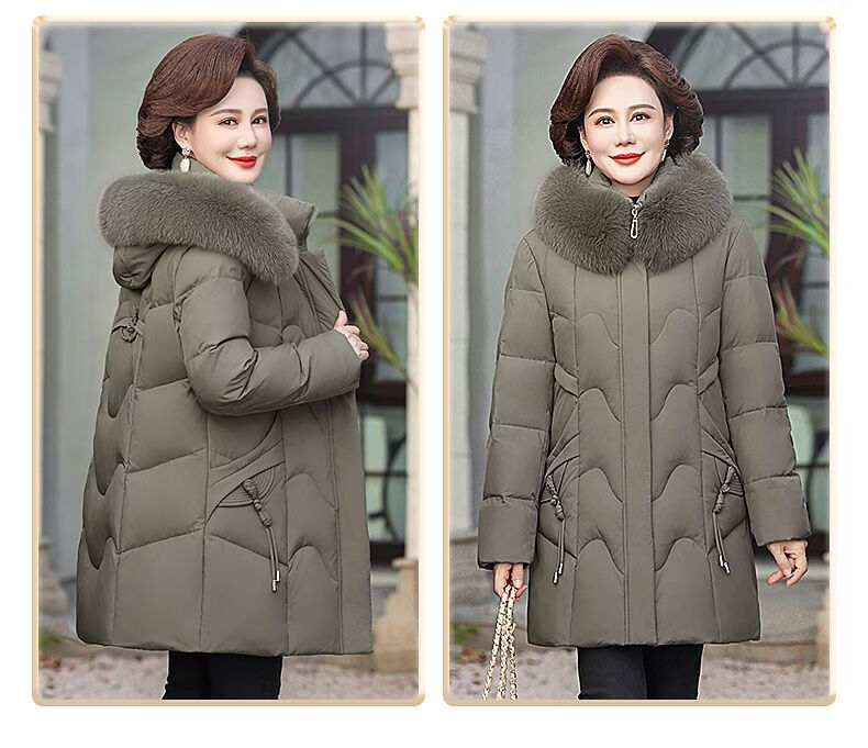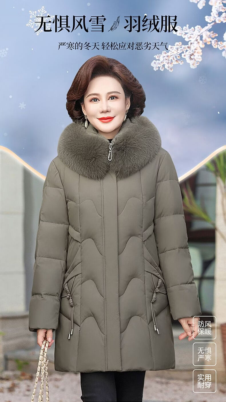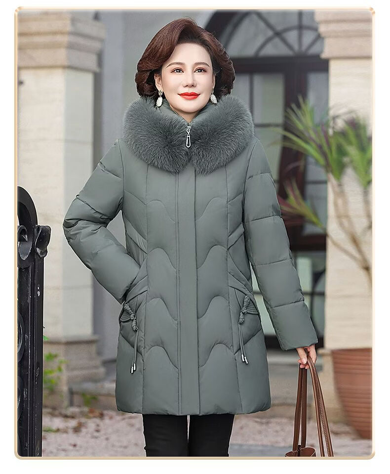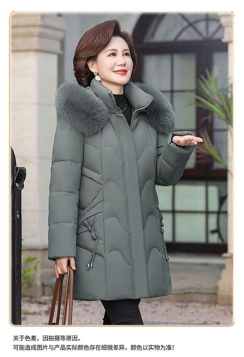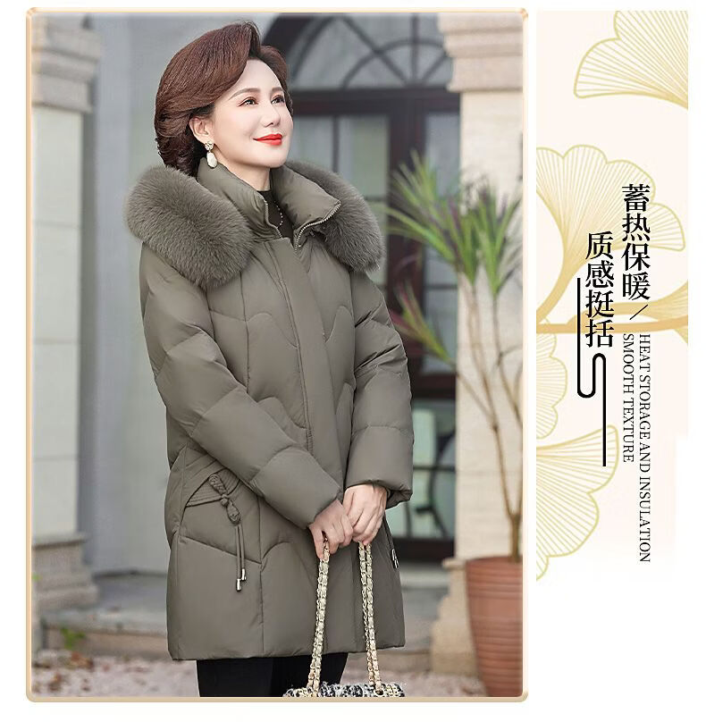 ROMON Mother's Down Jacket Winter Thickened White Duck Down Women's Mid-Length 2026 New Middle-aged and Elderly Fur Collar Mid-Length Jacket Green Card Hot Selling Index Five Stars Removable Hat XL Recommended 90-110 Jin Jin equals 0.5 kg
