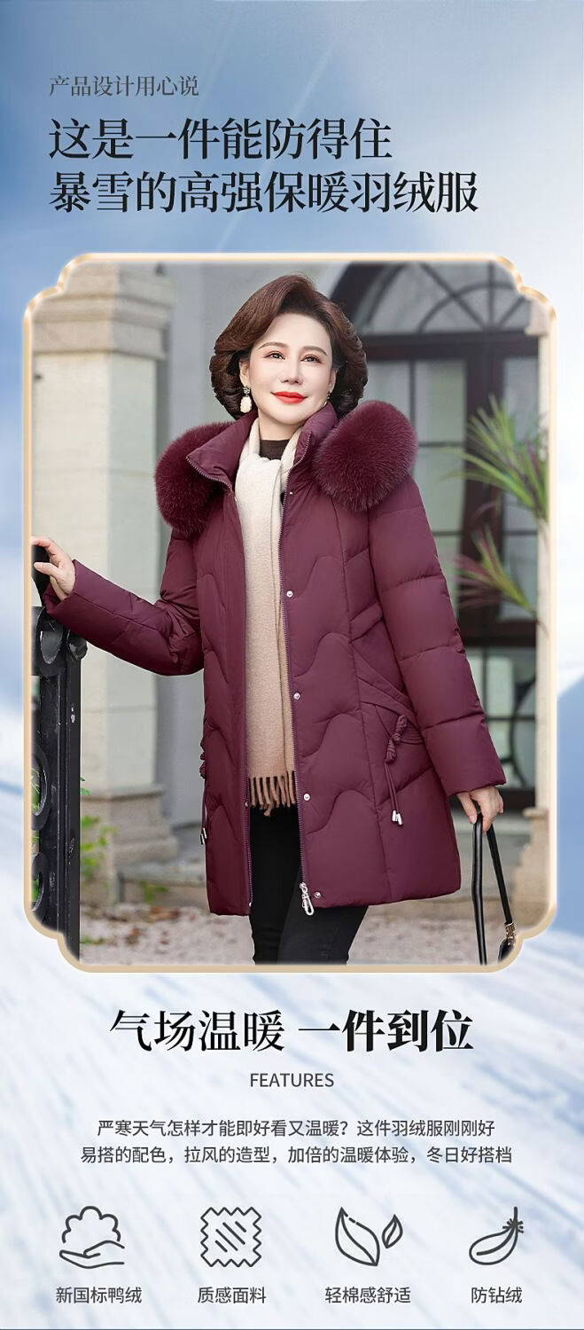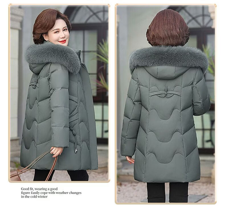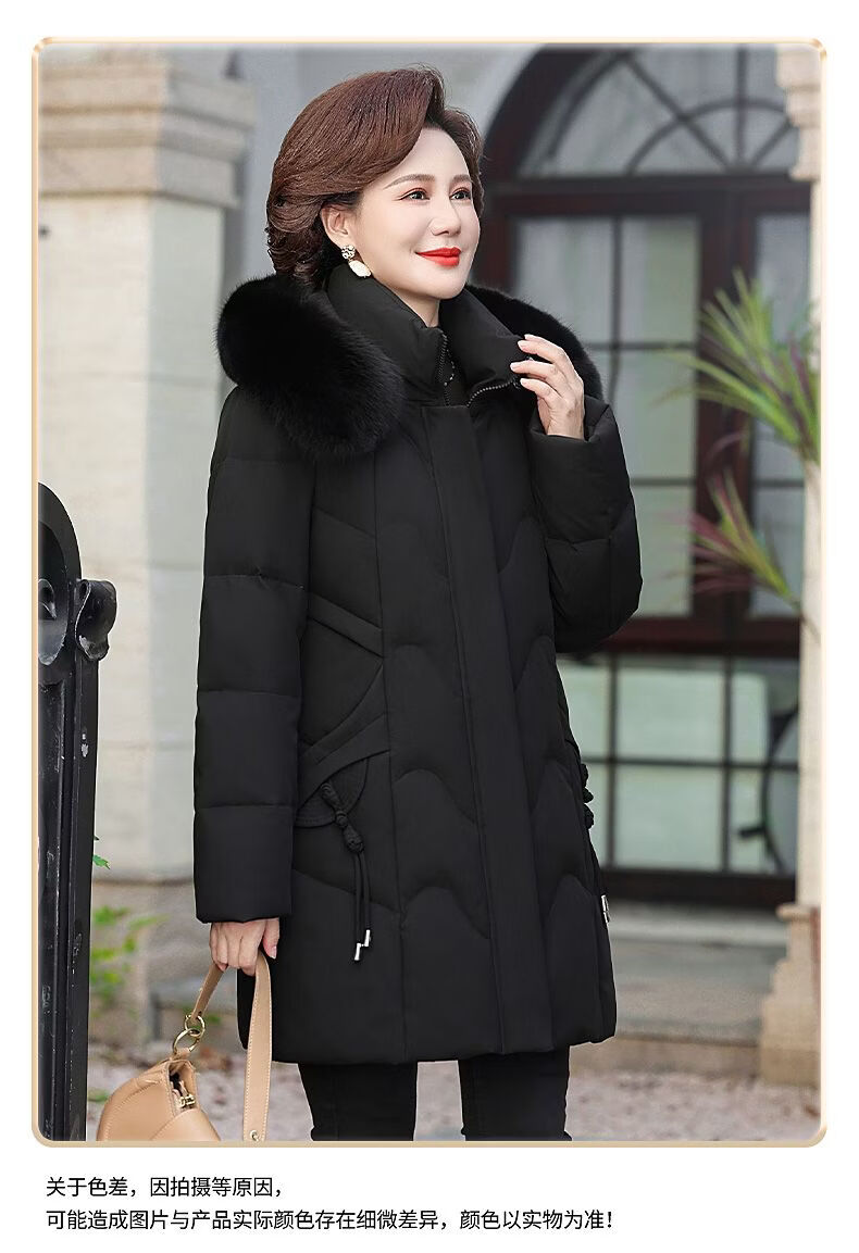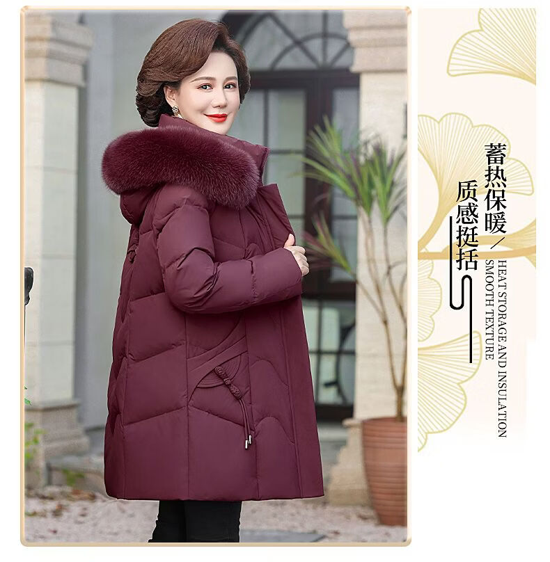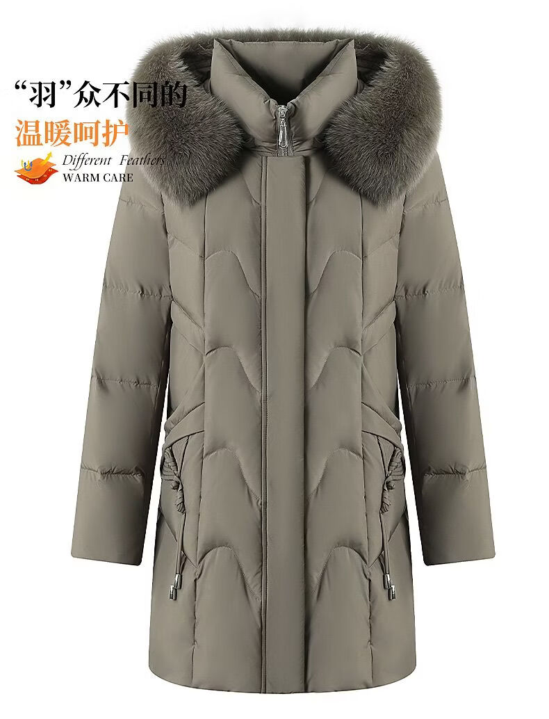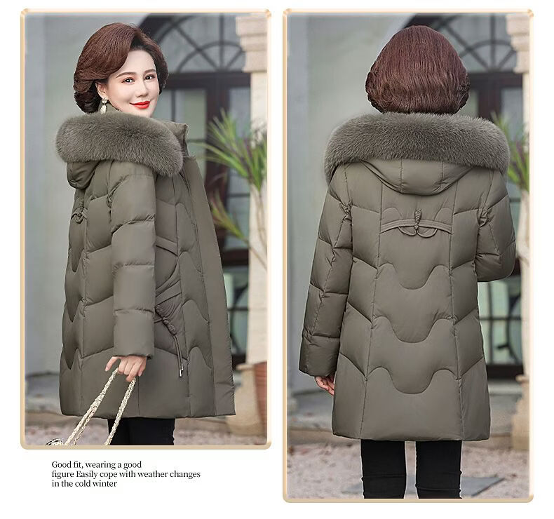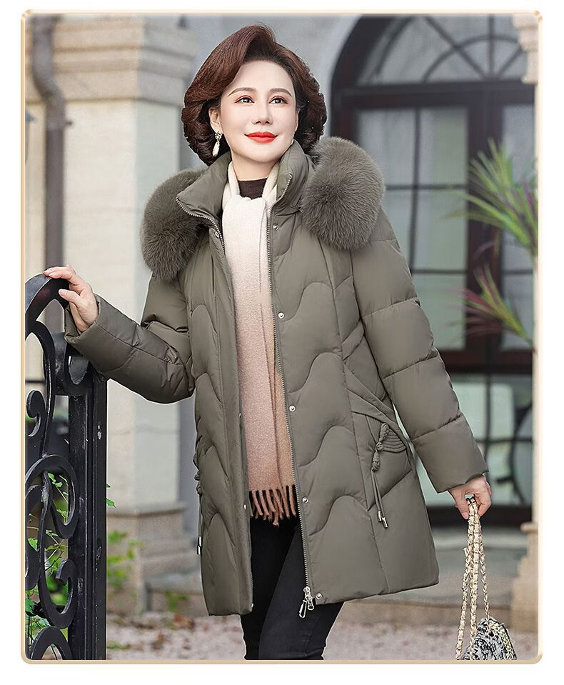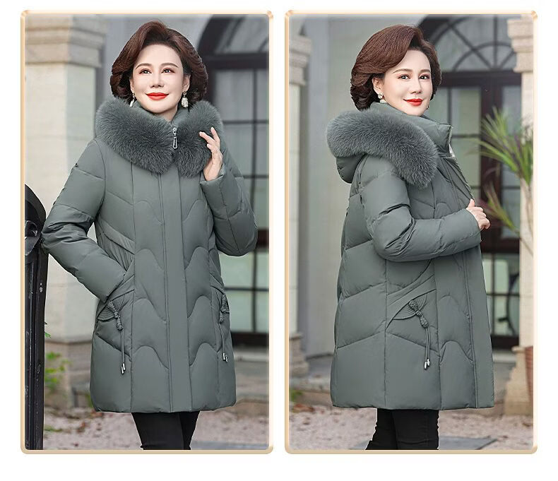 ROMON Mother's Down Jacket Winter Thickened White Duck Down Women's Mid-Length 2026 New Middle-aged and Elderly Fur Collar Mid-Length Jacket Green Card Hot Selling Index Five Stars Removable Hat XL Recommended 90-110 Jin Jin equals 0.5 kg