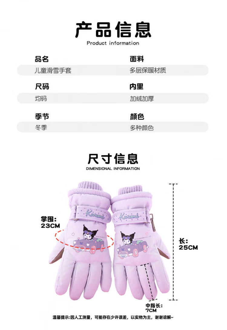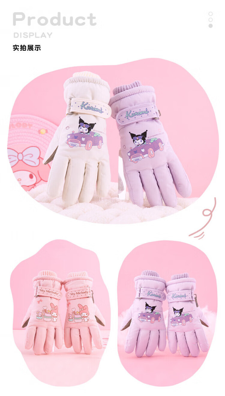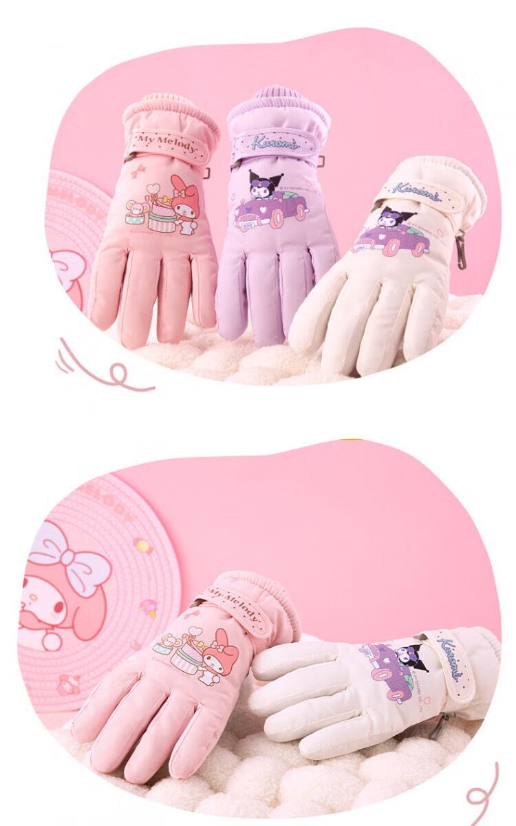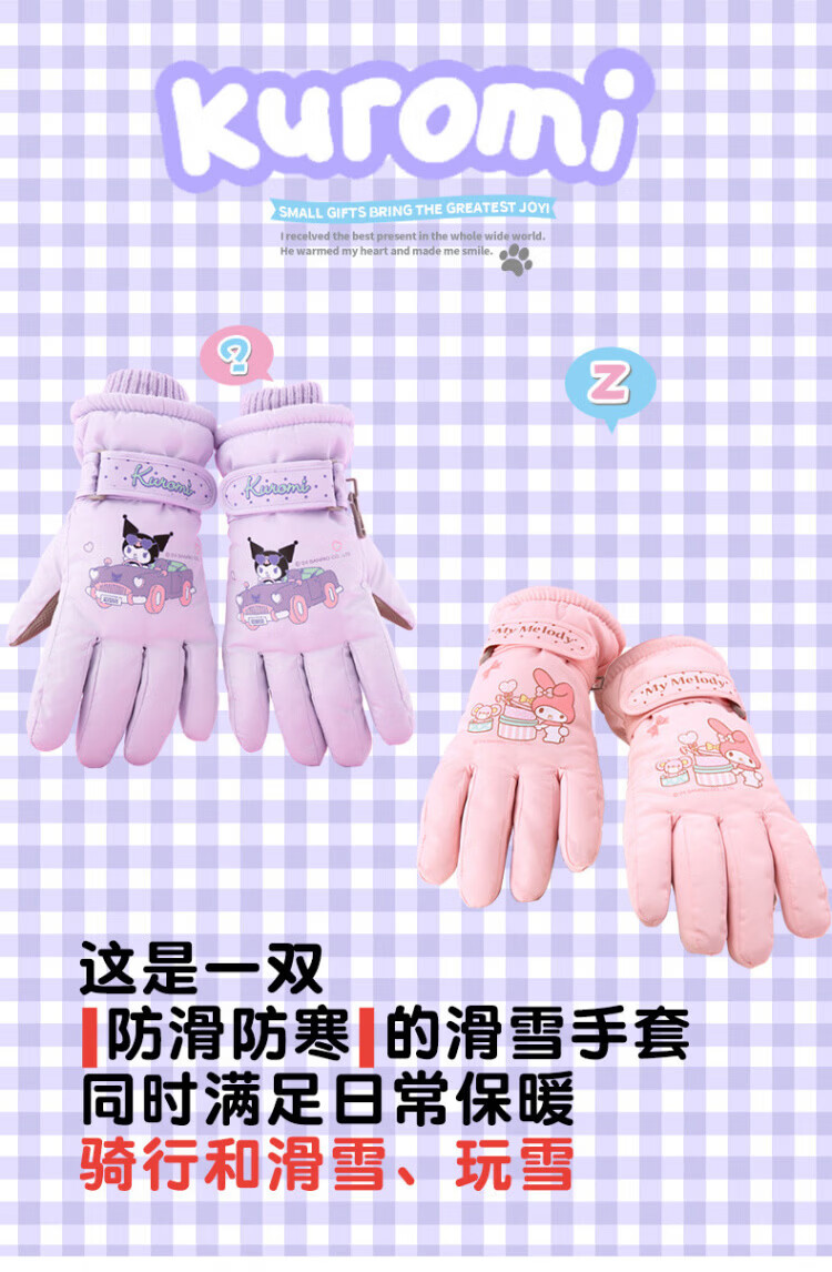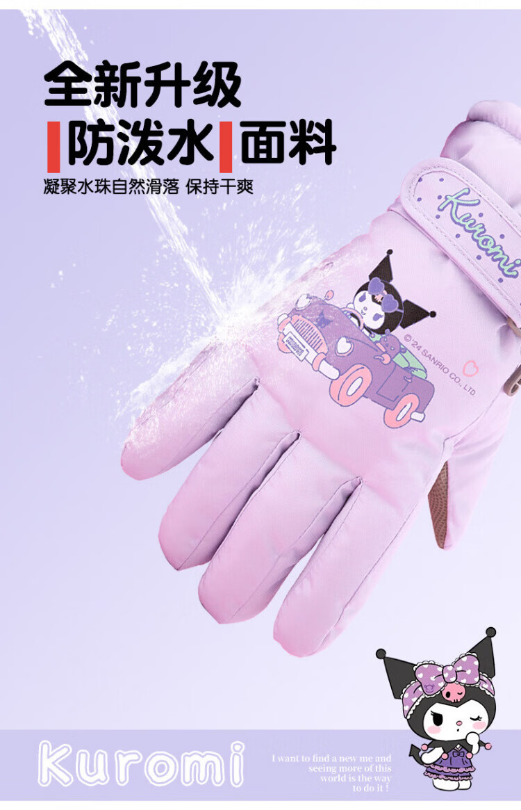 Disney children's down gloves for skiing and playing in the snow, Harbin Kuromi winter baby waterproof plus velvet and thickened cotton to keep warm, purple, older children (8-12 years old), free anti-lost rope, one size fits all