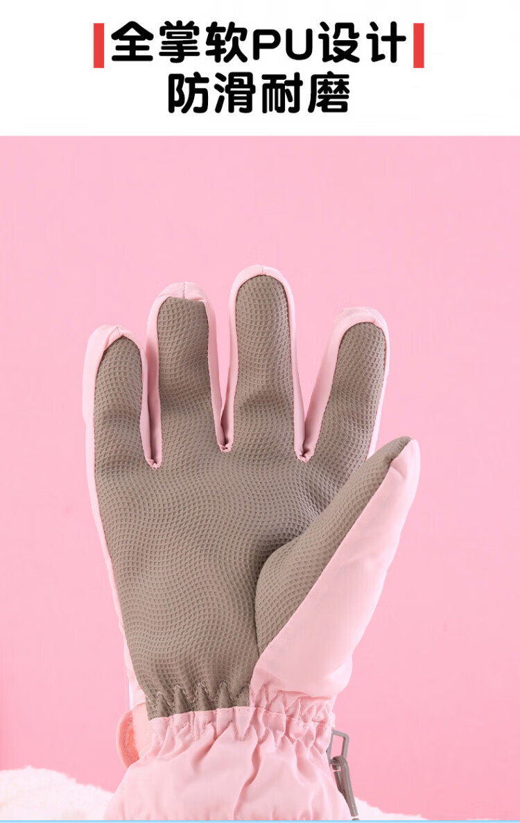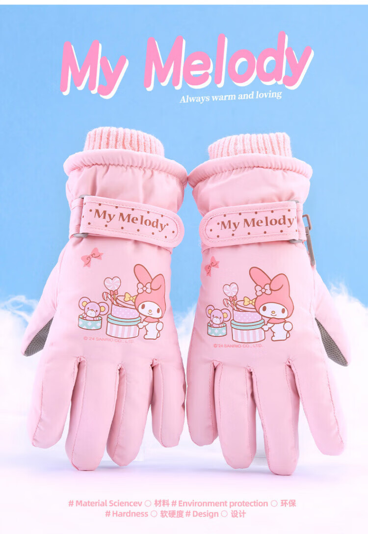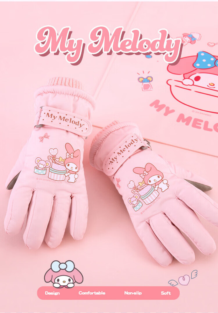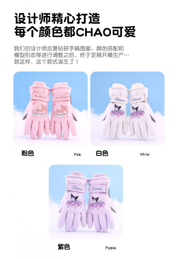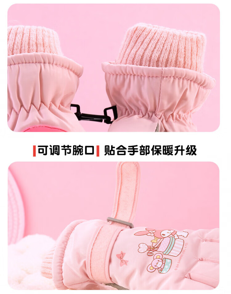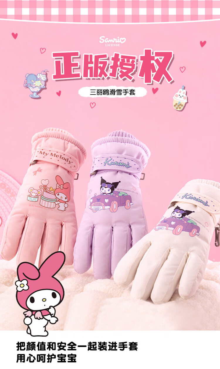 Disney children's down gloves for skiing and playing in the snow, Harbin Kuromi winter baby waterproof plus velvet and thickened cotton to keep warm, purple, older children (8-12 years old), free anti-lost rope, one size fits all