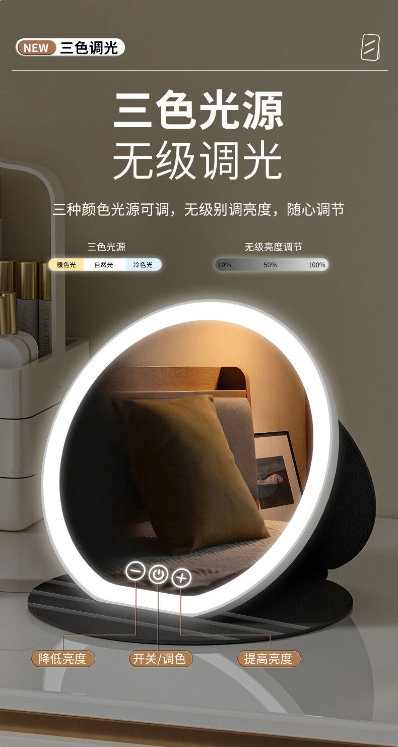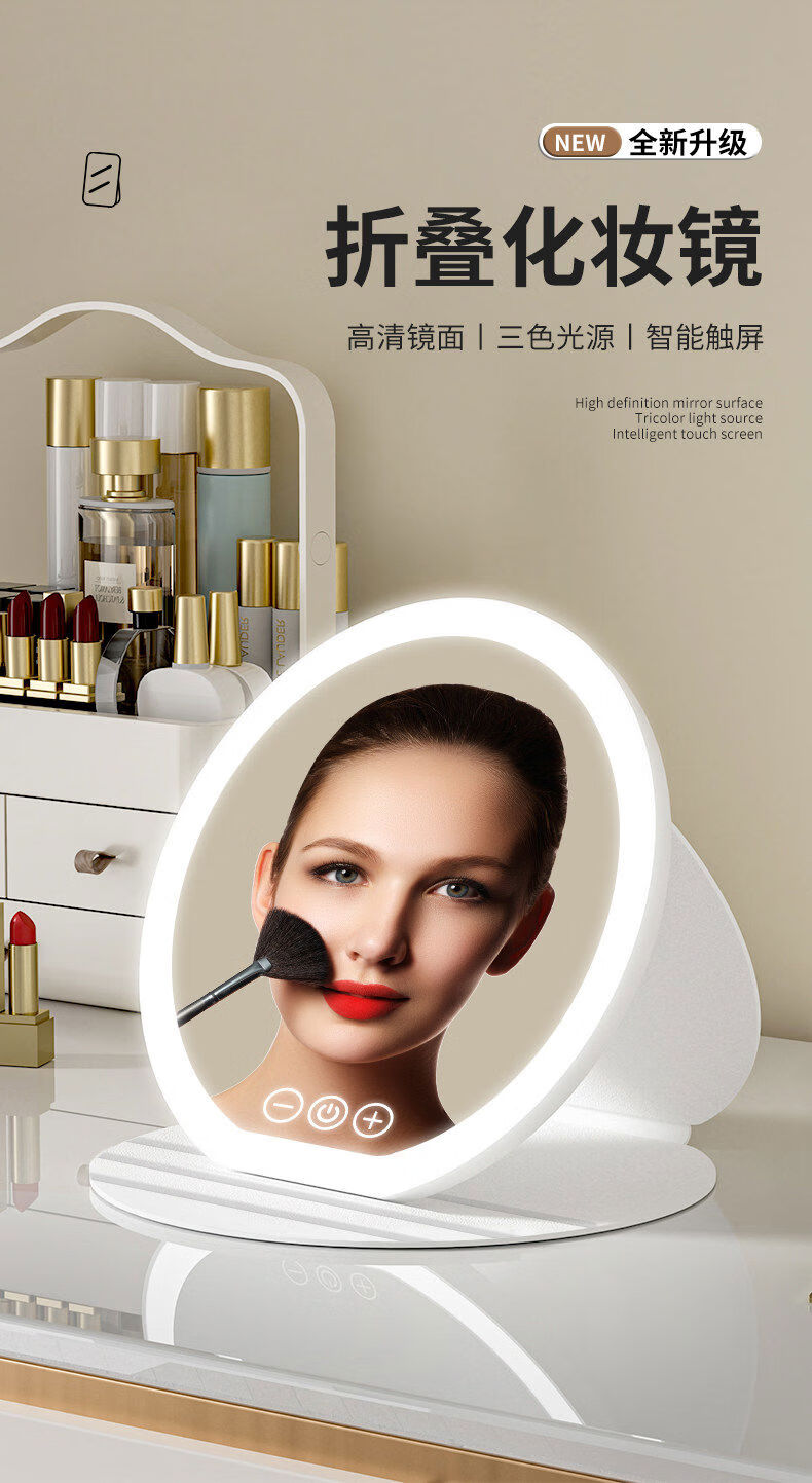 LED round makeup mirror folding with light convenient student dormitory office desktop desktop makeup mirror ultra high definition black enlarged mirror high definition three-color light suitable for desktop
