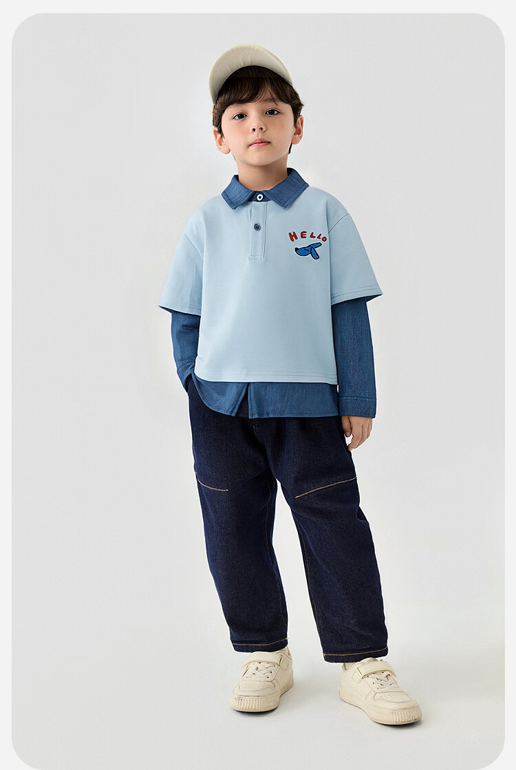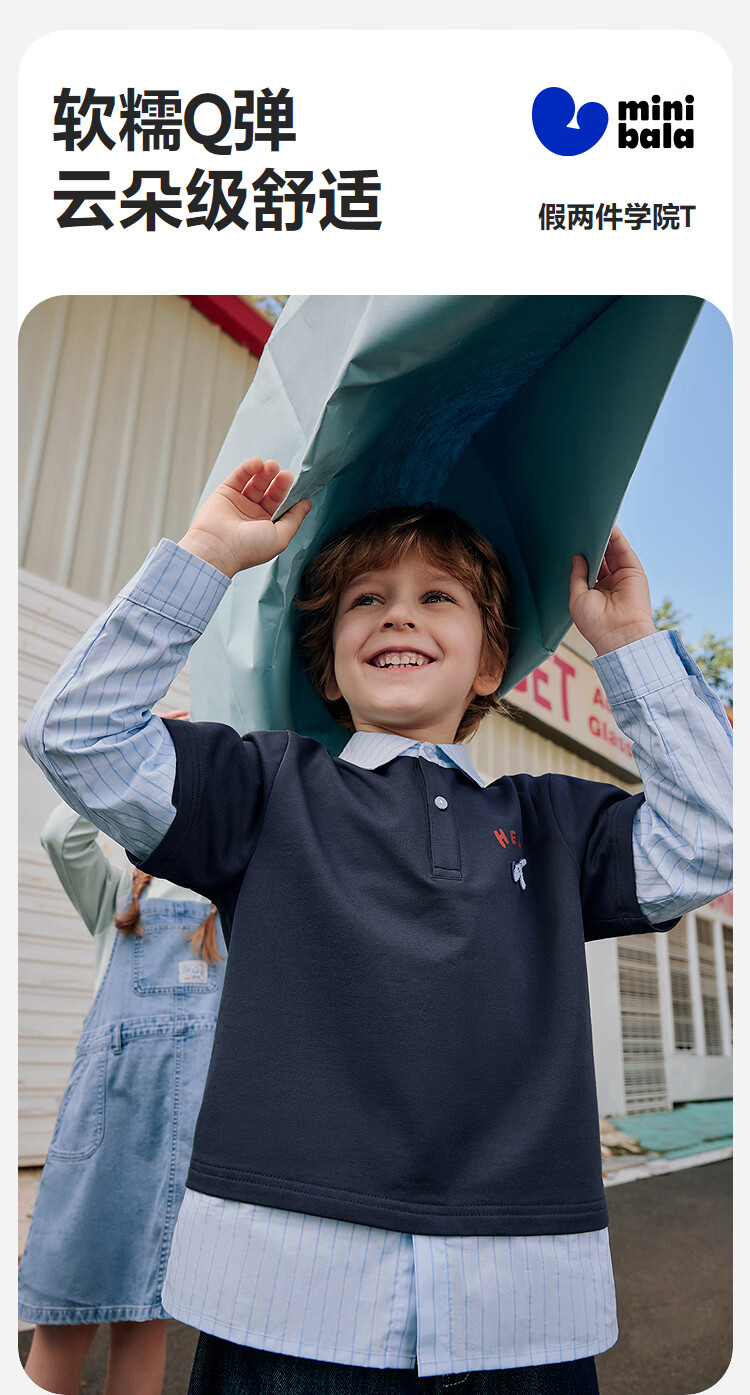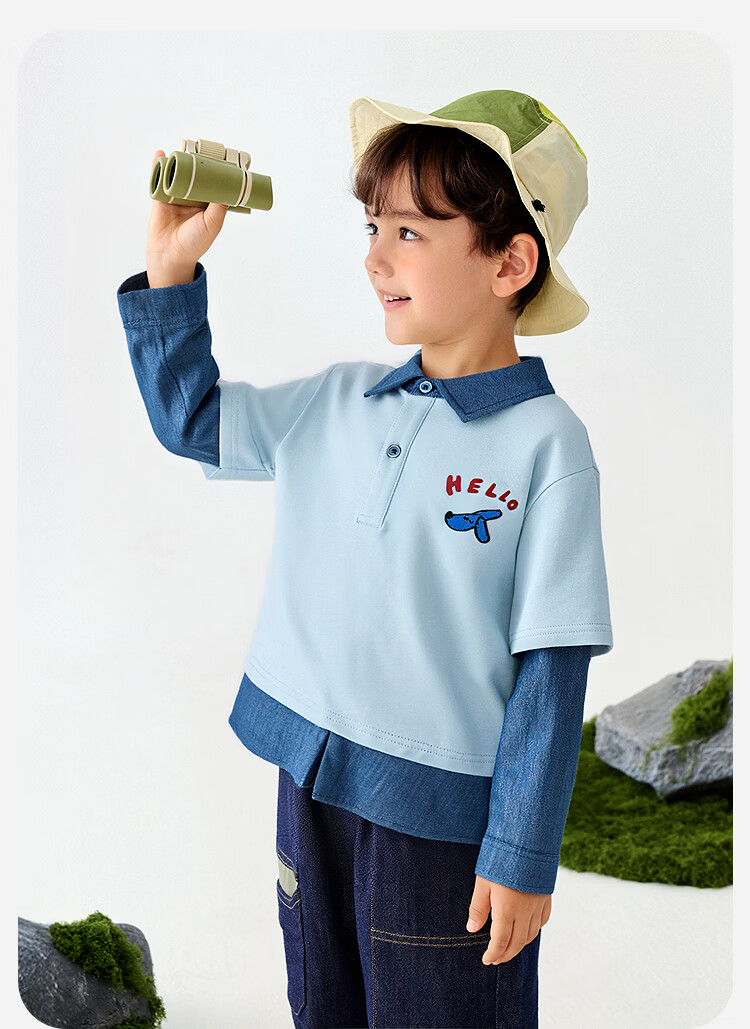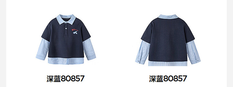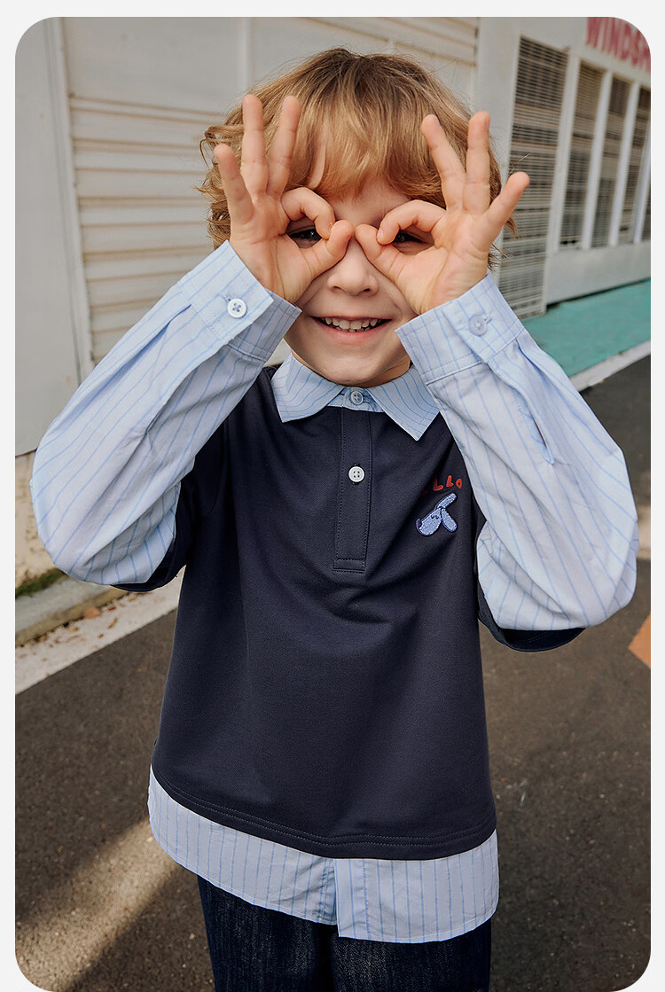 Mini Bala (minibala) boys and children fake two-piece long-sleeved T-shirt spring new soft and comfortable elastic college style top dark blue 80857 150