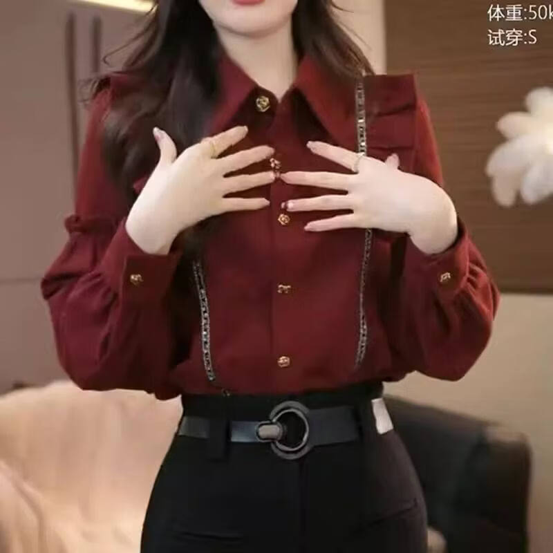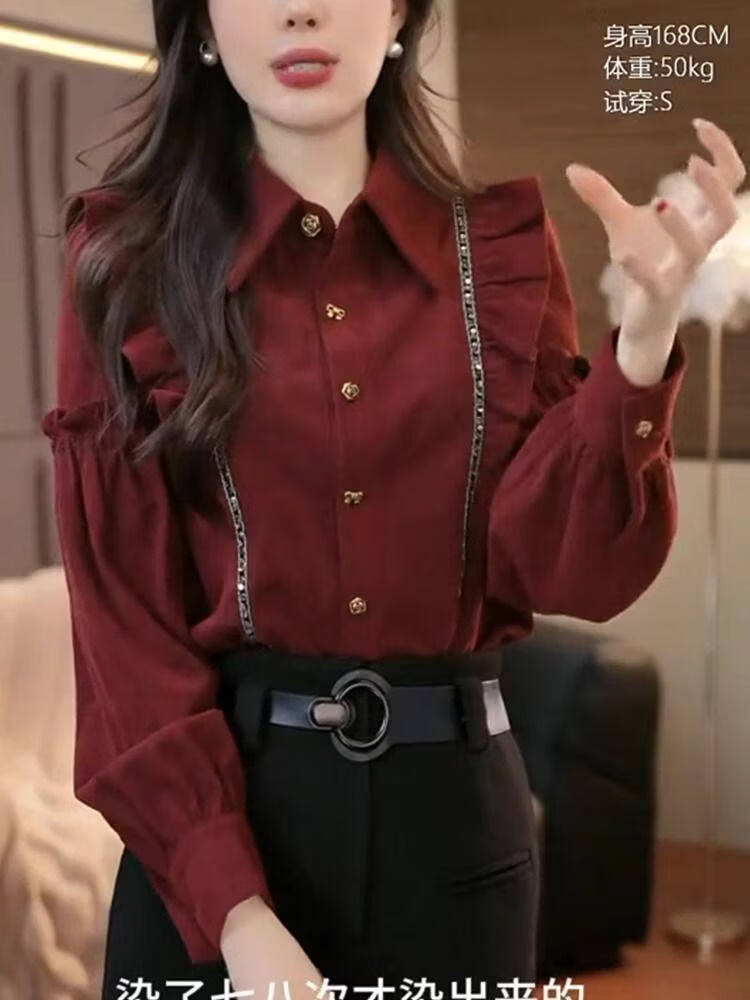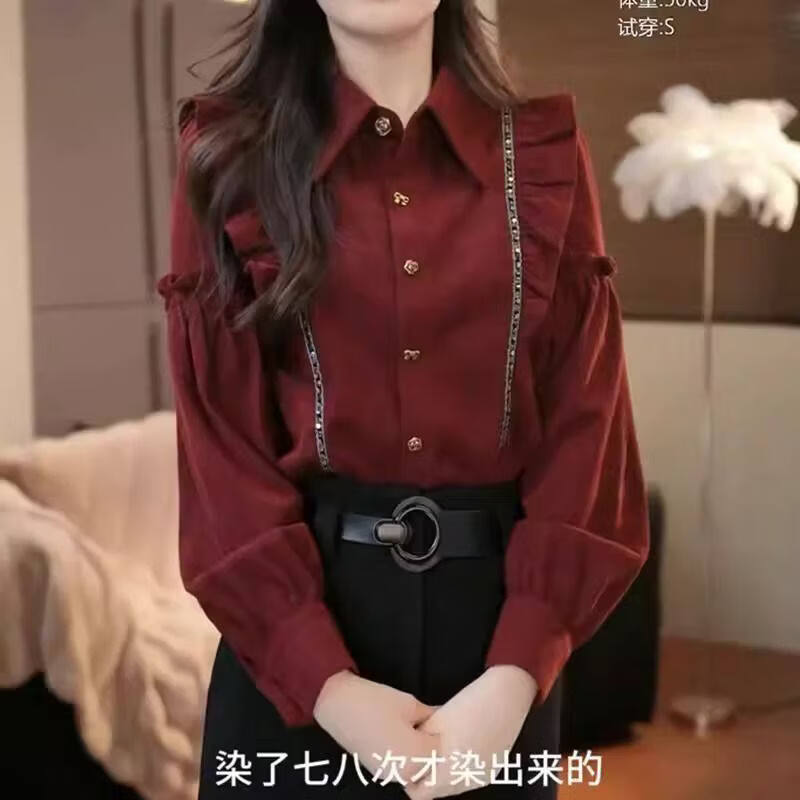 Xia Dian Suding Queen (SE.PSTP) red ruffled lapel shirt for women spring, autumn and winter new niche loose long-sleeved top cardigan shirt for women red M