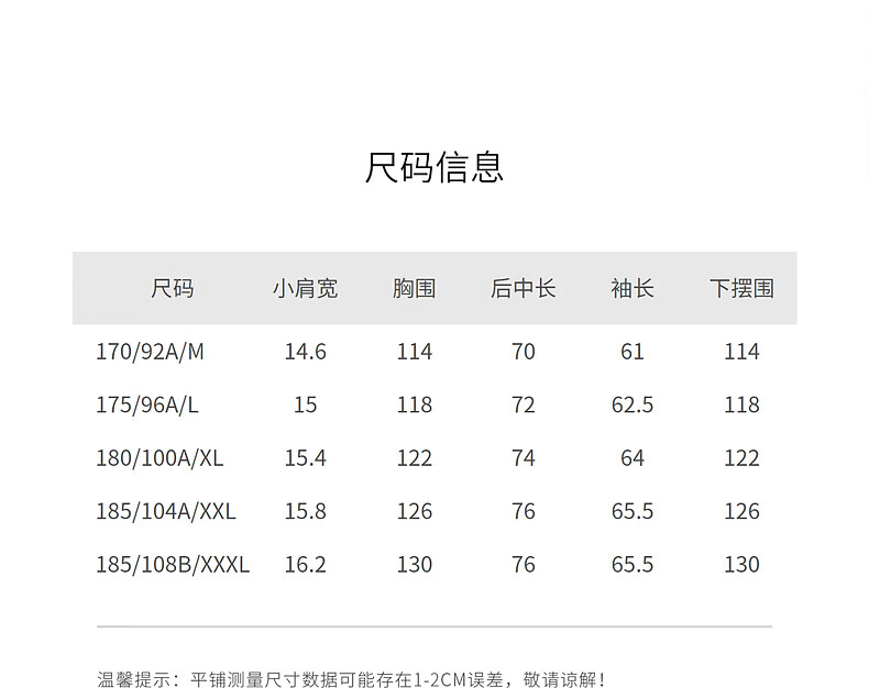 China (cm) 165 / 88-90 170 / 96-98 175 / 108-110 180 / 118-122 185 / 126-130