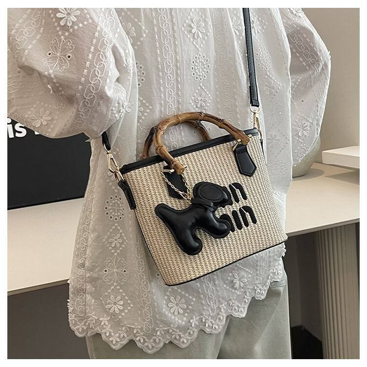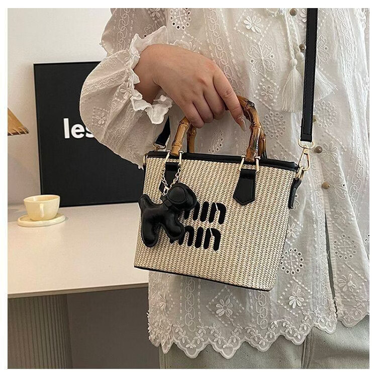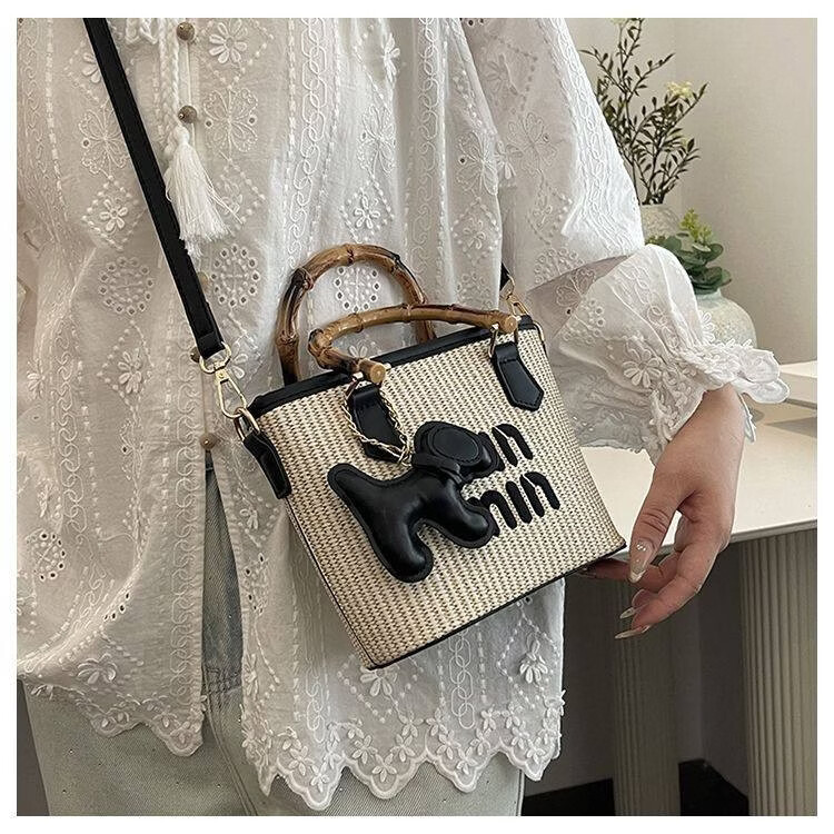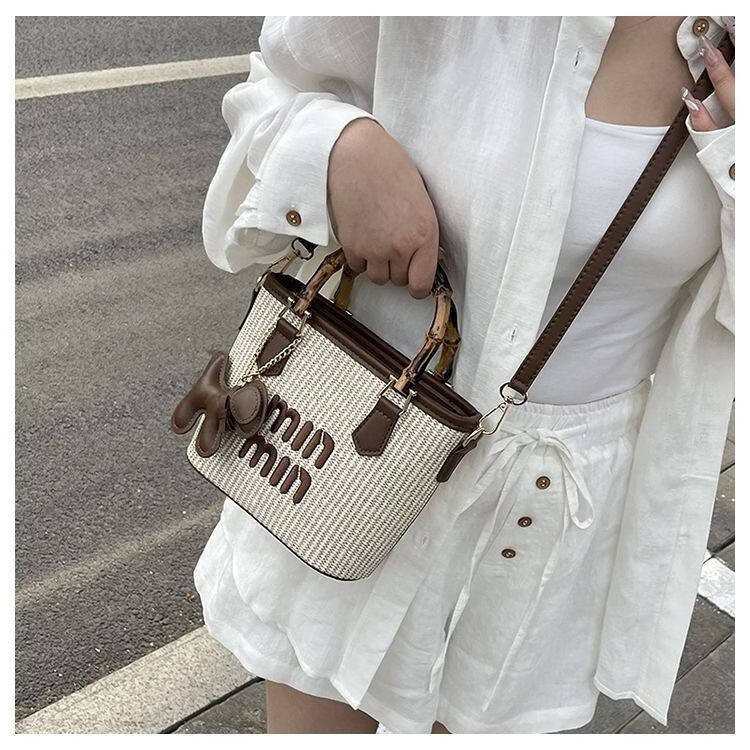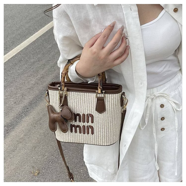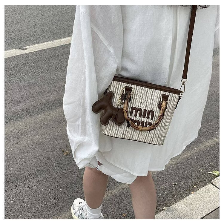 Woodpecker (TUCANO) niche versatile crossbody bag new fashion woven high-value shoulder bag commuting out portable bucket bag white with brown belt leather puppy pendant