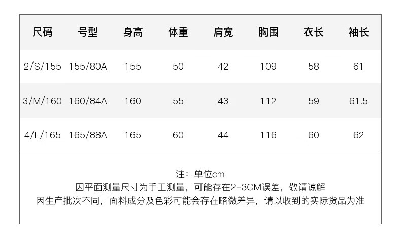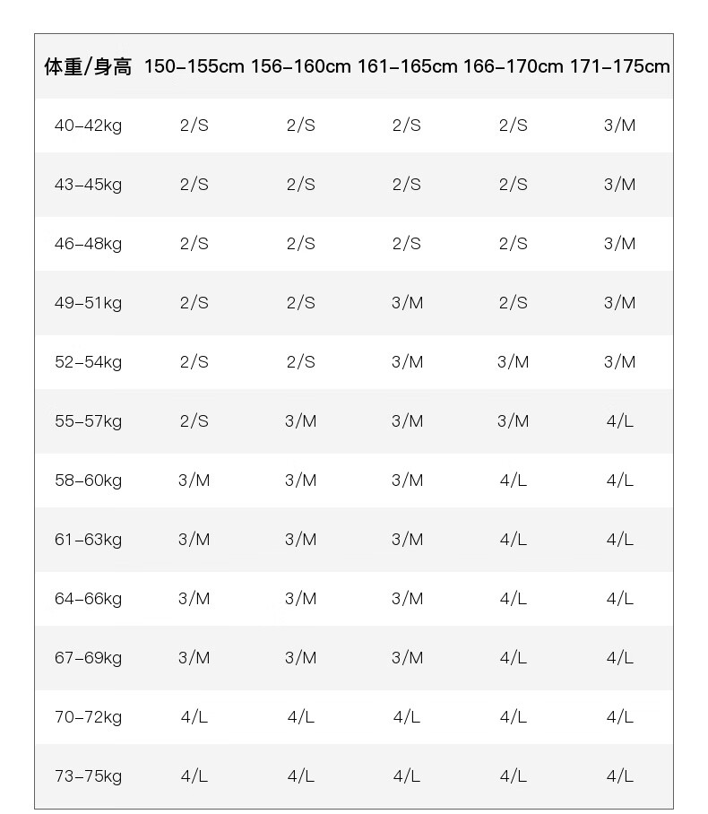 China (cm) 160-165/84-86 165-170 / 88-90 167-172 / 92-96 168-173 / 98-102 170-176 / 106-110