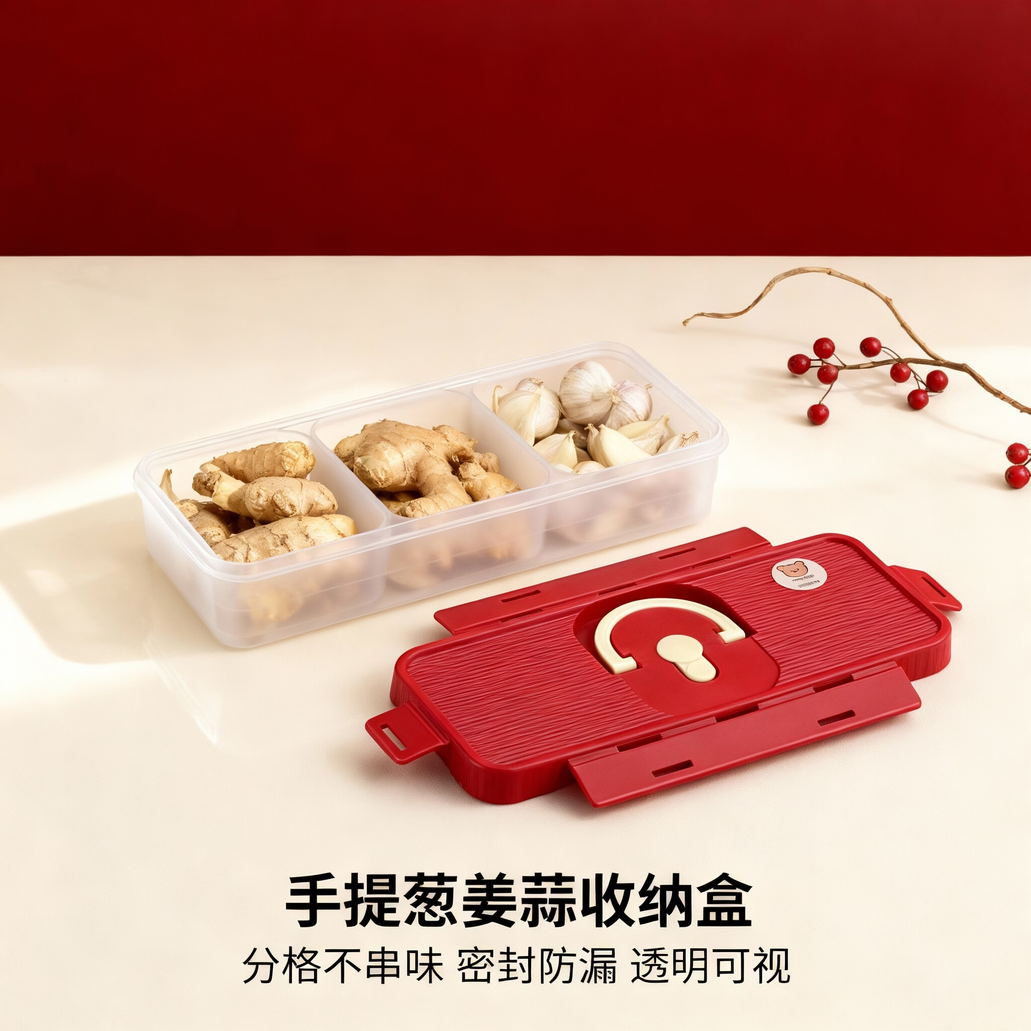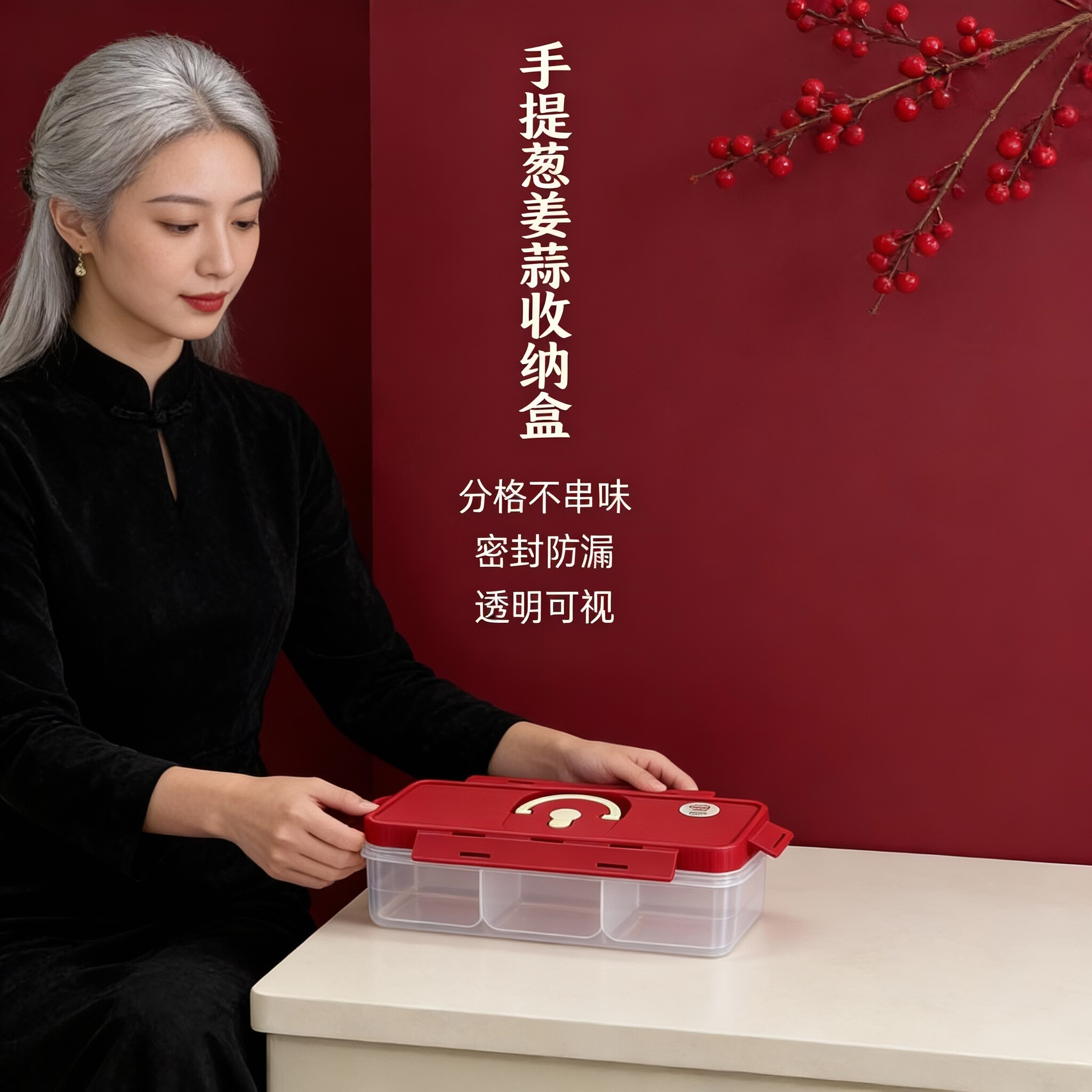WORTHBUY special compartment sealed crisper for onion, ginger and garlic, transparent portable refrigerator, kitchen storage large capacity storage box, cherry red-5500ml, six inner compartments
