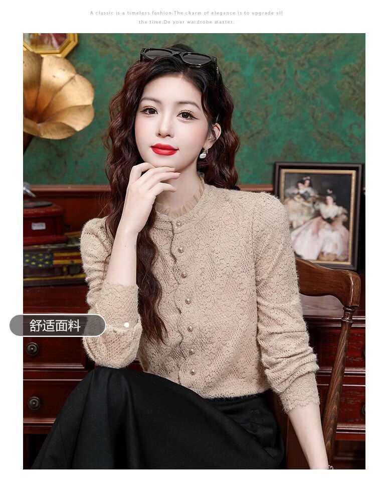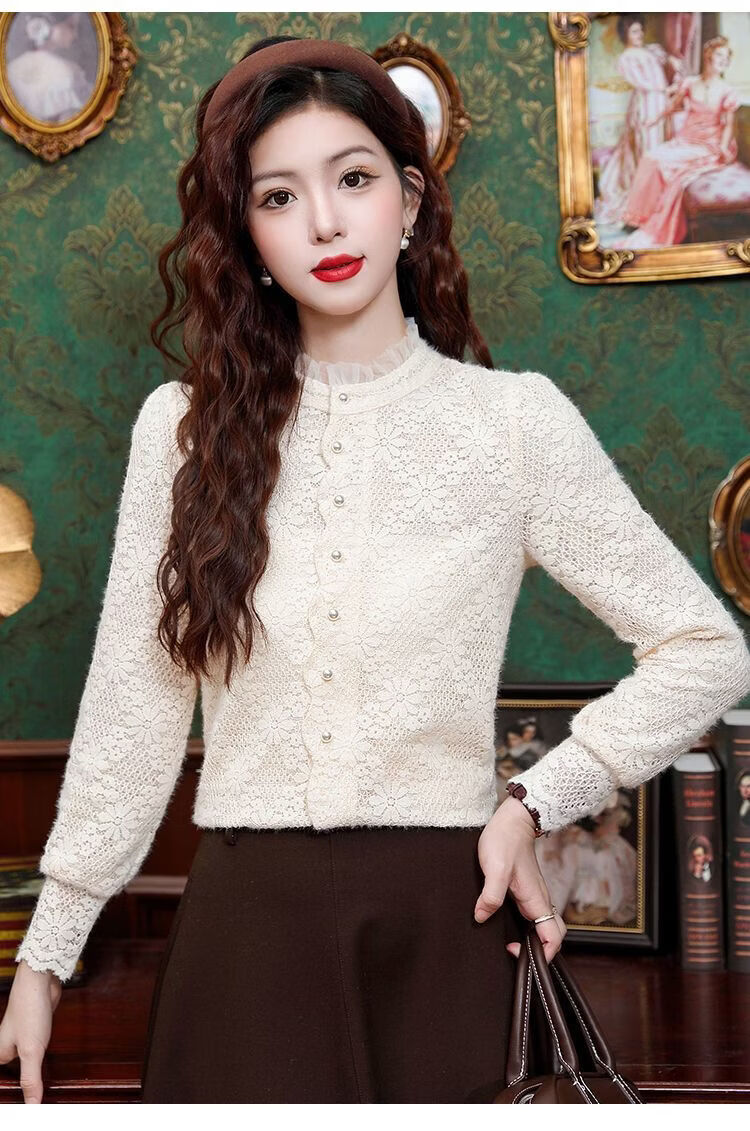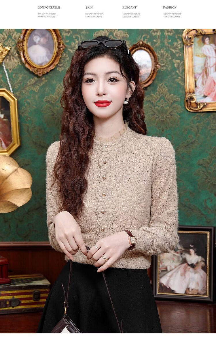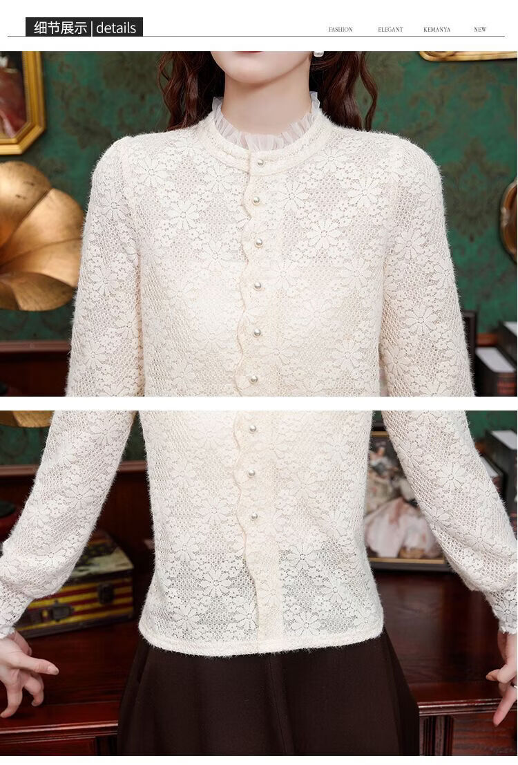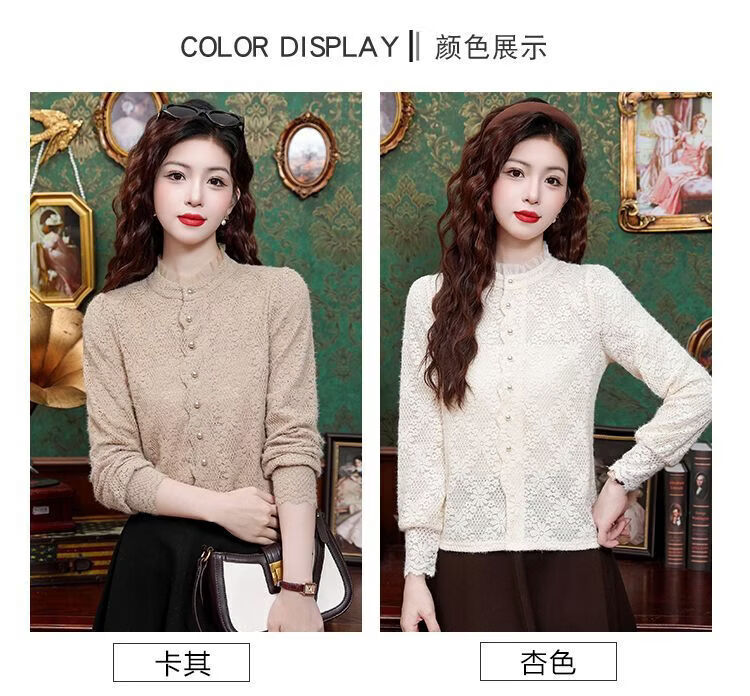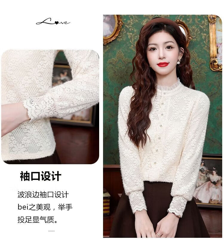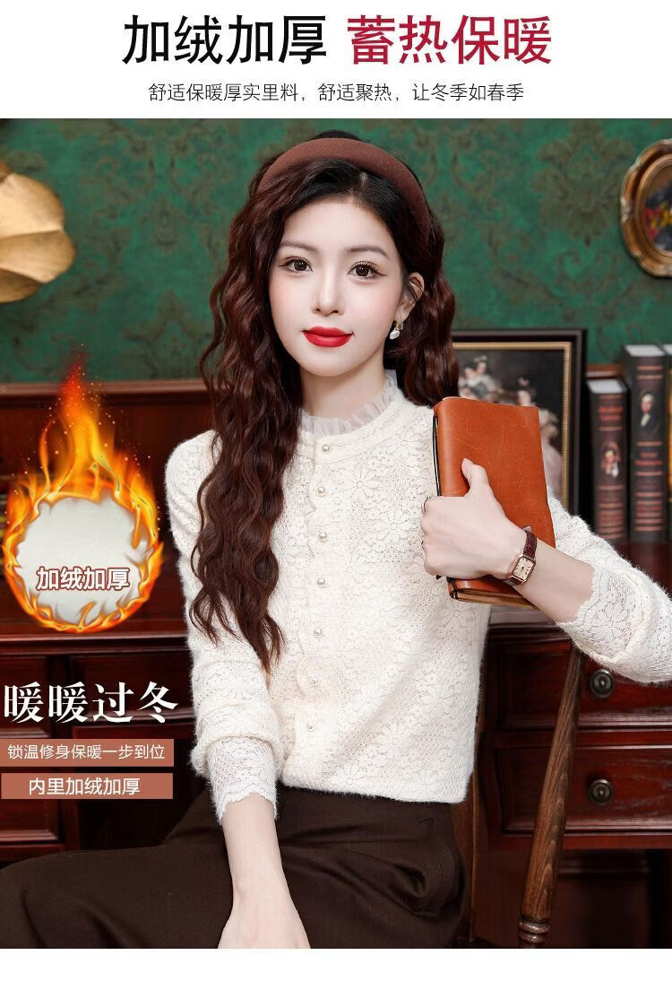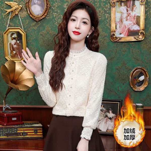 ROMON velvet thickened French lace shirt for women 2026 autumn and winter new style long-sleeved shirt bottoming shirt for women apricot regular style 2XL recommended 128-138Jin Jin equals 0.5 kg