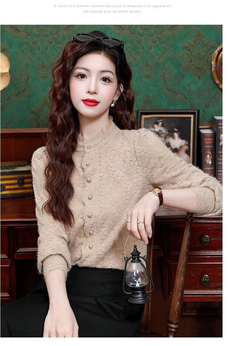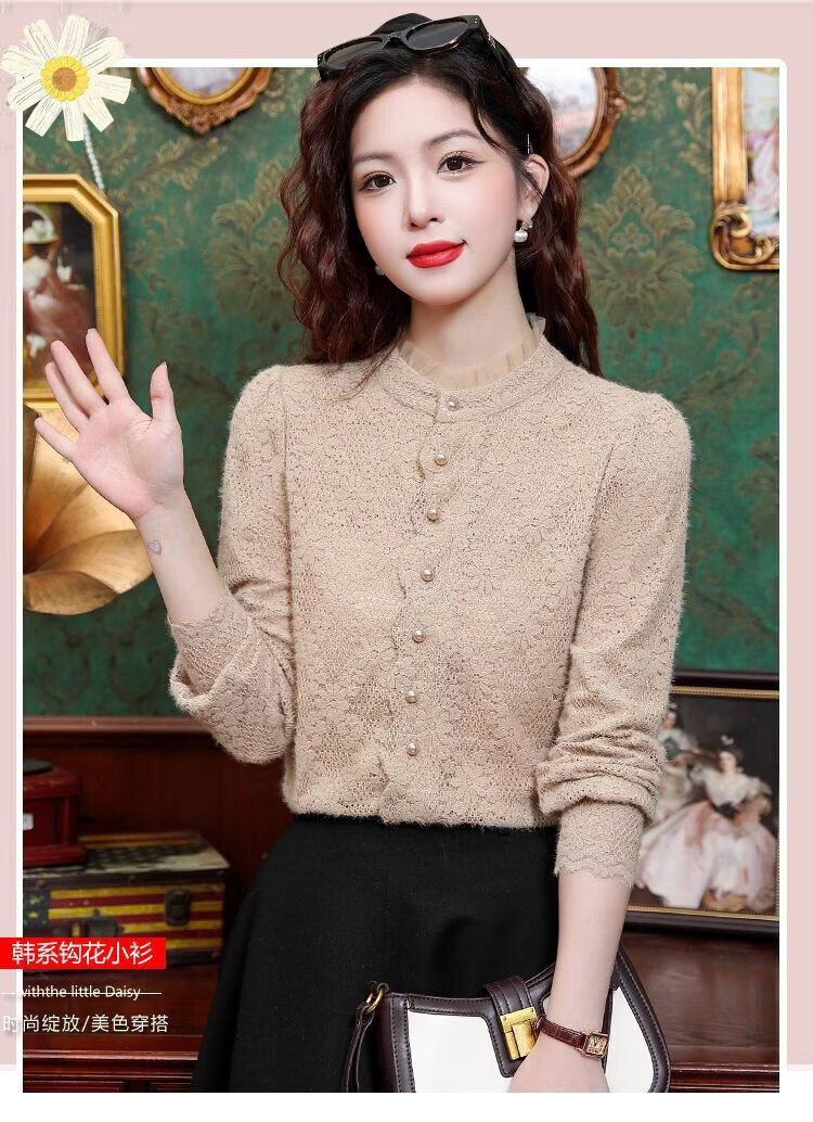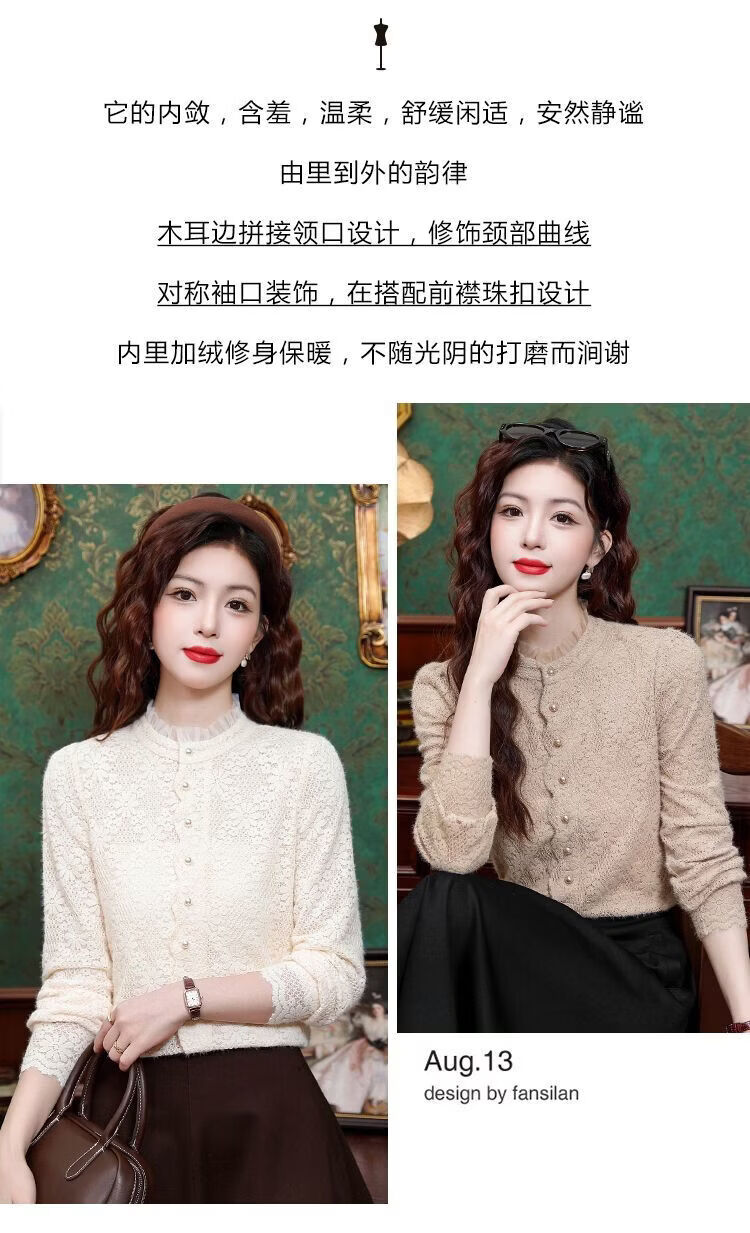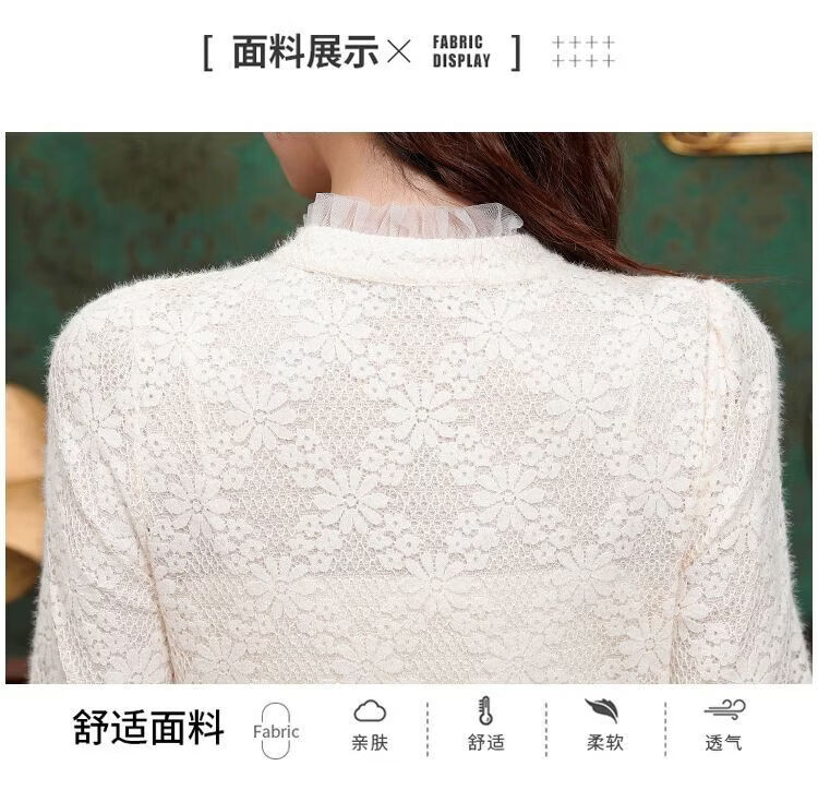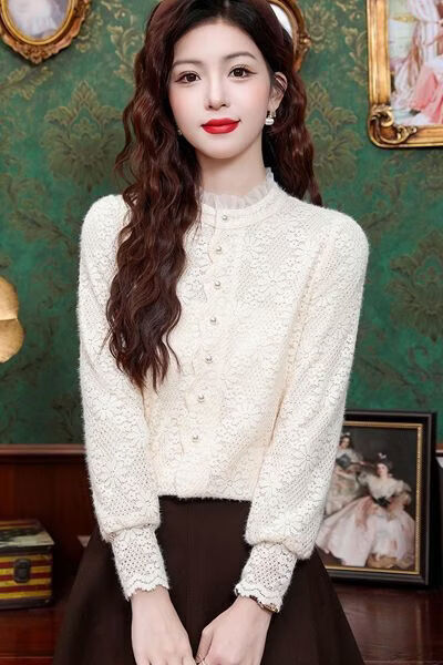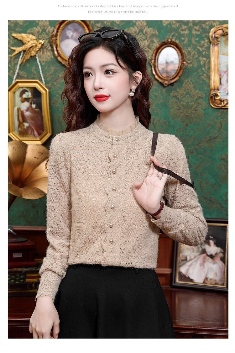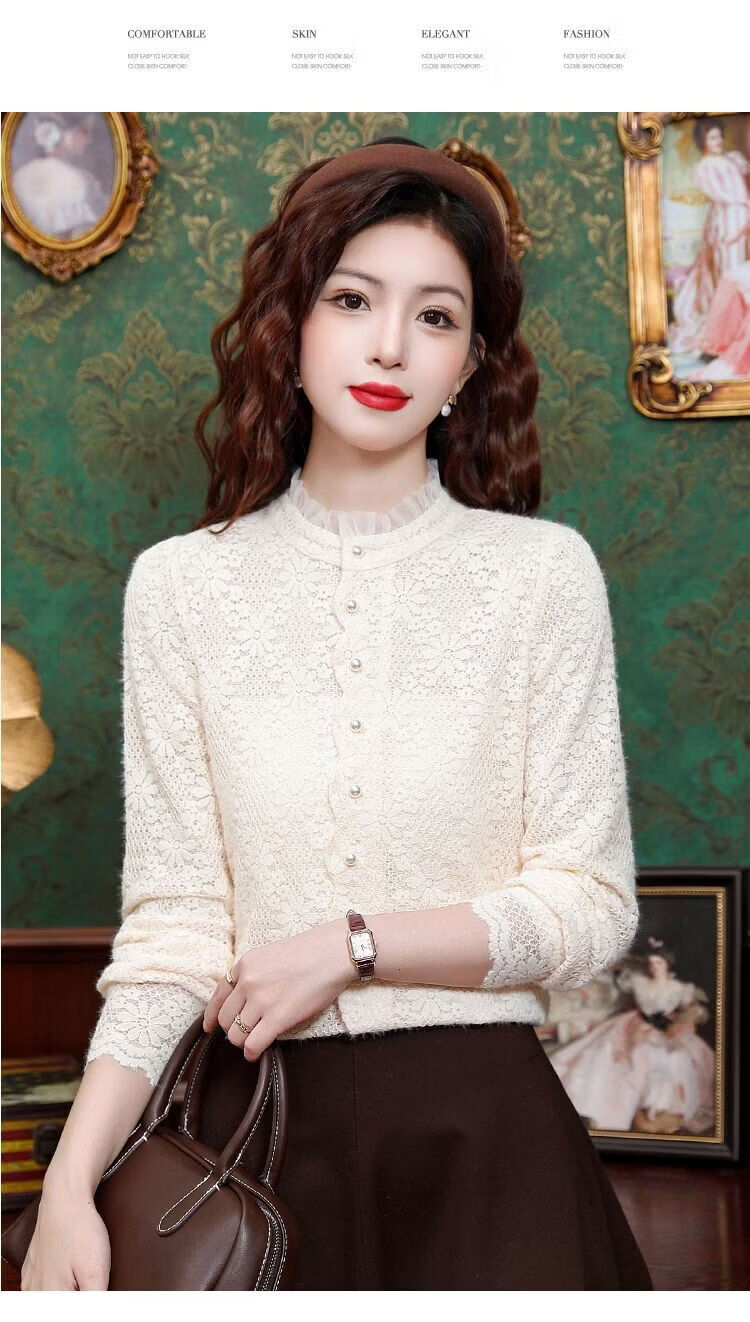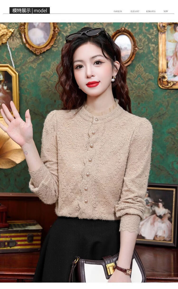ROMON velvet thickened French lace shirt for women 2026 autumn and winter new style long-sleeved shirt bottoming shirt for women apricot regular style 2XL recommended 128-138Jin Jin equals 0.5 kg