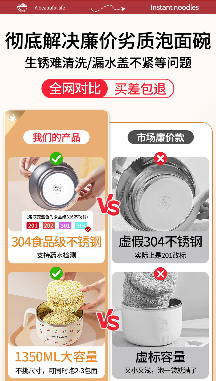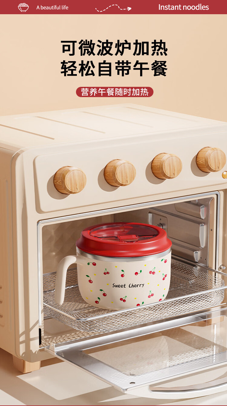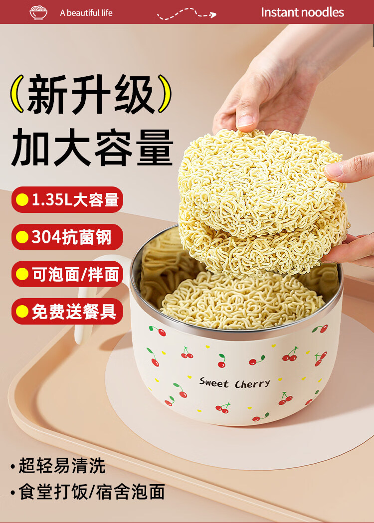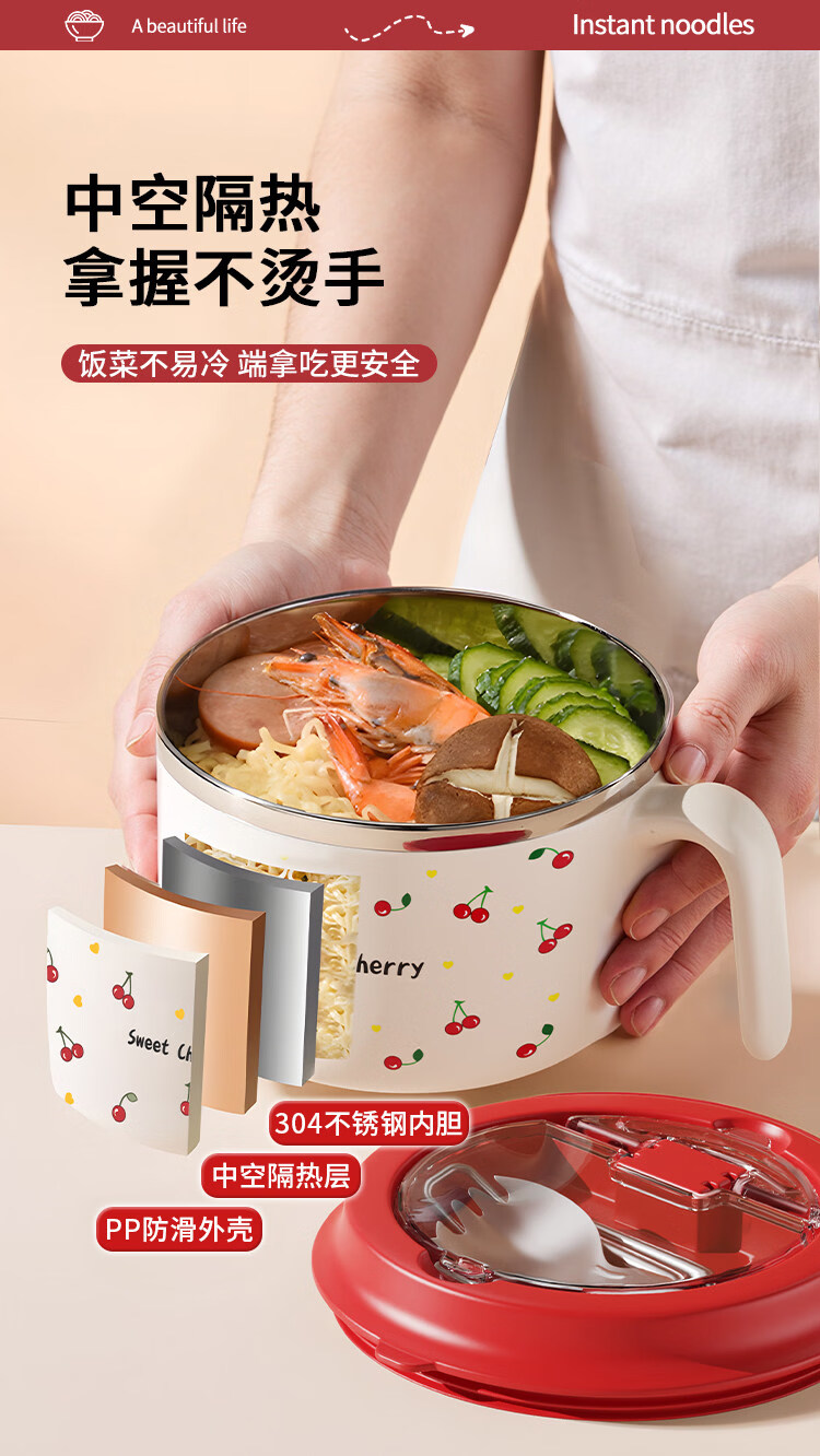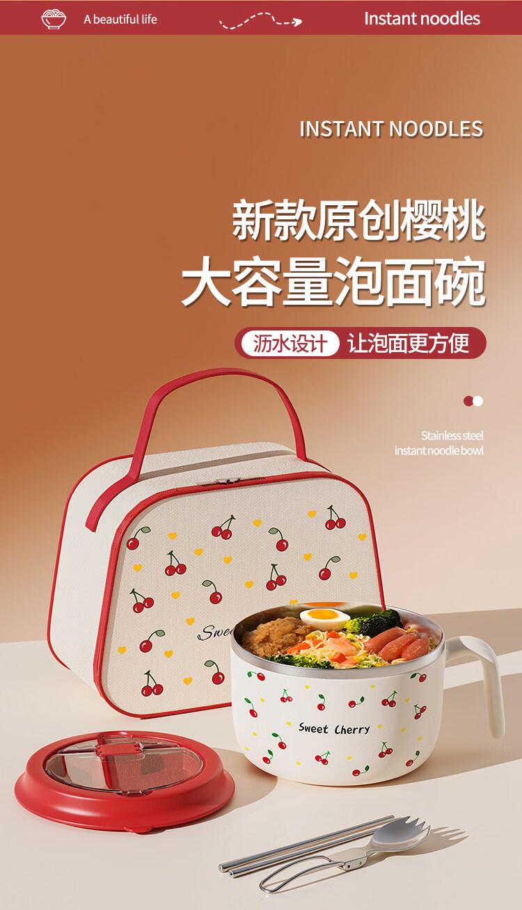 Tuojin stainless steel instant noodle bowl with lid for student dormitory, portable lunch box and chopsticks set for work, 304 steel, Black Cat joint model + tableware 1350ml
