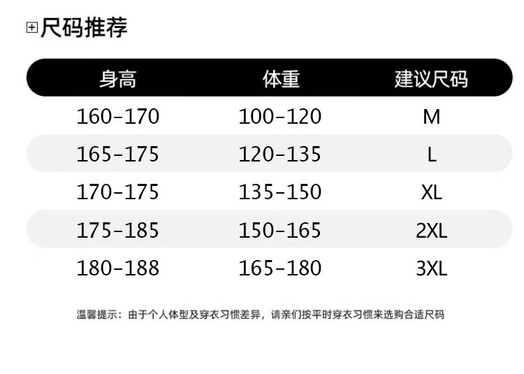China (cm) 165 / 88-90 170 / 96-98 175 / 108-110 180 / 118-122 185 / 126-130