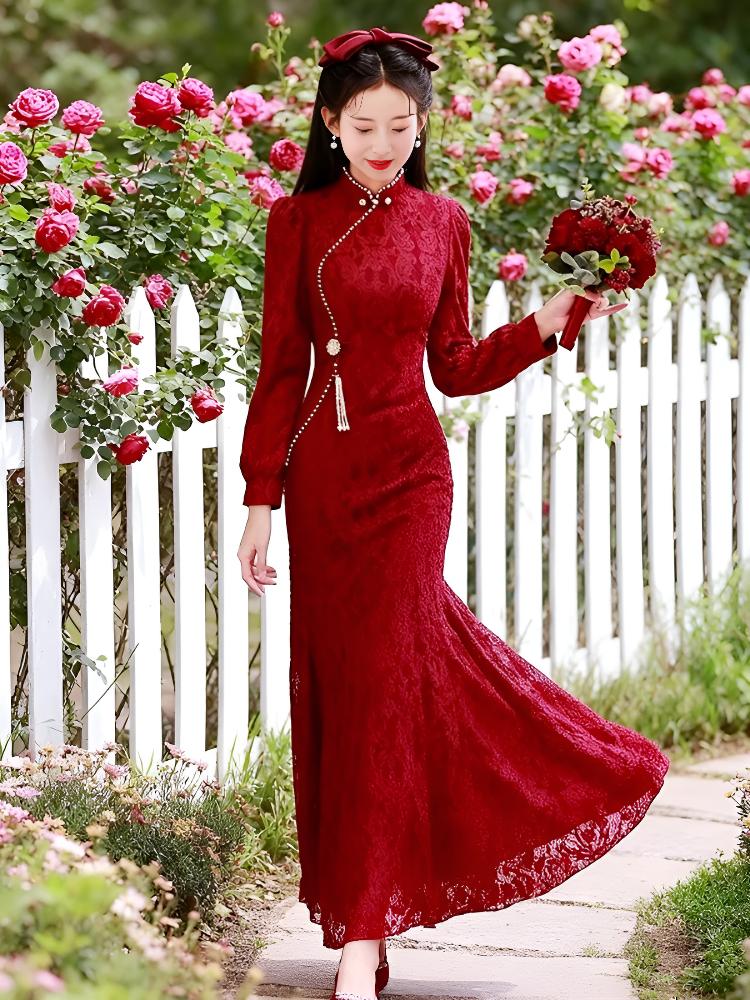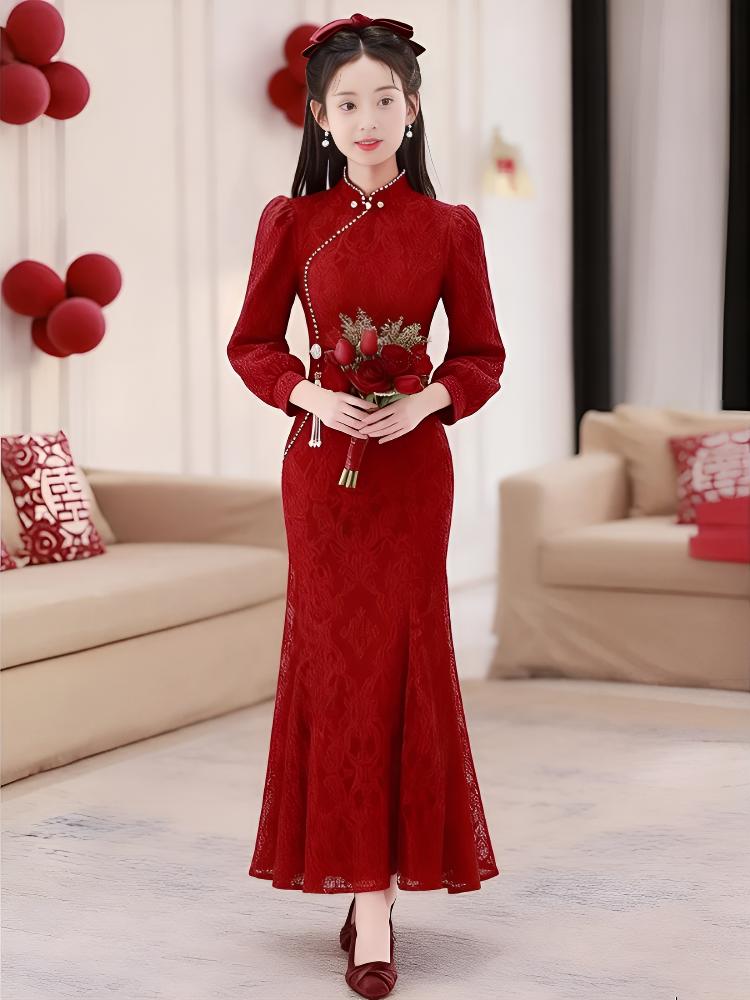 Wei Lianmenglan red fishtail cheongsam toast dress for women winter lace long-sleeved bride wedding engagement high-end atmospheric dress burgundy long-sleeved long S