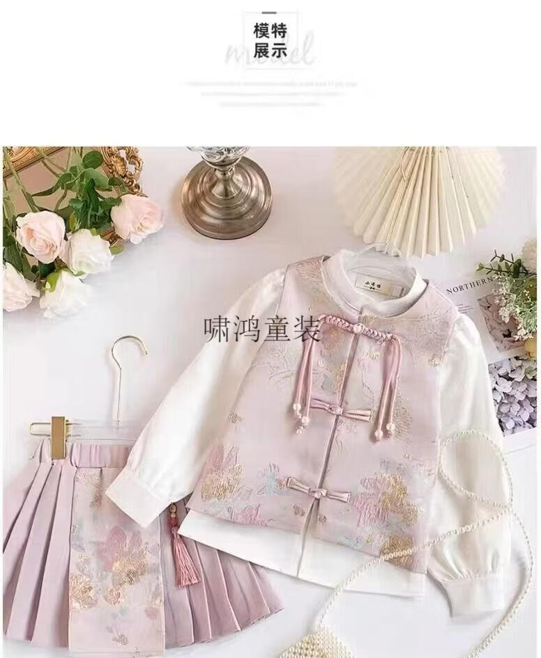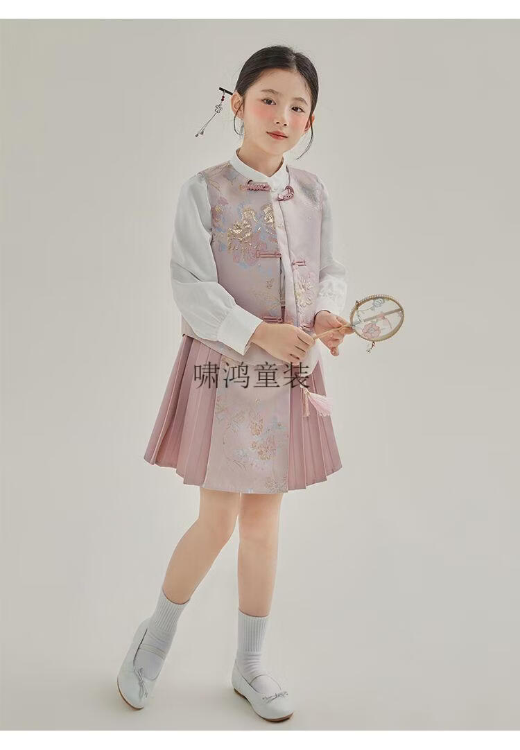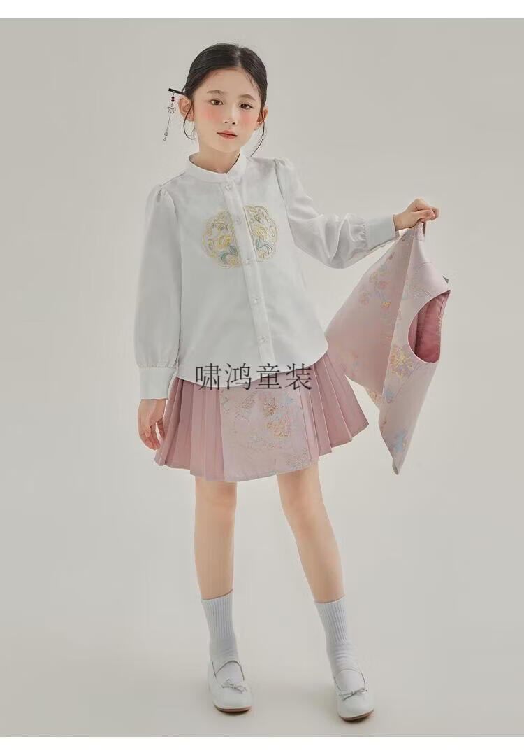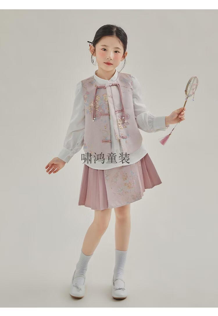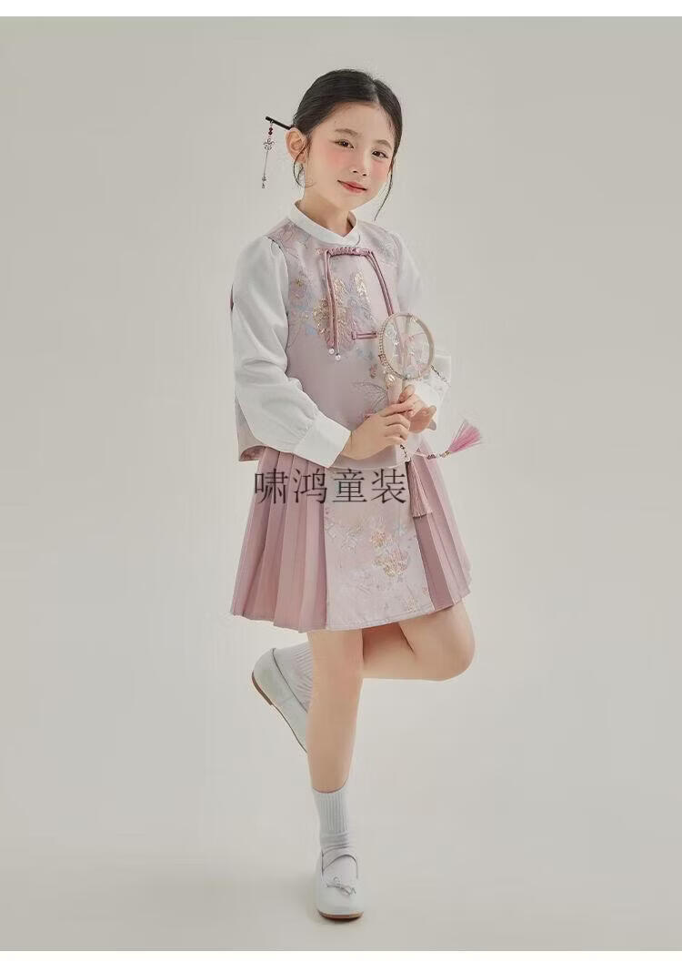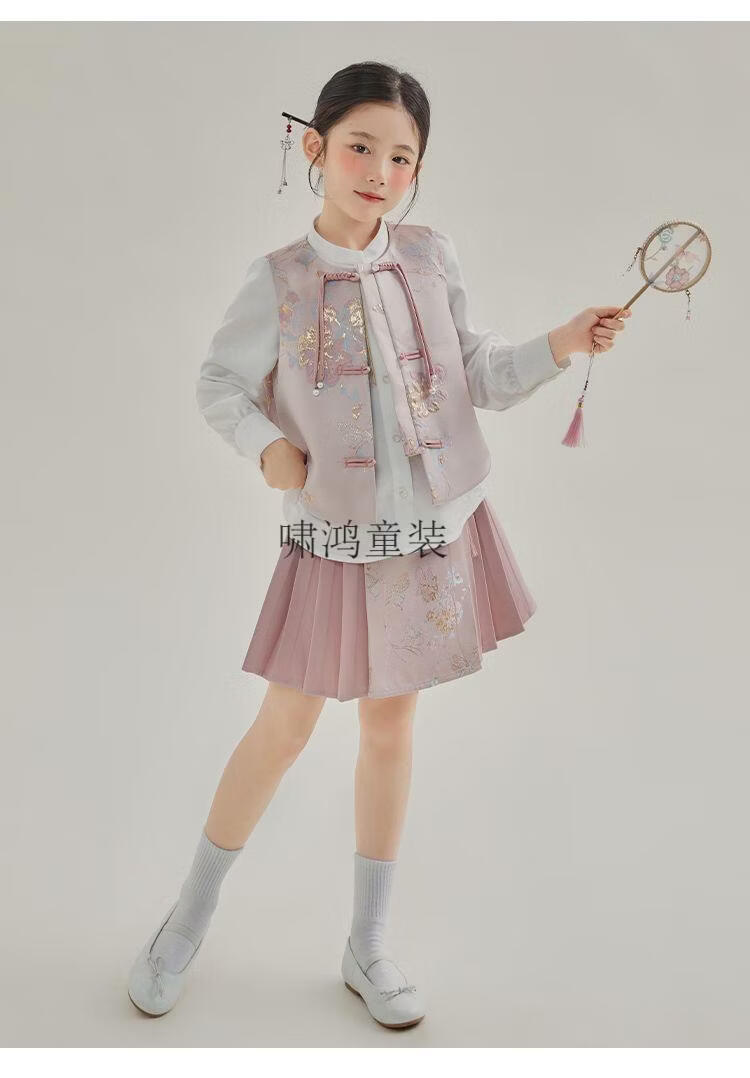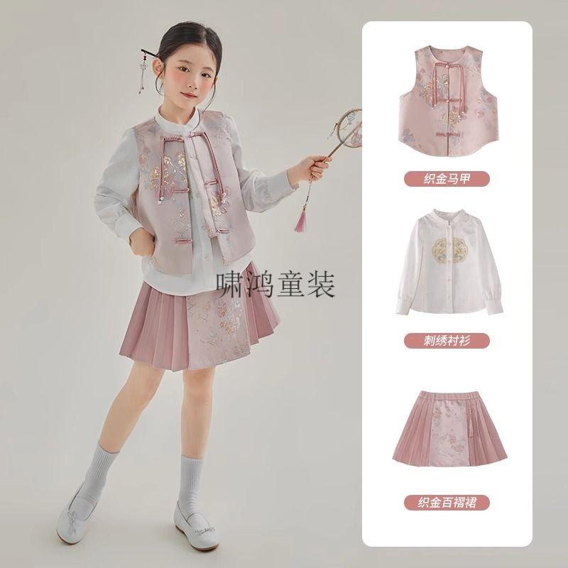 Wooden house girls autumn clothing 2026 new set children's national style long-sleeved autumn jeans three-piece set little girl pleated skirt 02 woven gold three-piece set vest + shirt + skirt 140 yards (height 130-140cm)