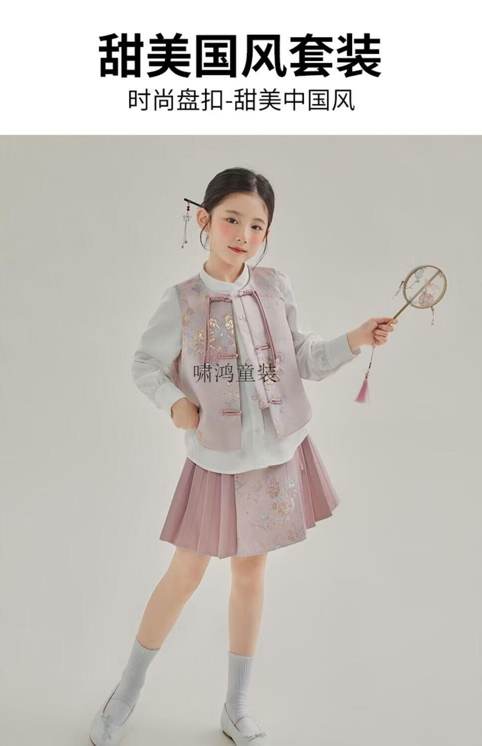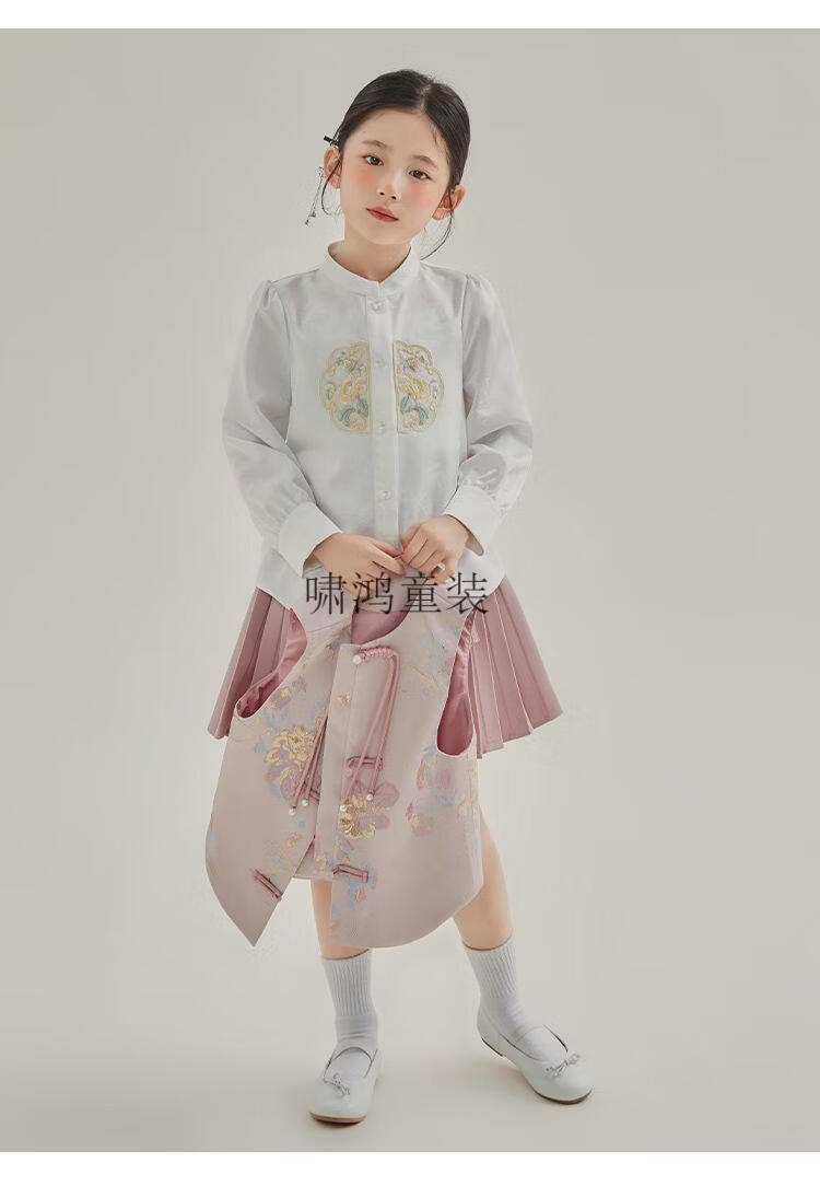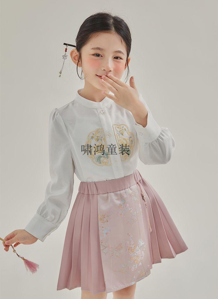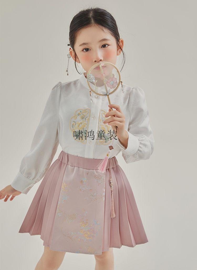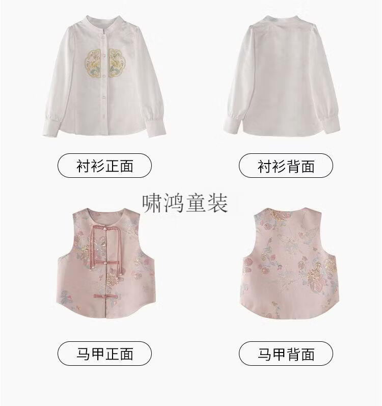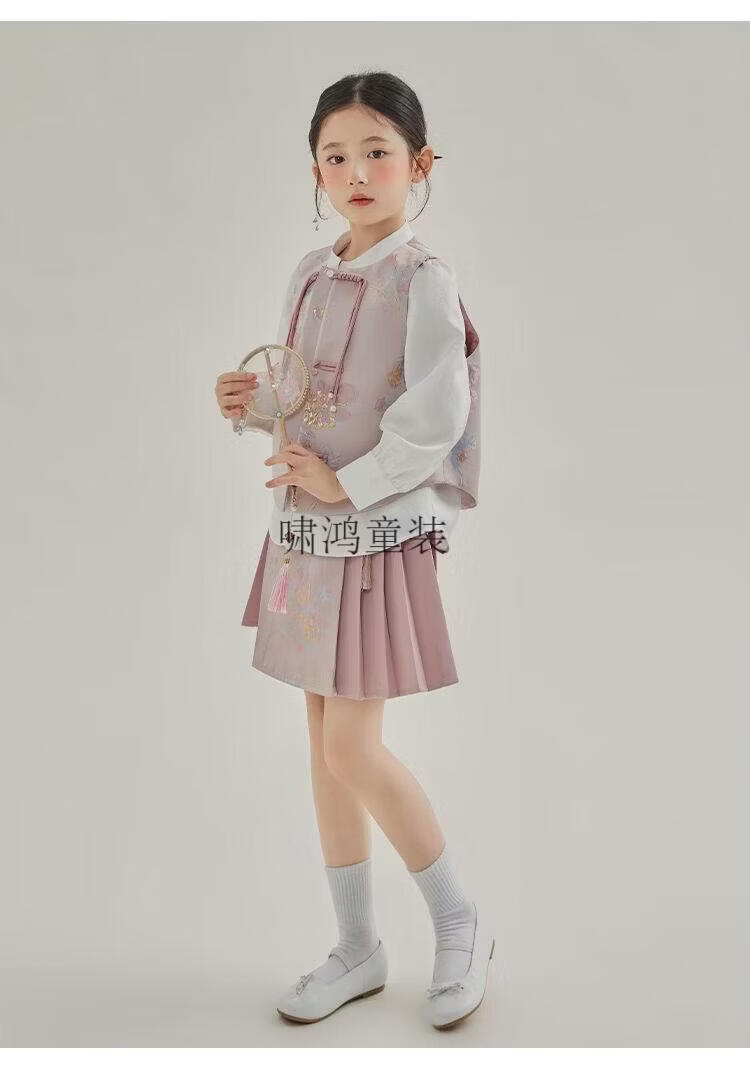 Wooden house girls autumn clothing 2026 new set children's national style long-sleeved autumn jeans three-piece set little girl pleated skirt 02 woven gold three-piece set vest + shirt + skirt 140 yards (height 130-140cm)