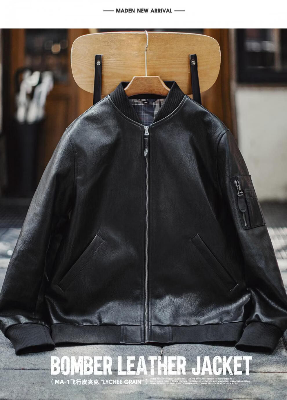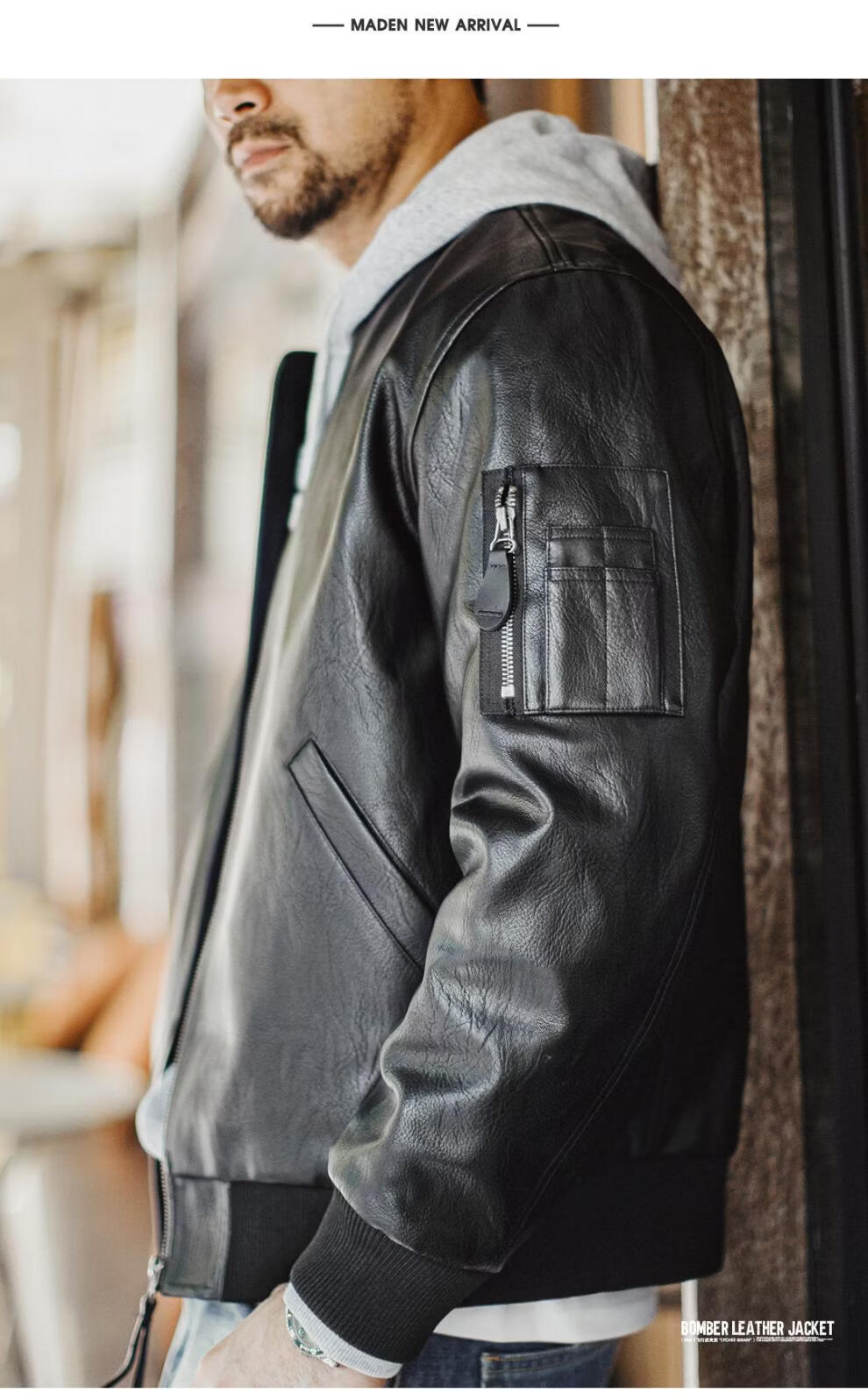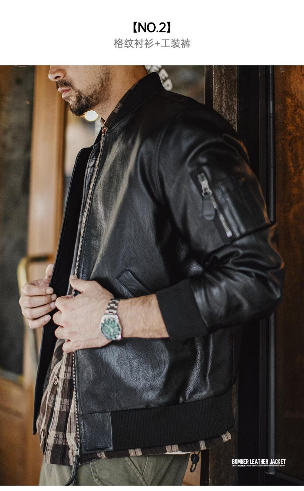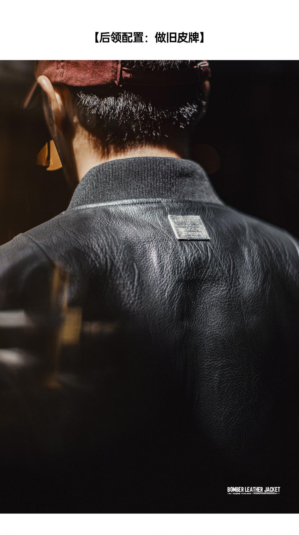 MADEN Workwear American Black MA1 Pilot Leather Jacket Handsome Short Litchi Pattern Short Jacket Men Quiet Black S