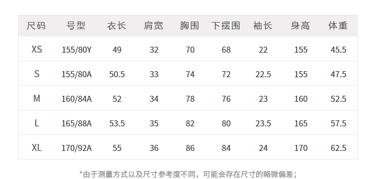 China (cm) 160-165/84-86 165-170 / 88-90 167-172 / 92-96 168-173 / 98-102 170-176 / 106-110